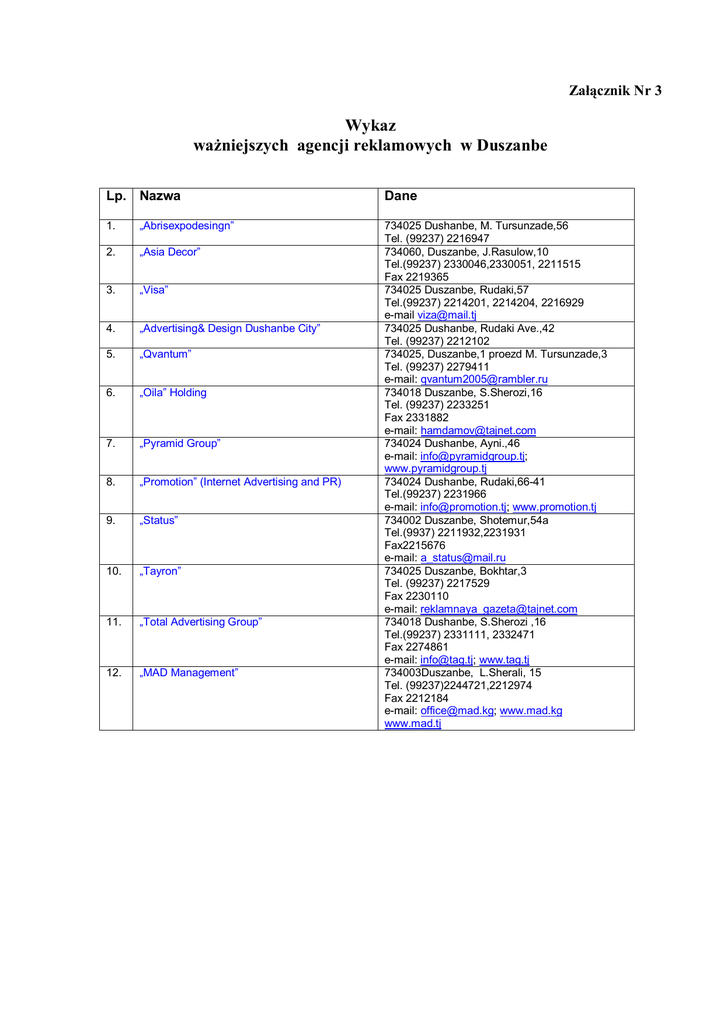 Załącznik Nr 3 Wykaz ważniejszych agencji reklamowych w Duszanbe Lp. Nazwa Dane 1. „Abrisexpodesingn” 2. „Asia Decor” 3. „Visa” 4. „Advertising& Design Dushanbe City” 5. „Qvantum” 6. „Oila” Holding 7. „Pyramid Group” 8. „Promotion” (Internet Advertising and PR) 9. „Status” 10. „Tayron” 11. „Total Advertising Group” 12. „MAD Management” 734025 Dushanbe, M. Tursunzade,56 Tel. (99237) 2216947 734060, Duszanbe, J.Rasulow,10 Tel.(99237) 2330046,2330051, 2211515 Fax 2219365 734025 Duszanbe, Rudaki,57 Tel.(99237) 2214201, 2214204, 2216929 e-mail [email protected] 734025 Dushanbe, Rudaki Ave.,42 Tel. (99237) 2212102 734025, Duszanbe,1 proezd M. Tursunzade,3 Tel. (99237) 2279411 e-mail: [email protected] 734018 Duszanbe, S.Sherozi,16 Tel. (99237) 2233251 Fax 2331882 e-mail: [email protected] 734024 Dushanbe, Ayni.,46 e-mail: [email protected]; www.pyramidgroup.tj 734024 Dushanbe, Rudaki,66-41 Tel.(99237) 2231966 e-mail: [email protected]; www.promotion.tj 734002 Duszanbe, Shotemur,54a Tel.(9937) 2211932,2231931 Fax2215676 e-mail: [email protected] 734025 Duszanbe, Bokhtar,3 Tel. (99237) 2217529 Fax 2230110 e-mail: [email protected] 734018 Dushanbe, S.Sherozi ,16 Tel.(99237) 2331111, 2332471 Fax 2274861 e-mail: [email protected]; www.tag.tj 734003Duszanbe, L.Sherali, 15 Tel. (99237)2244721,2212974 Fax 2212184 e-mail: [email protected]; www.mad.kg www.mad.tj