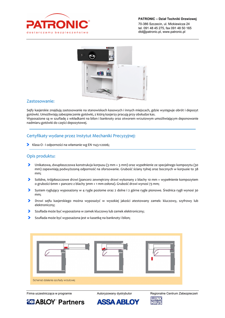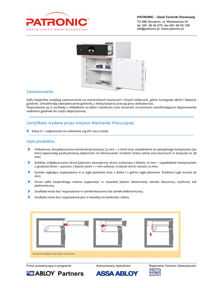 PATRONIC – Dział Techniki Drzwiowej 70-386 Szczecin, ul. Mickiewicza 24 tel. 091 48 45 275, fax 091 48 50 165 [email protected], www.patronic.pl Zastosowanie: Sejfy kasjerskie znajdują zastosowanie na stanowiskach kasowych i innych miejscach, gdzie występuje obrót i depozyt gotówki. Umożliwiają zabezpieczenie gotówki, z którą kasjerzy pracują przy obsłudze kas. Wyposażone są w szufladę z wkładkami na bilon i banknoty oraz otworem wrzutowym umożliwiającym deponowanie nadmiaru gotówki do części depozytowej. Certyfikaty wydane przez Instytut Mechaniki Precyzyjnej: Klasa O - I odporności na włamanie wg EN 1143-1:2006; Opis produktu: Unikatowa, dwupłaszczowa konstrukcja korpusu (3 mm + 3 mm) oraz wypełnienie ze specjalnego kompozytu (30 mm) zapewniają podwyższoną odporność na sforsowanie. Grubość ściany tylnej oraz bocznych w korpusie to 38 mm; Solidne, trójpłaszczowe drzwi (pancerz zewnętrzny drzwi wykonany z blachy 10 mm + wypełnienie kompozytem o grubości 6mm + pancerz z blachy 3mm + 1 mm osłona). Grubość drzwi wynosi 73 mm; System ryglujący wyposażony w 4 rygle poziome oraz 2 dolne i 2 górne rygle pionowe. Średnica rygli wynosi 30 mm; Drzwi sejfu kasjerskiego można wyposażyć w wysokiej jakości atestowany zamek: kluczowy, szyfrowy lub elektroniczny; Szuflada może być wyposażona w zamek kluczowy lub zamek elektroniczny; Szuflada może być wyposażona jest w kasetkę na banknoty i bilon; Firma uczestnicząca w programie Autoryzowany dystrybutor Regionalne Centrum Zabezpieczeń PATRONIC – Dział Techniki Drzwiowej 70-386 Szczecin, ul. Mickiewicza 24 tel. 091 48 45 275, fax 091 48 50 165 [email protected], www.patronic.pl Zabezpieczenie przed przewierceniem i wybiciem rygli (rygle i zamek zabezpieczone płytką antyprzewierceniową ze specjalnego materiału); Od strony zawiasów rygiel stały, który zabezpiecza przed wyjęciem drzwi po wycięciu zawiasów; System zawiasowania wewnętrznego; Kąt otwarcia drzwi 1800; Gwarancja 24 miesiące. Wyposażenie podstawowe: Zamek kluczowy z dwoma kluczami; Półka wewnętrzna; maksymalne obciążenie półki 50 kg; Kotwienie: 2 otwory w dnie sejfu; Kaseta na banknoty i bilon, wym. (WxSxG): 88x358x251 Instrukcja obsługi i użytkowania wyrobu z kartą gwarancyjną. Wyposażenie dodatkowe: Zamiana zamka K na S – dot. tylko drzwi; Zamiana zamka K na E – dot. drzwi i szuflady; Plombowanie; Wyprowadzenie instalacji alarmowej; Kaseta na banknoty, wym. (WxSxG): 81x352x245 2 kotwy mocujące, wym. M16x200; Dopłata za trzeci klucz do zamka kluczowego. Rodzaje zamków: kluczowy szyfrowy elektroniczny Firma uczestnicząca w programie Autoryzowany dystrybutor Regionalne Centrum Zabezpieczeń PATRONIC – Dział Techniki Drzwiowej 70-386 Szczecin, ul. Mickiewicza 24 tel. 091 48 45 275, fax 091 48 50 165 [email protected], www.patronic.pl Standardowe kolory: Jasnoszary RAL 7035 (domyślny przy zamówieniu, jeśli nie zaznaczono koloru); Czarny RAL 9005 (należy zaznaczyć w zamówieniu, bezpłatny). *Na indywidualne zamówienie wszystkie kolory z palety RAL (lakier proszkowy). Dane techniczne: Model Wymiary zewnętrzne urządzenia [mm] LS 62+ Wymiary wewnętrzne części depozytowej [mm] W S G W S G 620 490 430 386 405 306 Waga [kg] Pojemność [l] 100 47,8l Eksploatacja: Użytkowanie wyrobów winno odbywać się w pomieszczeniach zabezpieczonych przed działaniem czynników atmosferycznych z dala od substancji działających korodująco na metale. Wilgotność względna w pomieszczeniu do 75%. Urządzenie może pracować w pomieszczeniach, w których temperatura mieści się w granicach od +5°C do +40°C. Zamykając lub otwierając wyrób należy zwracać uwagę na ruchome elementy np.: szufladę, drzwi. Niewłaściwie eksploatowane mogą doprowadzić do uszkodzenia ciała np.: palców, jeśli zostaną między szufladą a korpusem lub drzwiami a korpusem. Należy zwracać uwagę na położenie rygli podczas zamykania drzwi, rygle bezwzględnie muszą być schowane w przeciwnym przypadku możemy trwale uszkodzić mechanizmy. Zamontowanych zamków i mechanizmów nie wolno przerabiać pod groźbą utraty gwarancji. Montować zamki i mechanizmy w okresie gwarancji może autoryzowany serwis lub użytkownik posiadający pisemne zezwolenie serwisu. W razie konieczności zmiany kluczy zaleca się wymianę całego zamka. Należy zwrócić uwagę na posadowienie sejfu w taki sposób, aby drzwi nie uderzały bezpośrednio o przeszkody. Mechanizmy ryglujące oraz zamki powinny pracować płynnie i bez zacięć, gdy zaistnieje jakiekolwiek zastrzeżenie, co do pracy wymienionych podzespołów należy ten fakt zgłosić do serwisu KONSMETAL. Gdy zaistnieją jakiekolwiek zastrzeżenia, co do dostarczonego wyrobu należy zgłaszać je do serwisu KONSMETAL. Nie zaleca się dokonywania przeróbek bez wiedzy producenta nawet po zakończeniu okresu gwarancji. Firma uczestnicząca w programie Autoryzowany dystrybutor Regionalne Centrum Zabezpieczeń PATRONIC – Dział Techniki Drzwiowej 70-386 Szczecin, ul. Mickiewicza 24 tel. 091 48 45 275, fax 091 48 50 165 [email protected], www.patronic.pl Konserwacja: Drzwi: Zaleca się przesmarowanie zawias w miarę potrzeb, nie rzadziej jednak jak raz na trzy lata smarem do łożysk, wszystkie łączenia i pary cierne mechanizmów smarować bezkwasową wazeliną techniczną raz na trzy lata. Korpus: Zasadniczo korpus nie wymaga szczególnych zabiegów konserwacyjnych. Podstawową czynnością konserwacyjną jest czyszczenie obudowy korpusu. Do tego celu należy posłużyć się miękką szmatką zwilżoną łagodnym detergentem, a następnie przetrzeć oczyszczoną powierzchnię na sucho. Firma uczestnicząca w programie Autoryzowany dystrybutor Regionalne Centrum Zabezpieczeń