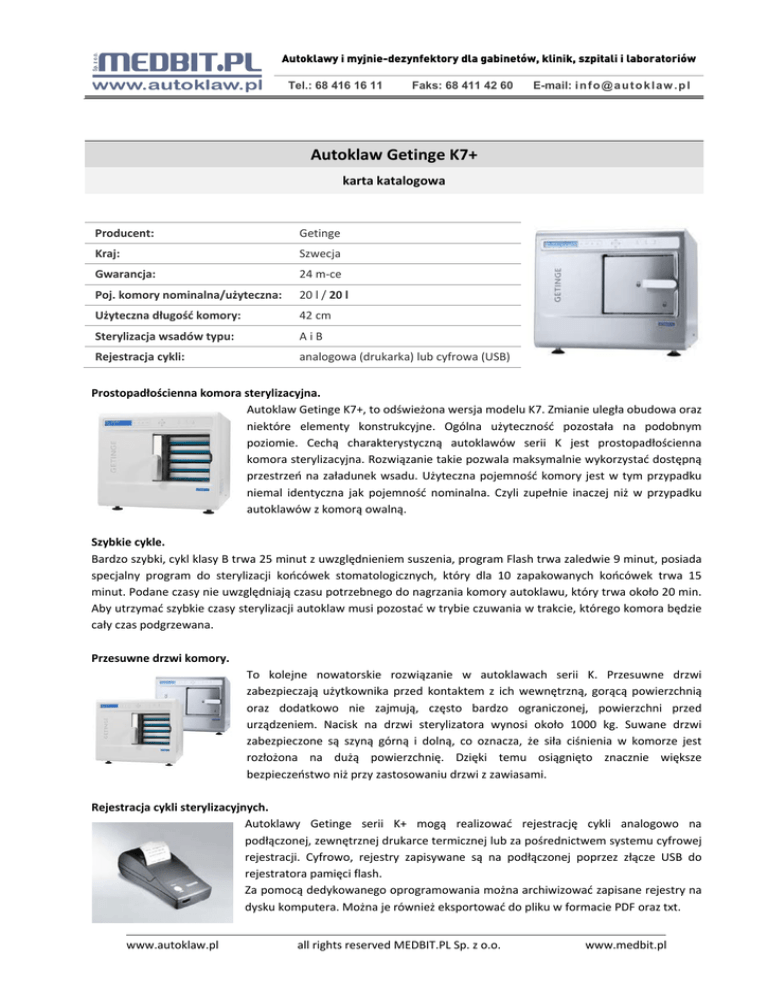 Autoklawy i myjnie-dezynfektory dla gabinetów, klinik, szpitali i laboratoriów Tel.: 68 416 16 11 Faks: 68 411 42 60 E-mail: i n f o @ a u t o k l aw . p l Autoklaw Getinge K7+ karta katalogowa Producent: Getinge Kraj: Szwecja Gwarancja: 24 m-ce Poj. komory nominalna/użyteczna: 20 l / 20 l Użyteczna długość komory: 42 cm Sterylizacja wsadów typu: AiB Rejestracja cykli: analogowa (drukarka) lub cyfrowa (USB) Prostopadłościenna komora sterylizacyjna. Autoklaw Getinge K7+, to odświeżona wersja modelu K7. Zmianie uległa obudowa oraz niektóre elementy konstrukcyjne. Ogólna użyteczność pozostała na podobnym poziomie. Cechą charakterystyczną autoklawów serii K jest prostopadłościenna komora sterylizacyjna. Rozwiązanie takie pozwala maksymalnie wykorzystać dostępną przestrzeń na załadunek wsadu. Użyteczna pojemność komory jest w tym przypadku niemal identyczna jak pojemność nominalna. Czyli zupełnie inaczej niż w przypadku autoklawów z komorą owalną. Szybkie cykle. Bardzo szybki, cykl klasy B trwa 25 minut z uwzględnieniem suszenia, program Flash trwa zaledwie 9 minut, posiada specjalny program do sterylizacji końcówek stomatologicznych, który dla 10 zapakowanych końcówek trwa 15 minut. Podane czasy nie uwzględniają czasu potrzebnego do nagrzania komory autoklawu, który trwa około 20 min. Aby utrzymać szybkie czasy sterylizacji autoklaw musi pozostać w trybie czuwania w trakcie, którego komora będzie cały czas podgrzewana. Przesuwne drzwi komory. To kolejne nowatorskie rozwiązanie w autoklawach serii K. Przesuwne drzwi zabezpieczają użytkownika przed kontaktem z ich wewnętrzną, gorącą powierzchnią oraz dodatkowo nie zajmują, często bardzo ograniczonej, powierzchni przed urządzeniem. Nacisk na drzwi sterylizatora wynosi około 1000 kg. Suwane drzwi zabezpieczone są szyną górną i dolną, co oznacza, że siła ciśnienia w komorze jest rozłożona na dużą powierzchnię. Dzięki temu osiągnięto znacznie większe bezpieczeństwo niż przy zastosowaniu drzwi z zawiasami. Rejestracja cykli sterylizacyjnych. Autoklawy Getinge serii K+ mogą realizować rejestrację cykli analogowo na podłączonej, zewnętrznej drukarce termicznej lub za pośrednictwem systemu cyfrowej rejestracji. Cyfrowo, rejestry zapisywane są na podłączonej poprzez złącze USB do rejestratora pamięci flash. Za pomocą dedykowanego oprogramowania można archiwizować zapisane rejestry na dysku komputera. Można je również eksportować do pliku w formacie PDF oraz txt. www.autoklaw.pl all rights reserved MEDBIT.PL Sp. z o.o. www.medbit.pl Autoklawy i myjnie-dezynfektory dla gabinetów, klinik, szpitali i laboratoriów Tel.: 68 416 16 11 Faks: 68 411 42 60 E-mail: i n f o @ a u t o k l aw . p l Programy sterylizacyjne. • cykl klasy B, instrumenty w pakietach, 134°C, czas procesu ~25 min • cykl klasy B, instrumenty w pakietach, 121°C, czas procesu ~39 min • cykl klasy B, materiały tekstylne, 134°C, czas procesu ~29 min • program błyskawiczny, 134°C, czas procesu ~9 min • program Dental special, 134°C, czas procesu dla 10 opakowanych końcówek ~15 min • cykl klasy B, priony, 134°C, czas procesu ~38 min • programy testowe: Bowie & Dick, test szczelności • programy opcjonalne: definiowane przez użytkownika, program do sterylizacji płynów Zasilanie w wodę. Autoklawy serii K+ wyposażone są w jeden wewnętrzny zbiornik na wodę destylowaną o pojemności 5 litrów. Woda, ta jest wielokrotnie wykorzystywana w kolejnych cyklach sterylizacyjnych. Zalecana jest jej wymiana po około 10 cyklach. Autoklaw może być również podłączony bezpośrednio do sieci wodociągowej poprzez demineralizator. Skropliny również mogą być odprowadzane bezpośrednio do kanalizacji. Przy takim podłączeniu autoklaw pracuje w trybie automatycznego poboru wody i spustu skroplin. Wyposażenie standardowe. • 5 tacek • stelaż na tacki • uchwyt do tacek • instrukcja w j. polskim Zalecane akcesoria: • zewnętrzna drukarka termiczna Martel • zewnętrzny rejestrator USB do archiwizacji procesu • demineralizator Zalety. Autoklawy serii Getinge K+, to skuteczne rozwiązanie w zakresie sterylizacji parowej w gabinetach lekarskich i klinikach. Oferują szybkie i uniwersalne cykle sterylizacyjne, a dwa unikalne rozwiązania w postaci prostopadłościennej komory sterylizacyjnej oraz przesuwne drzwi, to cechy charakterystyczne. Pojemność użyteczna komory w autoklawach serii K+ jest niemal taka sama jak pojemność nominalna. Możemy zatem wykorzystać niemal cała komorę do załadunku wsadu. Zupełnie inaczej niż ma, to miejsce w autoklawach z owalną komorą, w których 18 litrów pojemności nominalnej daje tylko około 8 litrów pojemności użytkowej. Przesuwne drzwi chronią użytkownika przed oparzeniami, są bardzo łatwe w obsłudze oraz nie wymagają wygospodarowania dodatkowego miejsca w pomieszczeniu, w którym stoi autoklaw. Wady. Do głównych wad autoklawów serii K+ możemy zaliczyć konieczność długiego, wstępnego rozgrzewania komory sterylizacyjnej. Przy pierwszym cyklu dnia gotowość autoklawu wydłuża się o 20-30 min. Aby skorzystać z niewątpliwie szybkich cykli sterylizacyjnych komora autoklawu musi być cały czas podgrzewana. Dla użytkowników wykonujących 5-8 cykli dziennie nie jest, to problemem, ale przy 2-3 dziennie jest, to poważną wadą. www.autoklaw.pl all rights reserved MEDBIT.PL Sp. z o.o. www.medbit.pl Autoklawy i myjnie-dezynfektory dla gabinetów, klinik, szpitali i laboratoriów Tel.: 68 416 16 11 Faks: 68 411 42 60 E-mail: i n f o @ a u t o k l aw . p l Dane techniczne: Producent: Getinge Kraj: Szwecja Normy: PN:EN 13060:2005 Zgłoszenie do UDT: tak Gwarancja: 24 miesięcy Język obsługi: polski Rejestracja cykli: drukarka zewnętrzna lub USB Cykl dla opak. 134 Co + suszenie: 25 min (+20 min rozgrzanie komory) Cykl dla opak. 121Co + suszenie: 39 min (+20 min rozgrzanie komory) Cykl szybki dla