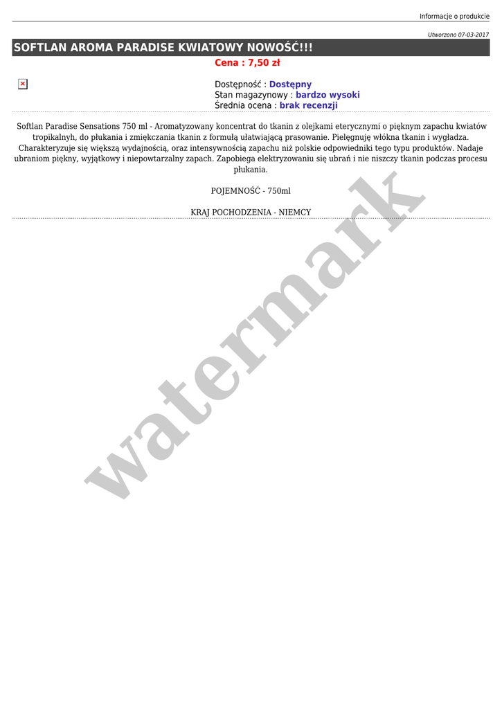 Informacje o produkcie Utworzono 07-03-2017 SOFTLAN AROMA PARADISE KWIATOWY NOWOŚĆ!!! Cena : 7,50 zł Dostępność : Dostępny Stan magazynowy : bardzo wysoki Średnia ocena : brak recenzji Softlan Paradise Sensations 750 ml - Aromatyzowany koncentrat do tkanin z olejkami eterycznymi o pięknym zapachu kwiatów tropikalnyh, do płukania i zmiękczania tkanin z formułą ułatwiającą prasowanie. Pielęgnuję włókna tkanin i wygładza. Charakteryzuje się większą wydajnością, oraz intensywnością zapachu niż polskie odpowiedniki tego typu produktów. Nadaje ubraniom piękny, wyjątkowy i niepowtarzalny zapach. Zapobiega elektryzowaniu się ubrań i nie niszczy tkanin podczas procesu płukania. er m ar k POJEMNOŚĆ - 750ml w at KRAJ POCHODZENIA - NIEMCY