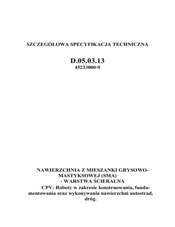 SZCZEGÓŁOWA SPECYFIKACJA TECHNICZNA D.05.03.13 45233000-9 NAWIERZCHNIA Z MIESZANKI GRYSOWOMASTYKSOWEJ (SMA) - WARSTWA ŚCIERALNA CPV: Roboty w zakresie konstruowania, fundamentowania oraz wykonywania nawierzchni autostrad, dróg. SZCZEGÓŁOWA SPECYFIKACJA TECHNICZNA D.05.03.13 1. Wstęp 1.1.Przedmiot SST Przedmiotem niniejszej Szczegółowej Specyfikacji Technicznej są wymagania dotyczące wykonania nawierzchni jezdni – warstwy ścieralnej z mieszanki SMA w związku z budową dróg na osiedlu PoŜegowo II w Gostyniu.. 1.2.Zakres stosowania SST Szczegółowa Specyfikacja Techniczna jest stosowana jako dokument przetargowy i kontraktowy przy zlecaniu i realizacji robót wymienionych w pkt.1.1. 1.3.Zakres robót objętych SST Ustalenia zawarte w niniejszej Specyfikacji obejmują wszystkie czynności umoŜliwiające i mające na celu wykonanie: - nawierzchni z mieszanki SMA o uziarnieniu 0/12,8 gr. 4 cm - trasa zasadnicza. 1.4. Określenia podstawowe 1.4.1. Mieszanka SMA – mieszanka mineralno-asfaltowa składająca się z grysu, piasku łamanego, wypełniacza, asfaltu i stabilizatora, dobranych w odpowiednich proporcjach ilościowych, wytwarzana, układana i zagęszczana na gorąco. 1.4.2. Stabilizator – dodatek, np. polimer, włókna celulozowe, mineralne, zmniejszający spływ mastyksu z powierzchni grysów w gorącej mieszance mineralno –asfaltowej. 1.4.3. Środek adhezyjny – substancja powierzchniowo czynna dodawana do lepiszcza w celu zwiększenia jego przyczepności do kruszywa. Pozostałe określenia podstawowe są zgodne z obowiązującymi, odpowiednimi polskimi normami i definicjami podanymi w SST D.00.00.00 „Wymagania ogólne”. 1.5.Ogólne wymagania dotyczące robót Wykonawca robót jest odpowiedzialny za jakość ich wykonania oraz zgodność z Dokumentacją Projektową SST i poleceniami InŜyniera. Ogólne wymagania dotyczące robót podano w SST D.00.00.00 „Wymagania ogólne”. 2. Materiały Ogólne wymagania dotyczące materiałów, ich pozyskiwania i składowania podano w SST D.00.00.00 „Wymagania ogólne”. 201 SZCZEGÓŁOWA SPECYFIKACJA TECHNICZNA D.05.03.13 2.1.Rodzaje materiałów Do mieszanki SMA w warstwie ścieralnej naleŜy stosować następujące materiały: a) polimeroasfalt drogowy klasy B według TWT-PAD-97 (Zeszyt IBDiM nr 54), przeznaczony do mieszanek SMA, posiadający Aprobatę Techniczną IBDiM; b) kruszywo łamane granulowane: - grysy klasy I, gat. 1 wg PN-EN 13043 (mogą być stosowane grysy granitowe o ścieralności w bębnie kulowym kwalifikujące je do klasy II, inne cechy wg klasy I). Zaleca się stosowanie grysów o róŜnej ścieralności i polerowalności; - piasek łamany i kruszywo drobne granulowane wg PN-EN 13043 - piasek naturalny wg PN-EN 13043 w proporcji 1:1 z piaskiem łamanym c) mączka wapienna-spełniająca wymagania określone w PN-S-96504 dla wypełniacza podstawowego; d) stabilizator mastyksu z włókien celulozowych mający Aprobatę Techniczną IBDiM, e) ciekły środek adhezyjny do asfaltu nie zawierający rozpuszczalnika, posiadający Świadectwo Dopuszczenia do Stosowania lub Aprobatę Techniczną (np. środki z serii TERAMIN). Poszczególne rodzaje materiałów powinny pochodzić ze źródeł zatwierdzonych przez InŜyniera. W przypadku zmiany pochodzenia materiału naleŜy, po wykonaniu odpowiednich badań, opracować skorygowaną receptę. 2.2. Kruszywa 2.2.1. Grysy Do produkcji mieszanki SMA 0/12,8 naleŜy stosować grysy, spełniające wymagania wg normy PN-EN 13043:2004 dla klasy I, gatunku 1. Tablica 1. Wymagania dla grysów klasy I Klasa Lp Właściwości I 1. Ścieralność w bębnie kulowym*: a) po pełnej liczbie obrotów, % ubytku masy, nie więcej niŜ: b) po 1/5 pełnej liczby obrotów, % ubytku masy w stosunku do ubytku masy po pełnej liczbie obrotów, nie więcej niŜ: 25*) 25 2. Nasiąkliwość w stosunku do suchej masy kruszywa, %, nie więcej niŜ: - frakcja 4-6.3 mm - frakcja powyŜej 6.3 1,5 1,2 3. Oporność na działanie mrozu, % ubytku masy, nie więcej niŜ: 2,0 4. Odporność na działanie mrozu wg zmodyfikowanej metody bezpośredniej, % ubytku masy, nie więcej niŜ: 10 5. Miernik polerowalności – PSV wg BS 812:114 * - ścieralność grysów granitowych - 35 202 zalecany >=50 SZCZEGÓŁOWA SPECYFIKACJA TECHNICZNA D.05.03.13 Tablica 2. Wymagania dla grysów gatunku 1 Wymagania Lp Właściwości 1 Skład ziarnowy a)zawartość ziaren mniejszych niŜ 0.075 mm, odsianych na mokro, dla frakcji, % masy, nie więcej niŜ: 2,0 - w grysie 2.0-6.3 mm 1,5 - w grysie 6.3-20.0 mm b)zawartość frakcji podstawowej, dla frakcji i grup frakcji, % masy, nie mniej niŜ: 80 - w grysie 2.0-6.3 mm 85 - w grysie 6.3-20.0 mm c)zawartość podziarna dla frakcji i grup frakcji, % masy, nie więcej niŜ: 15 - w grysie 2.0-6.3 mm 10 - w grysie 6.3-20.0 mm 8 d)zawartość nadziarna, % masy, nie więcej niŜ: Zawartość zanieczyszczeń obcych, % masy, nie wię0,1 2 cej niŜ: Zawartość ziarn nieforemnych, % masy, nie więcej 25 3 niŜ: Barwa nie 4 Zawartość zanieczyszczeń organicznych ciemniejsza niŜ wzorcowa 2.2.2. Piasek łamany i kruszywo drobne granulowane Do produkcji mieszanki SMA 0/12,8 naleŜy stosować piasek łamany lub/i kruszywo drobne granulowane, spełniające wymagania wg normy PN-EN 13043:2004 Tablica 3. Wymagania dla piasku łamanego i kruszywa drobnego granulowanego Lp. Wymagania, % (m/m) Kruszywo Piasek drobne grałamany nulowane Właściwości 1 Zawartość zanieczyszczeń obcych, % masy, nie więcej niŜ: 0,1 0,1 2. Wskaźnik piaskowy, większy niŜ: 65 65 3. Zawartość nadziarna, % masy, nie więcej niŜ: 15 15 4. Zawartość frakcji 2.0-4.0 mm, % masy, powyŜej: 5. Zawartość zanieczyszczeń organicznych 15 barwa nie ciemniejsza niŜ wzorcowa 2.3. Wypełniacz Mieszankę SMA 0/12,8 naleŜy produkować z uŜyciem mączki wapiennej spełniającej wymagania dla wypełniacza podstawowego według Zeszytu 56 IBDiM „Wytyczne badań i kryteria oceny mączek wapiennych do mieszanek
