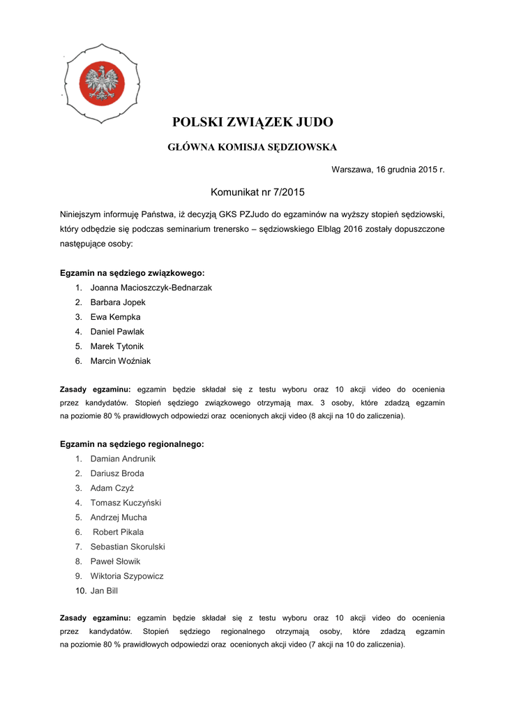 POLSKI ZWIĄZEK JUDO GŁÓWNA KOMISJA SĘDZIOWSKA Warszawa, 16 grudnia 2015 r. Komunikat nr 7/2015 Niniejszym informuję Państwa, iż decyzją GKS PZJudo do egzaminów na wyższy stopień sędziowski, który odbędzie się podczas seminarium trenersko – sędziowskiego Elbląg 2016 zostały dopuszczone następujące osoby: Egzamin na sędziego związkowego: 1. Joanna Macioszczyk-Bednarzak 2. Barbara Jopek 3. Ewa Kempka 4. Daniel Pawlak 5. Marek Tytonik 6. Marcin Woźniak Zasady egzaminu: egzamin będzie składał się z testu wyboru oraz 10 akcji video do ocenienia przez kandydatów. Stopień sędziego związkowego otrzymają max. 3 osoby, które zdadzą egzamin na poziomie 80 % prawidłowych odpowiedzi oraz ocenionych akcji video (8 akcji na 10 do zaliczenia). Egzamin na sędziego regionalnego: 1. Damian Andrunik 2. Dariusz Broda 3. Adam Czyż 4. Tomasz Kuczyński 5. Andrzej Mucha 6. Robert Pikala 7. Sebastian Skorulski 8. Paweł Słowik 9. Wiktoria Szypowicz 10. Jan Bill Zasady egzaminu: egzamin będzie składał się z testu wyboru oraz 10 akcji video do ocenienia przez kandydatów. Stopień sędziego regionalnego otrzymają osoby, które zdadzą na poziomie 80 % prawidłowych odpowiedzi oraz ocenionych akcji video (7 akcji na 10 do zaliczenia). egzamin POLSKI ZWIĄZEK JUDO GŁÓWNA KOMISJA SĘDZIOWSKA Osoby, które nie zdadzą egzaminu zostaną wycofane ze szkolenia centralnego. Egzamin na sędziego okręgowego szkolenia centralnego: 1. Aneta Łoś 2. Łukasz Stochmalski 3. Jacek Cal 4. Szymon Kleszcz 5. Paweł Masiukiewicz 6. Marcin Pałka 7. Dariusz Świercz 8. Grzegorz Gros 9. Robert Taraszkiewicz 10. Bartosz Brzeziński 11. Adam Prokopczyk 12. Katarzyna Zalewska Zasady egzaminu: egzamin będzie składał się z testu wyboru. Do szkolenia centralnego zakwalifikują się osoby, które zdadzą egzamin na poziomie 80 % prawidłowych odpowiedzi. Test wyboru będzie obejmował pytania z zakresu przepisów walki, regulaminu sportowego PZJudo, Regulaminu Sędziowskiego. W przypadku trudności z rozstrzygnięciem wyników GKS PZJudo zastrzega sobie możliwość wprowadzenia rozmowy kwalifikacyjnej jako uzupełniającego elementu egzaminu. Na pozytywny wynik egzaminu oprócz wiedzy teoretycznej będą miały wpływ dotychczasowe osiągnięcia i postawa sędziowska. Anna Sołoducha Przewodnicząca GKS