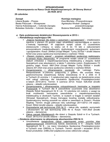 SPRAWOZDANIE Stowarzyszenia na Rzecz Osób Niepełnosprawnych „W Stronę Słońca” ZA ROK 2012 29 członków Zarząd: Liliana Bujała – Prezes Beata Pilszczek – Wiceprezes Hanna Kołodziejczyk – Członek Zarządu Bolesław Golonka – Członek Zarządu Komisja rewizyjna: Ewa Błońska –Przewodnicząca Agnieszka Wrobel- Zastępca przewodniczącego Bożena Malcharek - Sekretarz: a) Opis podstawowej działalności Stowarzyszenia w 2012 r. → Rehabilitacja wspierająca ON: „Zajęcia hipoterapii dla dzieci z autyzmem i sprzężeniami” - zrealizowano zgodnie z planem 25 godzin zajęć rehabilitacji usprawniającej w oparciu o metodę hipoterapii. W zajęciach wzięło udział 10 uczestników (dziewczynki i chłopcy w wieku od 6 do 10 lat) z zaburzeniami emocjonalnymi (nadpobudliwość), dysfunkcjami rozwojowymi, autyzmem i sprzężeniami. Koszt: 2648zł (Urząd Miejski Tychy 2075zł + środki własne 423zł oraz praca społeczna koordynatora o wartości 150zł). ,,Razem możemy więcej” - program rehabilitacji społecznej realizowany w ramach Klubu Aktywności. W programie wzięło udział 27 uczestników stałych (młodzież z niepełnosprawnością intelektualną z Zespołu Szkół Specjalnych oraz absolwenci), a także 7 członków rodzin. Zrealizowano 72 godziny zajęć. Koszt: 5801,04zł (Urząd Miejski Tychy 5000zł + środki własne 201,04zł oraz praca społeczna członków o wartości 600zł) Zorganizowanie i sfinansowanie wycieczki do Leśnego Parku Niespodzianek w Ustroniu połączonej z grillem, dla uczniów klasy gastronomicznej Zasadniczej Szkoły Zawodowej nr 6 z ZSS nr 8 w Tychach (9 uczniów + 3 opiekunów) jako nagrody za świadczenie przez nich usługi cateringu dla Inkubatora Społecznej Przedsiębiorczości w latach 2010-2012. Termin: 5 czerwca 2012r. Koszt: 528,40zł (środki własne – składki członkowskie). Zorganizowanie i sfinansowanie cotygodniowych treningów w kręgielni Przewoźnik w Tychach dla 8 zawodników (uczniowie oraz absolwenci Zespołu Szkół Specjalnych Nr 8 i ok. 10 członków ich rodzin), z uwagi na brak możliwości trenowania zawodników z niepełnosprawnością intelektualną w okolicach Tychów, w rzutach w kręgle w ramach działań Olimpiad Specjalnych. Grupa trenująca bowling została odbudowana. Systematyczny trening pozwolił na udział w zawodach w Żorach i Rudzie Śląskiej. Termin: drugie półrocze roku szkolnego 2011/2012 (18 wejść). Koszt: 594zł (środki własne – składki członkowskie). Doposażenie sali technicznej ZSS Nr 8 – zakup piły, opalarki, wyrzynarki z akcesoriami do sali technicznej ZSS Nr 8. Koszt: 1007,80zł (środki własne – darowizna). Zakup paczek Mikołajowych dla dzieci z Zespołu Szkół nr 8 w Tychach. Koszt: 2615,01zł (środki własne – darowizna). → Działania skierowane na aktywizację absolwentów ZSS Nr 8: Umożliwienie świadczenia usługi cateringowej przez uczniów klas gastronomicznych Zasadniczej Szkoły Zawodowej nr 6 - Zespołu Szkół Specjalnych Nr 8 - na rzecz Inkubatora Społecznej Przedsiębiorczości w Tychach oraz OREWu w Tychach. Termin: styczeń i wrzesień 2012r. Koszt produktów: 2388,23zł (zapłacone przez odbiorców usługi). 1 Podjęcie inicjatywy utworzenia spółdzielni socjalnej o charakterze gastronomicznym zakończone sukcesem. Spółdzielnię socjalną Ogrody Smaku zarejestrowano w sierpniu 2012r., a bar rozpoczął działalność w listopadzie 2012r. W spółdzielni znalazło zatrudnienie 4 absolwentów ZSS Nr 8: trzech kucharzy małej gastronomii oraz jedna absolwentka szkoły życia. (Koszty w całości poniesione przez Urząd Miejski i Stow. Współpracy Regionalnej w Chorzowie). → Zatrudnianie wolontariuszy do pracy na terenie ZSS Nr 8: W roku 2012r. Stowarzyszenie podpisało/kontynuowało 3 umowy wolontariacie na zakresy zadań odpowiadające pomocy nauczyciela oraz 1 umowę na wsparcie inicjatywy powstania spółdzielni. → Reprezentowanie osób niepełnosprawnych w dialogu z instytucjami rządowymi i samorządem lokalnym. Zaangażowanie się Stowarzyszenia w sprawę usług asystenckich, świadczonych na rzecz osób z autyzmem i z innymi zaburzeniami psychicznymi: najpierw na terenie miasta Tychy, a następnie włączenie się w podobną inicjatywę kilku stowarzyszeń, zakończone spotkaniem z Panem Wicewojewodą ds. Społecznych oraz pismami do Rzecznika Praw Obywatelskich. → Ponadto poczyniliśmy ważne kroki dla ogólnej działalności Stowarzyszenia: utworzyliśmy tzw. Grupę Zadań OPP nr 51, działającą pod patronatem Fundacji „Zdążyć z Pomocą” z Warszawy celem zbierania 1% na subkonto w Fundacji. znaleźliśmy tanie biuro rachunkowe, do obsługi księgowej Stowarzyszenia. nawiązaliśmy współpracę z Kobiecym Klubem Sportowym Polonia Tychy Sportowym Polonia, dzięki której nasi członkowie mogą uczestniczyć w zajęciach sportowych, organizowanych przez ten Klub. UCHWAŁY ZARZĄDU STOWARZYSZENIA Zarząd Stowarzyszenia w okresie do stycznia do grudnia 2012 r. podjął 6 uchwał. PRZYCHODY STOWARZYSZENIA Rodzaje przychodów ze względu na źródło: - składki członkowskie – 1.980,00 zł. - inne przychody określone statutem – 15.954,14 zł. Łącznie przychody za 2012 r.: 17.934,14 zł. PONIESIONE KOSZTY - realizację celów statutowych – 14.952,48 zł. - administrację – 120,60 zł. Łącznie koszty za 2012 r.: 15.073,08 zł. Rok 2012 zamknięto z wynikiem finansowym dodatnim w wysokości 2.740,06 zł. 31 grudnia 2012r. na koncie Stowarzyszenia było 4301,35zł. Tychy, 12 marca 2013 r. 2