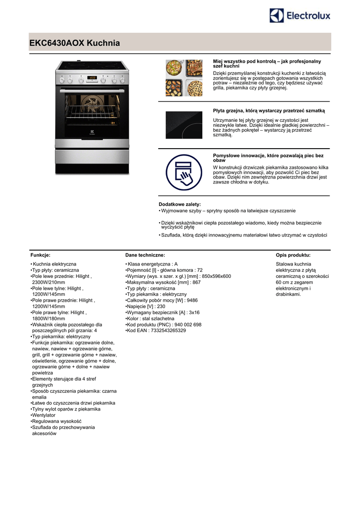 EKC6430AOX Kuchnia Miej wszystko pod kontrolą – jak profesjonalny szef kuchni Dzięki przemyślanej konstrukcji kuchenki z łatwością zorientujesz się w postępach gotowania wszystkich potraw – niezależnie od tego, czy będziesz używać grilla, piekarnika czy płyty grzejnej. Płyta grzejna, którą wystarczy przetrzeć szmatką Utrzymanie tej płyty grzejnej w czystości jest niezwykle łatwe. Dzięki idealnie gładkiej powierzchni – bez żadnych pokręteł – wystarczy ją przetrzeć szmatką. Pomysłowe innowacje, które pozwalają piec bez obaw W konstrukcji drzwiczek piekarnika zastosowano kilka pomysłowych innowacji, aby pozwolić Ci piec bez obaw. Dzięki nim zewnętrzna powierzchnia drzwi jest zawsze chłodna w dotyku. Dodatkowe zalety: • Wyjmowane szyby – sprytny sposób na łatwiejsze czyszczenie • Dzięki wskażnikowi ciepła pozostałego wiadomo, kiedy można bezpiecznie wyczyścić płytę • Szuflada, którą dzięki innowacyjnemu materiałowi łatwo utrzymać w czystości Funkcje: Dane techniczne: Opis produktu: • Kuchnia elektryczna •Typ płyty: ceramiczna •Pole lewe przednie: Hilight , 2300W/210mm •Pole lewe tylne: Hilight , 1200W/145mm •Pole prawe przednie: Hilight , 1200W/145mm •Pole prawe tylne: Hilight , 1800W/180mm •Wskaźnik ciepła pozostałego dla poszczególnych pól grzania: 4 •Typ piekarnika: elektryczny •Funkcje piekarnika: ogrzewanie dolne, nawiew, nawiew + ogrzewanie górne, grill, grill + ogrzewanie górne + nawiew, oświetlenie, ogrzewanie górne + dolne, ogrzewanie górne + dolne + nawiew powietrza •Elementy sterujące dla 4 stref grzejnych •Sposób czyszczenia piekarnika: czarna emalia •Łatwe do czyszczenia drzwi piekarnika •Tylny wylot oparów z piekarnika •Wentylator •Regulowana wysokość •Szuflada do przechowywania akcesoriów • Klasa energetyczna : A •Pojemność [l] - główna komora : 72 •Wymiary (wys. x szer. x gł.) [mm] : 850x596x600 •Maksymalna wysokość [mm] : 867 •Typ płyty : ceramiczna •Typ piekarnika : elektryczny •Całkowity pobór mocy [W] : 9486 •Napięcie [V] : 230 •Wymagany bezpiecznik [A] : 3x16 •Kolor : stal szlachetna •Kod produktu (PNC) : 940 002 698 •Kod EAN : 7332543265329 Stalowa kuchnia elektryczna z płytą ceramiczną o szerokości 60 cm z zegarem elektronicznym i drabinkami.