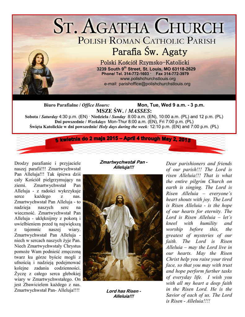 Parafia Św. Agaty Polski Kościół Rzymsko-Katolicki 3239 South 9th Street, St. Louis, MO 63118-2629 Phone/ Tel. 314-772-1603 · Fax 314-772-3979 www.polishchurchstlouis.org e-mail: [email protected] Biuro Parafialne / Office Hours: Mon, Tue, Wed 9 a.m. - 3 p.m. MSZE ŚW. / MASSES: Sobota / Saturday 4:30 p.m. (EN) · Niedziela / Sunday 8:00 a.m. (EN), 10:00 a.m. (PL) and 12 p.m. (PL) Dni powszednie / Weekdays Mon-Thur 8:00 a.m. (EN), Fri 7:00 p.m. (PL) Święta Katolickie w dni powszednie/ Holy days during the week: 12:10 p.m. (EN) and 7:00 p.m. (PL) Drodzy parafianie i przyjaciele naszej parafii!!! Zmartwychwstał Pan Alleluja!!! Tak śpiewa dziś cały Kościół pielgrzymujący na ziemi. Zmartwychwstał Pan Alleluja - z radości wykrzykuje serce każdego z nas. Zmartwychwstał Pan Alleluja - to nadzieja naszych serc na wieczność. Zmartwychwstał Pan Alleluja - uklęknijmy z pokorą i uwielbieniem przed tą największą z tajemnic naszej wiary. Zmartwychwstał Pan Alleluja niech w sercach naszych żyje Pan. Niech Zmartwychwstały Chrystus pomoże Wam podnieść zmęczoną twarz ku górze byście mogli z ufnością i nadzieją podejmować kolejne zadania codzienności. Życzę z całego serca głebokiej wiary w Zmartwychwstałego. On jest Zbawicielem każdego z nas. Zmartwychwstał Pan- Alleluja!!!! Zmartwychwstał Pan Alleluja!!! Lord has Risen Alleluia!!! Dear parishioners and friends of our parish!!! The Lord is risen Alleluia!!! That is what the entire pilgrim Church on earth is singing. The Lord is Risen Alleluia – everyone’s heart shouts with joy. The Lord is Risen Alleluia - is the hope of our hearts for eternity. The Lord is Risen Alleluia – let’s kneel with humility and worship before this, the greatest of mysteries of our faith. The Lord is Risen Alleluia – may the Lord live in our hearts. May the Risen Christ help you raise your tired face, so that you may with trust and hope perform further tasks of everyday life. I wish you with all my heart a deep faith in the Risen Lord. He is the Savior of each of us. The Lord is Risen - Alleluia!!!! 5 kwietnia 2015; Wielkanoc April 5, 2015; Easter Sunday Początek i koniec, przeszłość i przyszłość spotykają się i spełniają w dniu dzisiejszym, w którym Chrystus zmartwychwstał. Umarł, ale żyje. Barankiem umęczonym na krzyżu jest Pan, który przyjdzie, aby dopełnić sensu istnienia świata i ludzi. Nasz czas płynie między zmartwychwstaniem Chrystusa i Jego powtórnym przyjściem. Między tymi wydarzeniami biegną drogi naszego życia. Idziemy w świetle wiary, nierzadko także w jej mrokach. Nasza wiara opiera się na świadectwach ludzi, którzy widzieli Zmartwychwstałego. Pokolenia, które po nas przyjdą, żyć będą wiarą wyznawaną przez nas i poświadczaną naszymi czynami. Pierwsze Czytani Dz 10,34a.37-43 Drugie Czytanie Kol 3,1-4 Ewangelia J 20, 1-9 The beginning and the end, the past and the future come together and meet today in which Christ rose from the dead. He died, but He lives. A lamb tortured on the cross is the Lord, who will come to fulfill the sense of the world and human existence. Our time passes between the resurrection of Christ and His second coming. Between these events, run the pathways of our life. We walk in the light of faith, often also in the darkness. Our faith is based on the testimonies of people who had seen the risen Lord. Generations that come after us will live by faith professed by us and certified by our actions. First Reading Acts 10:34a, 37-43 Col 3:1-4 Second Reading Gospel Jn 20:1-9 12 kwietnia 2015; Niedziela Miłosierdzia Bożego April 12, 2015; 2nd Sunday of Easter – Divine Mercy Sunday Nieprawdziwa byłaby wiara, a szczególnie wiara wielkanocna, która nie byłaby radością i ciągle ponawiającym się zdumieniem nad prawdą, że Jezus żyje i jest obecny pośród nas. Ten sam Jezus ze zranionym sercem, z przebitymi rękami i stopami. W Nim mieszka pełnia Bóstwa i staje się udziałem tych, którzy do Niego przychodzą. Przyjść do Jezusa znaczy: wierzyć, że Bóg w Nim przychodzi do nas. Kto nie wierzy, ten nie widzi niczego. Kto kocha, wszystko pojmuje. Pierwsze Czytanie Dz 4,32-35 Drugie Czytanie 1 J 5,1-6 Ewangelia J 20,19-31 Faith would be false, especially the Easter faith, if it were one which would not be happy and continually renewed by the wonder over the truth that Jesus is alive and present among us, the same Jesus with a wounded heart, with pierced hands and feet. In Him dwells the fullness of the Deity, and is shared by those who come to Him. To come to Jesus means: to believe that God comes to us in Him. The one, who does not believe, does not see anything. The one, that loves, understands everything. First Reading Acts 4:32-35 Second Reading 1 Jn 5:1-6 Gospel Jn 20:19-31 19 kwietnia 2015; 3 Niedziela Wielkanocna April 19, 2015; 3rd Sunday of Easter Czy chrześcijanin powinien nawrócić się do Chrystusa? – dziwne i nieczęste pytanie, a jednak konieczne. Nawrócić się, znaczy w tym przypadku także: wierzyć w Chrystusa i przez Niego zwracać się w każdej sytuacji ku Bogu. Przecież tego wyboru dokonaliśmy już dawno temu. Najpierw na chrzcie św., a potem wielokrotnie wyznawaliśmy: wierzymy – wierzę! Tę wiarę odnowiliśmy w Wigilię Paschalną. A jednak każdego dnia stajemy na nowo przed tą samą decyzją: za lub przeciw Bogu, z Bogiem czy bez Boga. Wyznanie złożone na chrzcie św. było przyrzeczeniem, które tylko z trudem udaje się nam wcielać w codzienne życie, zamieniać w czyn. Nawrócenie oznacza ciągłą zmianę na lepsze. A takiej zmiany wciąż potrzebujemy: i grzesznicy, i porządni, i święci. Pierwsze Czytanie Dz 3,13-15.17-19 Drugie Czytanie 1 J 2,1-5a Ewangelia Łk 24,35-48 Should a Christians be converted? That is a strange and uncommon question, but a necessary one. To convert, in this case, also means to believe in Christ and through him to turn to God in every situation. But we made this ch
