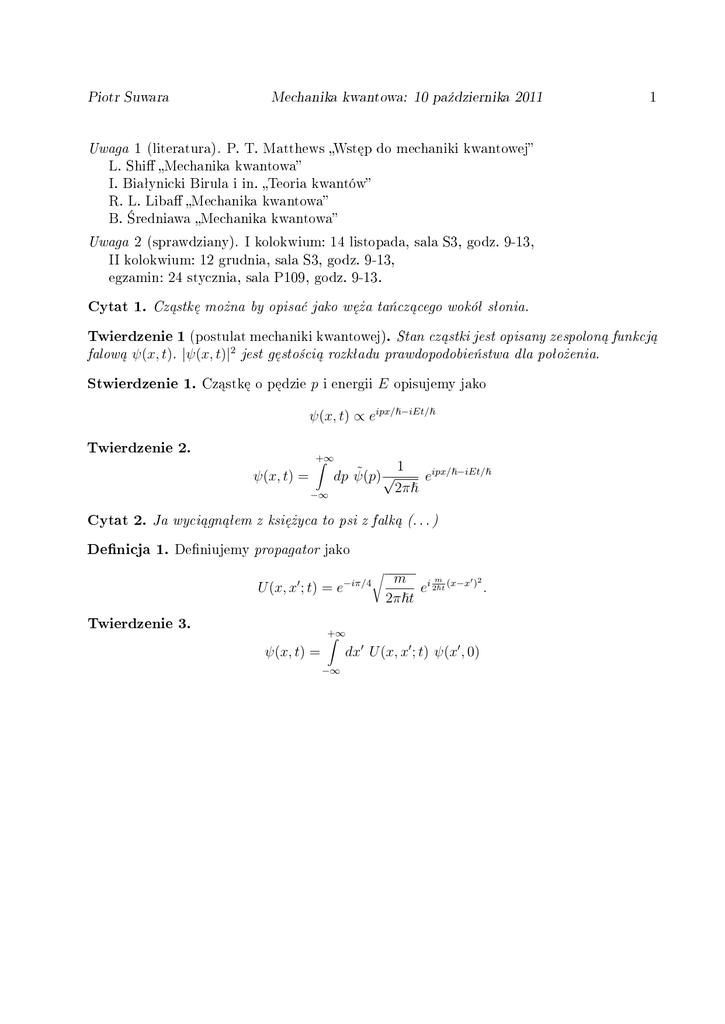 Piotr Suwara Mechanika kwantowa: 10 pa¹dziernika 2011 1 Uwaga 1 (literatura). P. T. Matthews Wst¦p do mechaniki kwantowej L. Shi Mechanika kwantowa I. Biaªynicki Birula i in. Teoria kwantów R. L. Liba Mechanika kwantowa B. redniawa Mechanika kwantowa Uwaga 2 (sprawdziany). I kolokwium: 14 listopada, sala S3, godz. 9-13, II kolokwium: 12 grudnia, sala S3, godz. 9-13, egzamin: 24 stycznia, sala P109, godz. 9-13. Cytat 1. Cz¡stk¦ mo»na by opisa¢ jako w¦»a ta«cz¡cego wokóª sªonia. Twierdzenie 1 (postulat mechaniki kwantowej). Stan cz¡stki jest opisany zespolon¡ funkcj¡ falow¡ ψ(x, t). |ψ(x, t)|2 Stwierdzenie 1. jest g¦sto±ci¡ rozkªadu prawdopodobie«stwa dla poªo»enia. Cz¡stk¦ o p¦dzie p i energii E opisujemy jako ψ(x, t) ∝ eipx/}−iEt/} Twierdzenie 2. ψ(x, t) = +∞ Z dp ψ̃(p) √ −∞ Cytat 2. 1 eipx/}−iEt/} 2π} Ja wyci¡gn¡ªem z ksi¦»yca to psi z falk¡ (. . . ) Denicja 1. Deniujemy propagator jako U (x, x0 ; t) = e−iπ/4 Twierdzenie 3. ψ(x, t) = +∞ Z r m i m (x−x0 )2 e 2}t . 2π}t dx0 U (x, x0 ; t) ψ(x0 , 0) −∞