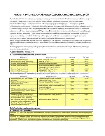 ANKIETA PROFESJONALNEGO CZŁONKA RAD NADZORCZYCH Polski Instytut Dyrektorów realizując swoją misję w zakresie podnoszenia standardów ładu korporacyjnego w Polsce, uznaje za rzeczywistą i autentyczną coraz większą potrzebę profesjonalizacji zarządzania na poziomie najwyższych organów przedsiębiorstwa. Jednym z istotnych składników ładu korporacyjnego jest jakość pracy rad nadzorczych w spółkach publicznych, co znajduje wyraz w zaleceniach Komisji Europejskiej dotyczących roli niezależnych członków rad nadzorczych i w „Kodeksie Dobrych Praktyk 2005” przyjętym przez GPW. PID wychodząc naprzeciw oczekiwaniom wszystkich inwestorów zainteresowanych lokowaniem pieniędzy na GPW prowadzi „Listę kandydatów na profesjonalnych członków rad nadzorczych Polskiego Instytutu Dyrektorów”, ażeby ułatwić poszukiwanie kandydatów na profesjonalnych członków rad nadzorczych, zagwarantować dostęp i umożliwić obiektywny wybór najlepszych kandydatów na wysokim poziomie profesjonalnym i moralnym, i w ten sposób zapewnić zaufanie do rynków finansowych i bezpieczeństwo inwestowania. Każdy, kto spełnia wymagania formalne zawarte w "Regulaminie listy (korpusu) kandydatów na profesjonalnych członków rad nadzorczych Polskiego Instytutu Dyrektorów" może ubiegać się o status kandydata na profesjonalnego członka rad nadzorczych PID. Podstawę przyznania statusu profesjonalnego kandydata na niezależnego członka rad nadzorczych PID stanowią informacje zawarte w poniższej ankiecie. A.Doświadczenia zawodowe A.1. Podaj zajmowane stanowiska w organach spółek Stanowisko Członek Rady Nadzorczej Przewodniczacy Rady Nadzorczej Członek Rady Nadzorczej Członek Rady Nadzorczej Członek Rady Nadzorczej Członek Rady Nadzorczej Nazwa instytucji Złote Tarasy Sp. z o.o. SPTHW Sp. z o.o. Intermoda SA we Wrocławiu Przedsiębiorstwo Robót kolejowych i Inżynieryjnych SA we Wrocławiu Pasmanta SA w Białymstoku POZBAC SA w Poznaniu Od (rrrr) Do (rrrr) 2005 2004 1999 1999 2006 2007 2005 1999 1998 1988 2009 1999 A.2. Inne doświadczenia zawodowe (np. praca w administracji rządowej, w instytucjach międzynarodowych, w konsultingu) Od (rrrr) Do (rrrr) 2008 2009 2007 2009 Rada Rozwoju Rynku Finansowego przy Ministrze Finansów Urząd m. st. Warszawy 2006 2007 2004 2005 Zastępca dyrektora Departamentu, nastepnie dyrektor Sekretariatu Prezesa Rady Ministrów, radca generalny Kancelaria Prezesa Rady Ministrów 2000 2010 Gł. Specjalista, następnie naczelnik Wydziału Rynków Kapitałowych w Dep. Funduszy Kapitałowych ( następnie Dep.Instytucji Finansowych) Ministerstwo Skarbu Państwa 1998 2000 Stanowisko Reprezentujacy KNF jako członek Komitetu Członek Komisji i Zastępca Przewodniczacego Członek Rady Gł. Specjalista, następnie naczelnik Wydziału Prywatyzacji i Biurze Nadzoru Właścicielskiego Nazwa instytucji Committee of European Securities Regulators (CESR) - Paryż Komisja Nadzoru Finansowego B.Najważniejsze dokonania w pracy B.1.W okresie pracy w spółkach Pasmanta SA , PRKiI SA - efektywne reprezentowanie interesów SP do momentu ostatecznego zakończenia procesu prywatyzacji spółek. Intermoda Sa - aktywny udział w mionitorowaniu procesów restrukturyzacji majątkowej, organizacyjnej i finansowej Spółki oraz tworzenia grupy kapitałowej. Współuczestnictwo w doskonaleniu wysokiej kultury zarządzania korporacyjnego w Spółce. Udana reorientacja Spółki na rynku poprzez zmianę profilu i dywersyfikację działalności operacyjnej. SPTHW Sp. z o.o. - Współwypracowanie koncepcji całościowej restrukturyzacji Spółki włącznie z odzyskaniem płynności i zdolności do działań operacyjnych. Scisły monitoring przeprowadzenia kompleksowego programu naprawczego, umożzliwiającego następnie połączenie Spółki z innym podmiotem przez przejecie. B.2.W innej pracy zawodowej (np. w administracji rzadowej, w instytucjach międzynarodowych, w konsultingu , w dydaktyczno naukowej) Przespieszenie prywatyzacji i przeprowadzenie udanych transakcji sprzedaży akcji/udziałów Skarbu Państwa w ponad 30 spółkach portfelowych NFI, w tym także na rynku publicznym, w okresie 1999-2000. Skuteczne przeprowadzenie negocjacji w przypadku szeregu spółek parterowych w celu uzyskania korzystniejszych od zaoferowanych warunków transakcji sprzedazy. Opracowanie projektu strategii prywatyzacji dla wybranych spółek z udziałem m.st.Warszawy. Skuteczne zakończenie prywatyzacji jednej spółki. W sferze nadzoruwłascicielskiego wzmocnienie pozycji m.st.Warszawy jako wspólnika mniejszosciowego w wybranych spółkach. Efektywne wdraznie zasad zarządzania korporacyjnego w spółkach z udziałem podmiotów publicznych. Aktywne nadzorowanie działalności spółek. Osiągnięcie satysfakcjonującego poziomu profesjonalizmu i operacyjnej sprawności w działaniach Sekretariatu Prezesa Rady Ministrów służacych realizacji zadań Prezesa Rady Ministrów. Podjete przez nadzór nad rynkiem kapitałowym działania przyczyniły się do eliminacji zjawiska nieprawidłowej wyceny rynkowej niektórych spółek spowodowanej uzależnieniem ceny rynkowej akcji tych spółek od ich skrajnie niskiej wartości nominalnej; Doprowadzenie przez KNF do publikacji informacji o strukturze rynku terminowego umożliwiło wszystkim inwestorom uzyskanie równego, choć wciąż niesatysfakcjonującego dostepu do danych dot. koncentracji liczby otwartych pozycji na rynku. Zintensyfikowanie obecności KNF w strukturach europejskich m.in.. Dzieki aktywnemu czestnictwu w pracach CESR i IOSCO oraz współpracy dwustronnej z wybranymi partnerami. Rezultatem tych działań było wzmocnienie pozycji KNF, poprawa wizerunku polskiego nadzoru finansowego oraz poprawa postrzegania interesów krajowego rynku kapitałowego na tych forach unijnych. C.Profesjonalne zainteresowania zawodowe (dziedzina zarządzania, sektor - branża gospodarki) preferencje kandydata przy obsadzie rad nadzorczych Zaint