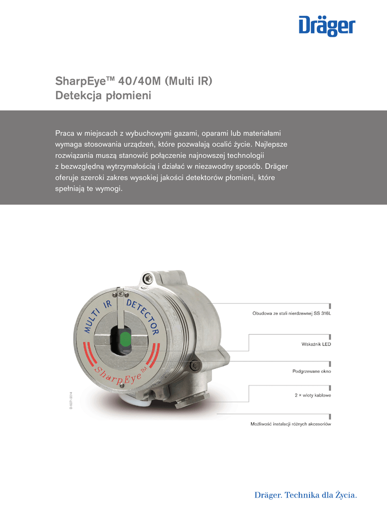 SharpEye™ 40/40M (Multi IR) Detekcja płomieni Praca w miejscach z wybuchowymi gazami, oparami lub materiałami wymaga stosowania urządzeń, które pozwalają ocalić życie. Najlepsze rozwiązania muszą stanowić połączenie najnowszej technologii z bezwzględną wytrzymałością i działać w niezawodny sposób. Dräger oferuje szeroki zakres wysokiej jakości detektorów płomieni, które spełniają te wymogi. 02 | SharpEye™ 40/40M (Multi IR) Zalety Niezawodność, na którą można liczyć Nowy detektor SharpEye™ 40/40M oferowany przez firmę Dräger to detektor płomienia Multi IR, zaprojektowany specjalnie do wykrywania z dużych odległości pożarów węglowodorów i wodoru. Jego wysoka odporność na fałszywe alarmy i doskonała wydajność sprawiają, że nadaje się idealnie do licznych zastosowań. Wytrzymała konstrukcja Jak większość detektorów dostępnych aktualnie na rynku, odpornych na czynniki atmosferyczne, detektory 40/40M dzięki swoim cechom są przystosowane do pracy w ekstremalnych warunkach. Jest to np. podgrzewane okno uniemożliwiające oblodzenie i pozwalające wyeliminować do 95 % skraplania w wilgotnych fazach. SharpEye™ zwiększa poziom bezpieczeństwa Dzięki możliwości wykrywania pożarów benzyny 0,1 m2 z odległości 65 m lub pożarów wodoru z odległości 30 m w czasie krótszym niż 5 sekund detektor 40/40M oferuje największą niezawodność. Dodatkowo dzięki średniemu czasowi bezawaryjnej pracy wynoszącemu minimum 150 000 godzin okres użytkowania jest dłuższy i bezproblemowy – co zapewnia dodatkowe bezpieczeństwo pracy i pracowników. Inteligentna konstrukcja Detektor 40/40M został skonstruowany również z myślą o wygodzie. Przykładem tego jest niższe zapotrzebowanie na energię i kompaktowa, lżejsza konstrukcja ułatwiająca instalację i konserwację. Niezawodność Bezpieczeństwo działania to koncepcja sprawdzająca się dla wszystkich sektorów przemysłu. Jest fundamentalnym czynnikiem umożliwiającym zastosowanie skomplikowanej technologii w systemach związanych z bezpieczeństwem. To gwarantuje, że systemy związane z bezpieczeństwem będą oferować wymagane obniżenie ryzyka. Seria detektorów płomienia SharpEye™ 40/40 charakteryzuje się wysokim poziomem niezawodności i jest zgodna z wymogami nienaruszalności bezpieczeństwa IEC 61508 na poziomie SIL 2. Automatyczne i ręczne testy optyki (BIT) Automatyczne kontrole układów elektronicznych i optycznych detektora pomagają zagwarantować, że żadna usterka nie pozostanie niezauważona. Dodatkowo test można uruchomić ręcznie w dowolnym momencie. Dobrze widoczna dioda stanu LED Trójkolorowa dioda LED umieszczona z przodu detektora jest dobrze widoczna dla osób pracujących SharpEye™ 40/40M (Multi IR) | 03 Zalety w jego pobliżu. Zielony kolor oznacza normalną pracę; żółty kolor oznacza usterkę, a czerwony kolor wskazuje obecność promieniowania pochodzącego z ognia. Prosta instalacja i uruchamianie Instalacja jest prosta! Detektor instaluje się łatwo przy użyciu przechylnego elementu mocującego ze stali szlachetnej, który umożliwia obracanie detektora w zakresie do 60° we wszystkich kierunkach i nakierowanie go na potencjalne źródło pożaru. SharpEye™ 40/40M oferuje: ‒ Praca w wielu widmach – wykrywanie na dużą odległość i wysoka odporność na fałszywe alarmy ‒ Zaawansowane przetwarzanie cyfrowe dynamicznej charakterystyki ognia (migotanie, korelacja progu i współczynnika) ‒ Wybór czułości – aby wyeliminować detekcję międzystrefową ‒ Wbudowany test automatyczny i ręczny (BIT) – aby zapewnić ciągłą i niezawodną pracę ‒ Podgrzewane okno – odpowiednie do pracy w trudnych warunkach pogodowych (śnieg, lód, skraplanie) ‒ Liczne opcje wyjść zapewniające maksymalną elastyczność i kompatybilność ‒ 3 przekaźniki: alarmy, usterki i pomocniczy ‒ 0 – 20 mA (stopniowe) ‒ Protokół HART do konserwacji i zarządzania ‒ Złącze RS485, kompatybilne z Modbus ‒ Dopuszczenie do poziomu nienaruszalności bezpieczeństwa 2 (SIL 2 – TÜV) ‒ Dopuszczenia umożliwiające zastosowanie w strefach zagrożonych wybuchem całym świecie: ATEX, IECEx, FM/FMC, CSA 04 | SharpEye™ 40/40M (Multi IR) Akcesoria D-9270-2014 Symulator płomieni 40/40M Symulator płomieni SharpEye™ IR3 40/40M został specjalnie zaprojektowany do użytku z detektorami płomienia SharpEye™. Symulator płomieni emituje promieniowanie IR w unikatowej sekwencji odpowiadającej płomieniom i rozpoznawanej przez detektor jako płomienie. Dzięki temu detektory można testować w symulowanych warunkach pożarowych bez związanego z tym zagrożenia ze strony otwartego płomienia. Osłona pogodowa detektora płomienia D-2317-2014 Osłona pogodowa chroni detektor przed różnymi warunkami pogodowymi takimi, jak śnieg i deszcz. Wskaźnik laserowy SharpEye™ D-9282-2014 Czy zasięg detektora pokrywa obszar wymagający ochrony? Czy jest umieszczony w prawidłowym miejscu i czy stożek widzenia detektora obejmuje najbardziej niebezpieczne miejsce? Dzięki temu osprzętowi projektant/instalator może zoptymalizować lokalizację detektora i jego rzeczywisty zasięg. SharpEye™ 40/40M (Multi IR) | 05 Powiązane produkty SharpEye™ 40/40R (IR) D-9306-2014 Praca w miejscach z wybuchowymi gazami, oparami lub materiałami wymaga stosowania urządzeń, które pozwalają ocalić życie. Najlepsze rozwiązania muszą stanowić połączenie najnowszej technologii z bezwzględną wytrzymałością i działać w niezawodny sposób. Dräger oferuje szeroki zakres wysokiej jakości detektorów płomieni, które spełniają te wymogi. SharpEye™ 40/40L-LB (UV/IR) D-9289-2014 Praca w miejscach z wybuchowymi gazami, oparami lub materiałami wymaga stosowania urządzeń, które pozwalają ocalić życie. Najlepsze rozwiązania muszą stanowić połączenie najnowszej technologii z bezwzględną wytrzymałością i działa