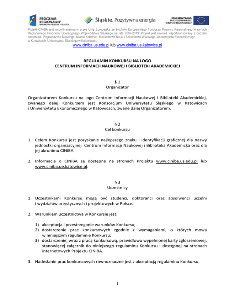 Projekt CINiBA jest współfinansowany przez Unię Europejską ze środków Europejskiego Funduszu Rozwoju Regionalnego w ramach Regionalnego Programu Operacyjnego Województwa Śląskiego na lata 2007-2013. Projekt jest również współfinansowany z budżetu samorządu Województwa Śląskiego, Miasta Katowice, Ministerstwa Nauki i Szkolnictwa Wyższego, Uniwersytetu Ekonomicznego w Katowicach, Uniwersytetu Śląskiego w Katowicach. www.ciniba.us.edu.pl lub www.ciniba.ue.katowice.pl REGULAMIN KONKURSU NA LOGO CENTRUM INFORMACJI NAUKOWEJ I BIBLIOTEKI AKADEMICKIEJ § 1 Organizator Organizatorem Konkursu na logo Centrum Informacji Naukowej i Biblioteki Akademickiej, zwanego dalej Konkursem jest Konsorcjum Uniwersytetu Śląskiego w Katowicach i Uniwersytetu Ekonomicznego w Katowicach, zwane dalej Organizatorem. § 2 Cel konkursu 1. Celem Konkursu jest pozyskanie najlepszego znaku i identyfikacji graficznej dla nazwy jednostki organizacyjnej Centrum Informacji Naukowej i Biblioteka Akademicka oraz dla jej akronimu CINiBA. 2. Informacje o CINiBA są dostępne na stronach Projektu www.ciniba.us.edu.pl lub www.ciniba.ue.katowice.pl. § 3 Uczestnicy 1. Uczestnikami Konkursu mogą być studenci, doktoranci oraz absolwenci uczelni i wydziałów artystycznych i projektowych w Polsce. 2. Warunkiem uczestnictwa w Konkursie jest: 1) akceptacja i przestrzeganie warunków Konkursu; 2) dostarczenie prac konkursowych zgodnie z wymaganiami, o których mowa w niniejszym regulaminie Konkursu; 3) dostarczenie, wraz z pracą konkursową, prawidłowo wypełnionej karty zgłoszeniowej, stanowiącej załącznik do niniejszego regulaminu Konkursu i dostępnej na stronach internetowych Projektu CINiBA. 3. Nadesłanie prac konkursowych równoznaczne jest z akceptacją regulaminu Konkursu. 1 Projekt CINiBA jest współfinansowany przez Unię Europejską ze środków Europejskiego Funduszu Rozwoju Regionalnego w ramach Regionalnego Programu Operacyjnego Województwa Śląskiego na lata 2007-2013. Projekt jest również współfinansowany z budżetu samorządu Województwa Śląskiego, Miasta Katowice, Ministerstwa Nauki i Szkolnictwa Wyższego, Uniwersytetu Ekonomicznego w Katowicach, Uniwersytetu Śląskiego w Katowicach. www.ciniba.us.edu.pl lub www.ciniba.ue.katowice.pl § 4 Konkurs 1. Konkurs zostanie ogłoszony 12 stycznia 2011 r. i będzie trwał do 31 marca 2011 r. 2. Zadaniem konkursowym jest opracowanie logo dla potrzeb Centrum Informacji Naukowej i Biblioteki Akademickiej (CINiBA). 3. Projekt logo należy przygotować w 3 wersjach kolorystycznych: kolorowa, czarno‐biała i w skali szarości. Każdy z uczestników Konkursu może zgłosić dowolną ilość projektów logo. 4. Prace konkursowe muszą być dostarczone jako wydruki w formacie A4 oraz w formie elektronicznej (płyta CD). Wydruki muszą zawierać logotyp w dwóch wielkościach: logotyp o podstawie 15 cm oraz pomniejszony logotyp o podstawie 1.5 cm. Wydruki muszą być podpisane z tyłu pracy, w górnym prawym rogu godłem składającym się z trzech cyfr i dwóch liter. Poszczególne prace konkursowe w formie elektronicznej należy podpisać stosując jako nazwę godło. 5. Prace konkursowe powinny być wykonane samodzielnie przez uczestników Konkursu i powinny być wolne od wad prawnych. Prace konkursowe mogą być pracą zbiorową. 6. Prace konkursowe wraz z wypełnioną kartą zgłoszeniową w zaklejonej kopercie należy złożyć lub przesłać na adres Biura Projektu CINiBA, ul. Bankowa 14 w Katowicach, pok. 427. Termin składania prac konkursowych upływa 21 marca 2011 r. Niespełnienie przez uczestnika warunków formalnych lub technicznych określonych w tym paragrafie może spowodować odrzucenie pracy konkursowej przez Organizatora. § 5 Jury 1. Zwycięzca Konkursu oraz osoby wyróżnione zostaną wyłonieni przez jury składające się z przedstawicieli Akademii Sztuk Pięknych w Katowicach oraz Organizatora, w składzie: 1) JM Rektor ASP w Katowicach prof. Marian Oslislo – Przewodniczący Jury, 2) prof. zw. dr hab. Małgorzata Łuszczak, 3) prof. UŚ dr hab. Dariusz Pawelec, 4) prof. AE dr hab. Maja Szymura‐Tyc, 5) prof. AE dr hab. Sławomir Smyczek. 2 Projekt CINiBA jest współfinansowany przez Unię Europejską ze środków Europejskiego Funduszu Rozwoju Regionalnego w ramach Regionalnego Programu Operacyjnego Województwa Śląskiego na lata 2007-2013. Projekt jest również współfinansowany z budżetu samorządu Województwa Śląskiego, Miasta Katowice, Ministerstwa Nauki i Szkolnictwa Wyższego, Uniwersytetu Ekonomicznego w Katowicach, Uniwersytetu Śląskiego w Katowicach. www.ciniba.us.edu.pl lub www.ciniba.ue.katowice.pl 2. Jury przy ocenie stosować będzie jako kryterium wartość projektową zgłoszonych prac konkursowych. § 6 Nagrody 1. Laureaci otrzymają nagrody pieniężne o łącznej wartości 6 000 PLN. 2. Przyznana zostanie 1 nagroda główna oraz 2 wyróżnienia. Jeden uczestnik może otrzymać tylko jedno wyróżnienie, niezależnie od ilości zgłoszonych projektów logo. 3. Organizator pobierze należny podatek w wysokości 10% wartości nagród. § 7 Ogłoszenie wyników i promocja laureatów 1. Ogłoszenie wyników Konkursu nastąpi w dniu 31 marca 2011 r., a zwycięzca Konkursu zostanie powiadomiony drogą mailową o rozstrzygnięciu Konkursu. 2. Organizatorzy Konkursu zastrzegają sobie możliwość podawania do publicznej wiadomości informacji o laureacie Konkursu. 3. Wyniki Konkursu zostaną podane do wiadomości publicznej na stronie internetowej Projektu CINiBA. § 8 Prawa autorskie Uczestnicy Konkursu przenoszą na Organizatora całość autorskich praw majątkowych do zgłoszonych prac konkursowych. § 9 Ochrona danych osobowych 1. Uczestnicy Konkursu wyrażają zgodę na przetwarzanie ich danych osobowych zgodnie z ustawą z dnia 29 sierpnia 1997 r. o ochronie danych osobowych (tekst jednolity Dz. U. z 2002 r., Nr 101, poz. 926, z późn. zm.) dla potrzeb Konkursu. 3 Projekt CINiBA jest wsp