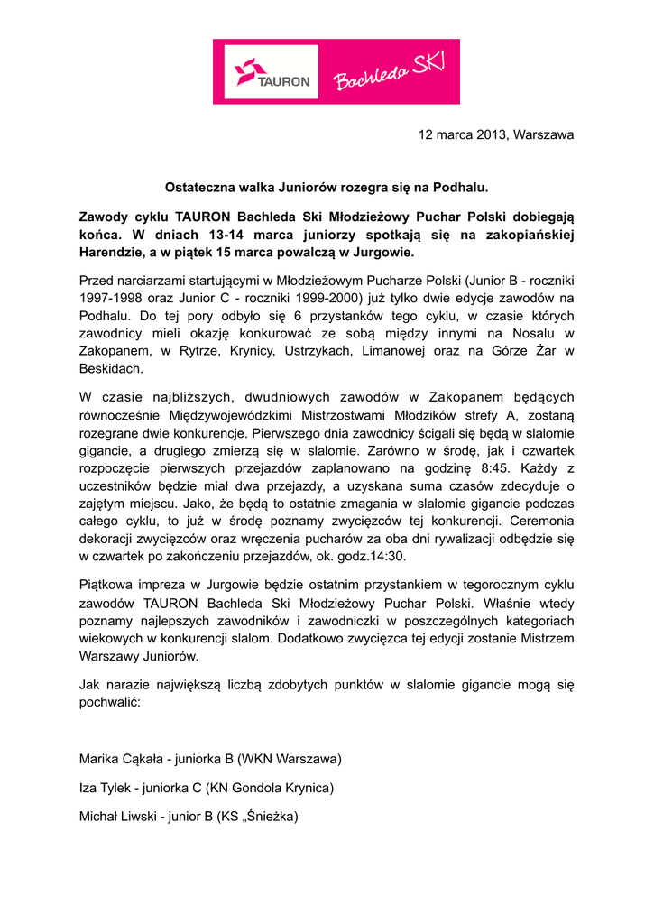 12 marca 2013, Warszawa Ostateczna walka Juniorów rozegra się na Podhalu. Zawody cyklu TAURON Bachleda Ski Młodzieżowy Puchar Polski dobiegają końca. W dniach 13-14 marca juniorzy spotkają się na zakopiańskiej Harendzie, a w piątek 15 marca powalczą w Jurgowie. Przed narciarzami startującymi w Młodzieżowym Pucharze Polski (Junior B - roczniki 1997-1998 oraz Junior C - roczniki 1999-2000) już tylko dwie edycje zawodów na Podhalu. Do tej pory odbyło się 6 przystanków tego cyklu, w czasie których zawodnicy mieli okazję konkurować ze sobą między innymi na Nosalu w Zakopanem, w Rytrze, Krynicy, Ustrzykach, Limanowej oraz na Górze Żar w Beskidach. W czasie najbliższych, dwudniowych zawodów w Zakopanem będących równocześnie Międzywojewódzkimi Mistrzostwami Młodzików strefy A, zostaną rozegrane dwie konkurencje. Pierwszego dnia zawodnicy ścigali się będą w slalomie gigancie, a drugiego zmierzą się w slalomie. Zarówno w środę, jak i czwartek rozpoczęcie pierwszych przejazdów zaplanowano na godzinę 8:45. Każdy z uczestników będzie miał dwa przejazdy, a uzyskana suma czasów zdecyduje o zajętym miejscu. Jako, że będą to ostatnie zmagania w slalomie gigancie podczas całego cyklu, to już w środę poznamy zwycięzców tej konkurencji. Ceremonia dekoracji zwycięzców oraz wręczenia pucharów za oba dni rywalizacji odbędzie się w czwartek po zakończeniu przejazdów, ok. godz.14:30. Piątkowa impreza w Jurgowie będzie ostatnim przystankiem w tegorocznym cyklu zawodów TAURON Bachleda Ski Młodzieżowy Puchar Polski. Właśnie wtedy poznamy najlepszych zawodników i zawodniczki w poszczególnych kategoriach wiekowych w konkurencji slalom. Dodatkowo zwycięzca tej edycji zostanie Mistrzem Warszawy Juniorów. Jak narazie największą liczbą zdobytych punktów w slalomie gigancie mogą się pochwalić: Marika Cąkała - juniorka B (WKN Warszawa) Iza Tylek - juniorka C (KN Gondola Krynica) Michał Liwski - junior B (KS „Śnieżka) Paweł Pyjas – junior C (KN Siepraw - Ski) Z kolei w slalomie w pierwszej czwórce znaleźli się: Dorota Wysowska – juniorka B (KS Narciarnia) Iza Tylek - juniorka C (KN Gondola Krynica) Jędrzej Jasiczek – junior B (SNA - SKI Team) Alex Chyc – junior C (KS AZS Zakopane) To właśnie ta grupa narciarzy ma największe szanse na zdobycie złotych medali. Rywalizacja w Zakopanem i Jurgowie zapowiada się jednak bardzo emocjonująco, gdyż różnice w czołówce klasyfikacji generalnej są bardzo małe! Dodatkowe informacje dostępne są na www.facebook.com/TauronBachledaSki oraz na www.tauronbachledaski.pl Andrzej Lesiewski [email protected] +48 512 348 232 TAURON Polska Energia SA jest spółką holdingową w grupie kapitałowej, która zajmuje się wydobyciem węgla, wytwarzaniem, dystrybucją i sprzedażą energii. Grupa TAURON wraz z GZE obejmuje swoim działaniem 18 proc. powierzchni kraju i jest jednym z największych podmiotów gospodarczych w Polsce, posiadającym 5,2 mln klientów. W skład Grupy TAURON wchodzą m.in. TAURON Wytwarzanie, TAURON Dystrybucja, TAURON Sprzedaż, TAURON Obsługa Klienta, Południowy Koncern Węglowy, TAURON Ciepło, TAURON Ekoenergia oraz spółki należące do GZE. Andrzej Bachleda-Curuś II – (ur. 2 stycznia 1947 roku w Zakopanem) to najbardziej utytułowany polski narciarz alpejski. Dwukrotnie reprezentował Polskę na Igrzyskach Olimpijskich – w 1968 roku w Grenoble, gdzie zdobył 6. lokatę w slalomie specjalnym oraz w Sapporo w roku 1972, plasując się na 9. pozycji w salomie gigancie. W jego kolekcji znajdują się też medale Narciarskich Mistrzostw Świata - brąz za kombinację alpejską w Val Gardena w 1970 roku oraz srebro zdobyte w 1974 w St. Moritz w tej samej konkurencji. Wybitnym wynikiem było też 2. miejsce w slalomowej klasyfikacji Pucharu Świata i 6. miejsce w klasyfikacji generalnej w sezonie 1971/1972. Andrzej Bachleda-Curuś wielokrotnie tryumfował też na Zimowych Uniwersjadach i Spartakiadach Armii Zaprzyjaźnionych. Na najwyższym podium Mistrzostw Polski stawał aż 14 razy. W trakcie swojej kariery ścigał się z największymi legendami narciarstwa alpejskiego, takimi jak Jean Claude Killy czy Gustavo Thöni. Jest pierwszym Polakiem uhonorowanym prestiżową nagrodą „Fair Play” przyznawaną przez UNESCO. W 2009 roku otrzymał Krzyż Kawalerski Orderu Odrodzenia Polski.