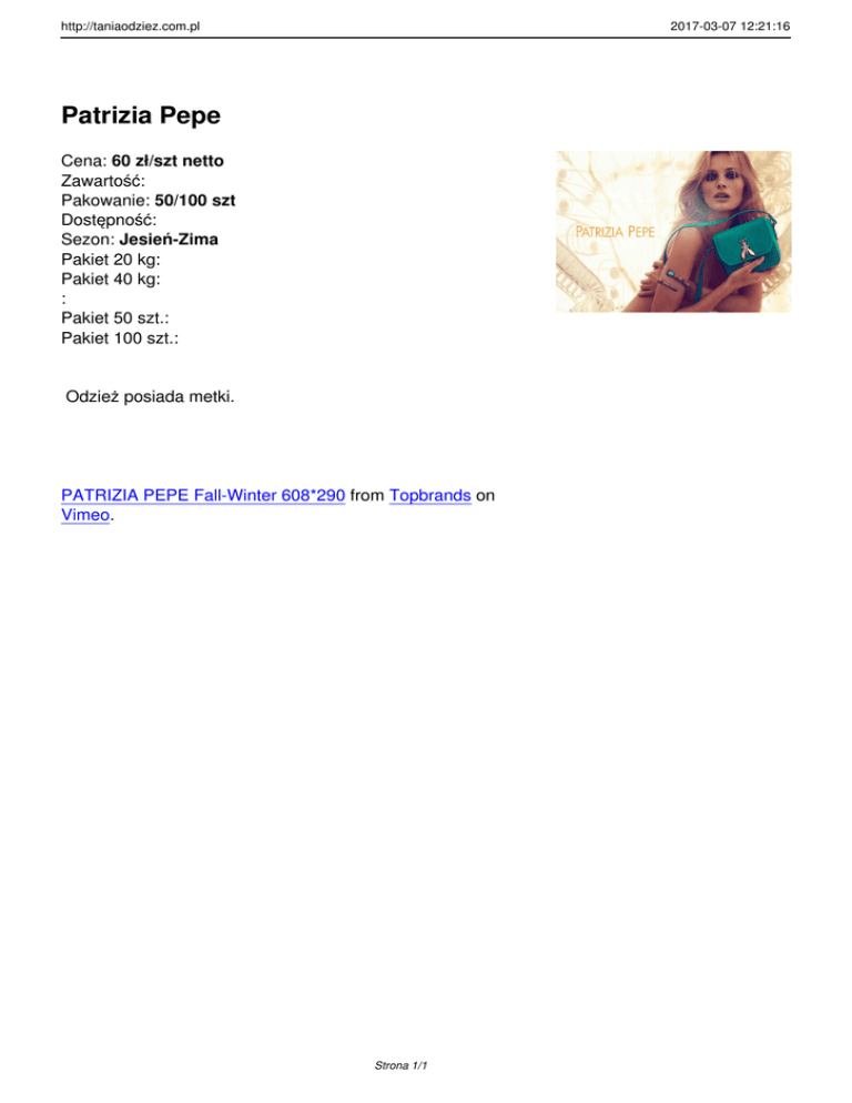 http://taniaodziez.com.pl 2017-03-07 12:21:16 Patrizia Pepe Cena: 60 zł/szt netto Zawartość: Pakowanie: 50/100 szt Dostępność: Sezon: Jesień-Zima Pakiet 20 kg: Pakiet 40 kg: : Pakiet 50 szt.: Pakiet 100 szt.: Odzież posiada metki. PATRIZIA PEPE Fall-Winter 608*290 from Topbrands on Vimeo. Strona 1/1