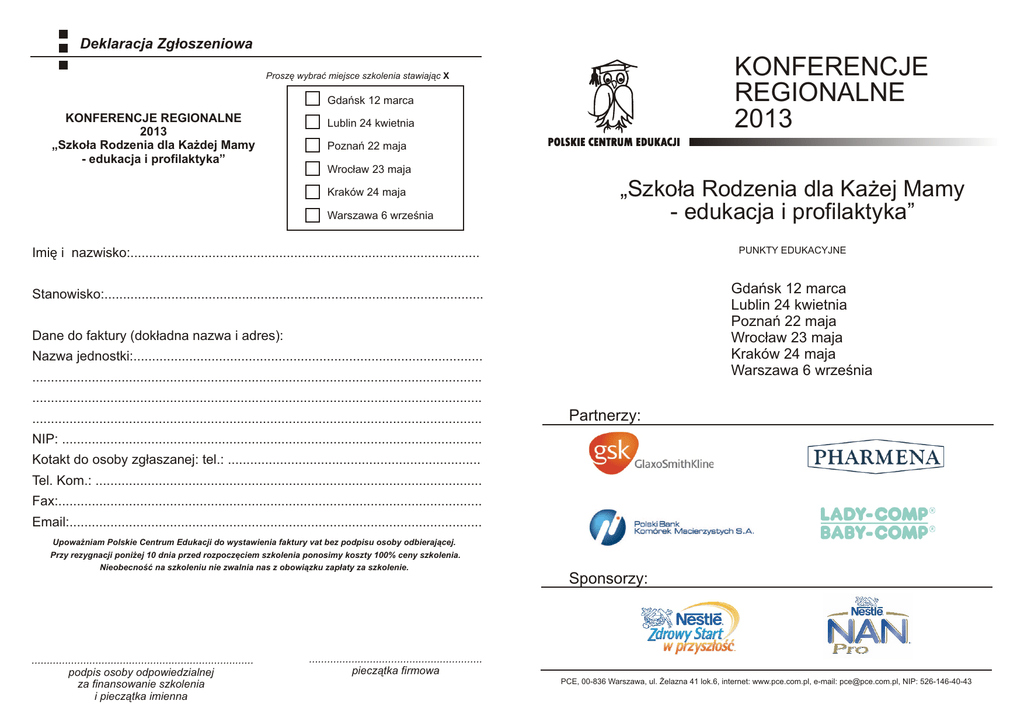 Deklaracja Zgłoszeniowa KONFERENCJE REGIONALNE 2013 Proszę wybrać miejsce szkolenia stawiając X Gdańsk 12 marca KONFERENCJE REGIONALNE 2013 „Szkoła Rodzenia dla Każdej Mamy - edukacja i profilaktyka” Lublin 24 kwietnia Poznań 22 maja Wrocław 23 maja Kraków 24 maja Warszawa 6 września „Szkoła Rodzenia dla Każej Mamy - edukacja i profilaktyka” PUNKTY EDUKACYJNE Imię i nazwisko:.............................................................................................. Gdańsk 12 marca Lublin 24 kwietnia Poznań 22 maja Wrocław 23 maja Kraków 24 maja Warszawa 6 września Stanowisko:...................................................................................................... Dane do faktury (dokładna nazwa i adres): Nazwa jednostki:.............................................................................................. ......................................................................................................................... ......................................................................................................................... ......................................................................................................................... Partnerzy: NIP: ................................................................................................................. Kotakt do osoby zgłaszanej: tel.: .................................................................... Tel. Kom.: ........................................................................................................ Fax:.................................................................................................................. Email:............................................................................................................... Upoważniam Polskie Centrum Edukacji do wystawienia faktury vat bez podpisu osoby odbierającej. Przy rezygnacji poniżej 10 dnia przed rozpoczęciem szkolenia ponosimy koszty 100% ceny szkolenia. Nieobecność na szkoleniu nie zwalnia nas z obowiązku zapłaty za szkolenie. Sponsorzy: ......................................................................... podpis osoby odpowiedzialnej za finansowanie szkolenia i pieczątka imienna ......................................................... pieczątka firmowa PCE, 00-836 Warszawa, ul. Żelazna 41 lok.6, internet: www.pce.com.pl, e-mail: [email protected], NIP: 526-146-40-43 Program Informacje Organizacyjne Opłata szkoleniowa: Dla pierwszych 50 zgłoszeń tylko opłata za wpisowe 28 zł.* 9:15 kawa powitalna, rejestracja uczestników i zwiedzanie stoisk *powyższa promocja dotyczy jedynie położnych pracujących w szkołach rodzenia 9: 45 otwarcie konferencji, przedstawienie partnerów 55 zł dla pozostałych położnych (poza limitem) pracujących w szkołach rodzenia i 9:50-10:40 “Pobieranie krwi pępowinowej - ważna decyzja w życiu kobiety” - lek. Tomasz Baran, Polski Bank Komórek Macierzystych położnych rodzinnych Pozostałe zawody - opłata 120 zł. 10:40-10:55 prezentacja firmy Nestle 10:55-11:25 “Nowoczesne rozwiązania starych problemów: urządzenia medyczne kontra antykoncepcja i nietrzymanie moczu” dr Krzystof Michaluk W cenie: udział, materiały merytoryczne, materiały konferencyjne, przerwy kawowe, certyfikaty edukacyjne. 11:25-12:00 przerwa kawowa 12:00-12:50 “Kilka przykładów przyczyn płaczu i niepokoju noworodka i sposoby zapobiegania - czyli klasyczne niepokoje młodych rodziców, dlaczego dziecko płacze” - mgr Bożena Kierył, terapeuta rozwoju psychomotorycznego, PCE Warszawa LICZY SIĘ KOLEJNOŚĆ ZGŁOSZEŃ 12:50-13:00 prezentacja firmy Pharmena 13:00-13:30 przerwa kawowo-kanapkowa 13:30-14:30 “Świadomy rodzic, mądra decyzja. Prawdy, mity i kontrowersje wokół szczepień ochronnych” - dr n. med. Paweł Grzesiowski, pediatra, Szef zespołu kontroli zakażeń w szpitalu Specjalistycznym św. Zofii, Prezes Fundacji Instytutu Profilaktyki Zakażeń 14:30-14:40 przerwa 14:40-15:25 “Żywienie w ciąży i w okresie karmienia piersią” - dr n. med. Magdalena Pieszko, Zakład Żywienia Klinicznego i Dietetyki, Katedra Żywienia Klinicznego Gdańskiego Uniwersytetu Medycznego 15:25-15:35 omówienie bieżących potrzeb edukacyjnych 15:35 rozdanie certyfikatów, zamknięcie konferencji Gdańsk, 12 marca Hotel Scandic, ul. Podwale Grodzkie 9 Lublin, 24 kwietnia Hotel Victoria, ul. Narutowicza 58/60 Poznań, 22 maja Hotel Ikar, ul. Kościuszki 118 Wrocław, 23 maja Hotel Vega, ul. Grabiszyńska 251 Kraków, 24 maja Hotel Europejski, ul. Lublicz 5 Warszawa, 6 września miejsce w trakcie ustalania Wypełnioną Deklarację Zgłoszeniową należy przesłać: pocztą na adres: PCE, 00-836 Warszawa, ul. Żelazna 41 lok. 6 lub faksem na nr tel.: (22) 890 20 01, 890 20 02 lub pocztą elektroniczną na adres: [email protected] lub przez stronę www.pce.com.pl PŁATNOŚĆ ZA SZKOLENIE NALEŻY UIŚCIĆ PRZELEWEM: przed szkoleniem NA KONTO: POLSKIE CENTRUM EDUKACJI MILLENNIUM BIG BANK S.A. Warszawa 32116022020000000027317659 Na przelewie prosimy umieścić nazwisko uczestnika oraz termin szkolenia.