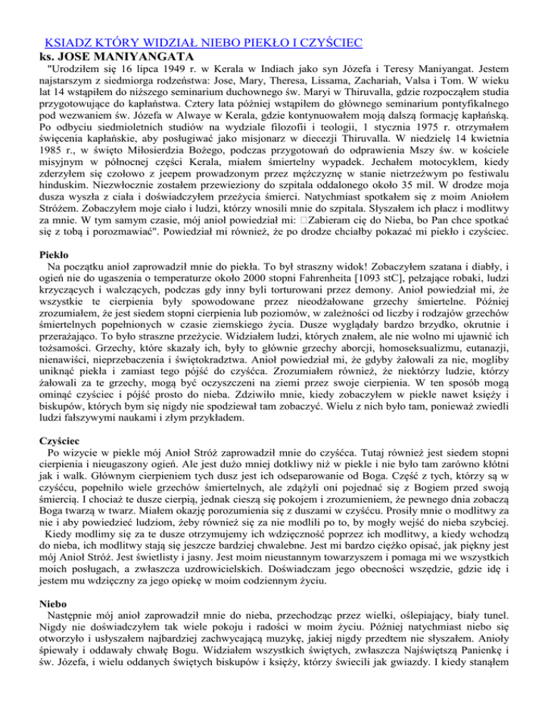 KSIADZ KTÓRY WIDZIAŁ NIEBO PIEKŁO I CZYŚCIEC ks. JOSE MANIYANGATA "Urodziłem się 16 lipca 1949 r. w Kerala w Indiach jako syn Józefa i Teresy Maniyangat. Jestem najstarszym z siedmiorga rodzeństwa: Jose, Mary, Theresa, Lissama, Zachariah, Valsa i Tom. W wieku lat 14 wstąpiłem do niższego seminarium duchownego św. Maryi w Thiruvalla, gdzie rozpocząłem studia przygotowujące do kapłaństwa. Cztery lata później wstąpiłem do głównego seminarium pontyfikalnego pod wezwaniem św. Józefa w Alwaye w Kerala, gdzie kontynuowałem moją dalszą formację kapłańską. Po odbyciu siedmioletnich studiów na wydziale filozofii i teologii, 1 stycznia 1975 r. otrzymałem święcenia kapłańskie, aby posługiwać jako misjonarz w diecezji Thiruvalla. W niedzielę 14 kwietnia 1985 r., w święto Miłosierdzia Bożego, podczas przygotowań do odprawienia Mszy św. w kościele misyjnym w północnej części Kerala, miałem śmiertelny wypadek. Jechałem motocyklem, kiedy zderzyłem się czołowo z jeepem prowadzonym przez mężczyznę w stanie nietrzeźwym po festiwalu hinduskim. Niezwłocznie zostałem przewieziony do szpitala oddalonego około 35 mil. W drodze moja dusza wyszła z ciała i doświadczyłem przeżycia śmierci. Natychmiast spotkałem się z moim Aniołem Stróżem. Zobaczyłem moje ciało i ludzi, którzy wnosili mnie do szpitala. Słyszałem ich płacz i modlitwy za mnie. W tym samym czasie, mój anioł powiedział mi: �Zabieram cię do Nieba, bo Pan chce spotkać się z tobą i porozmawiać". Powiedział mi również, że po drodze chciałby pokazać mi piekło i czyściec. Piekło Na początku anioł zaprowadził mnie do piekła. To był straszny widok! Zobaczyłem szatana i diabły, i ogień nie do ugaszenia o temperaturze około 2000 stopni Fahrenheita [1093 stC], pełzające robaki, ludzi krzyczących i walczących, podczas gdy inny byli torturowani przez demony. Anioł powiedział mi, że wszystkie te cierpienia były spowodowane przez nieodżałowane grzechy śmiertelne. Później zrozumiałem, że jest siedem stopni cierpienia lub poziomów, w zależności od liczby i rodzajów grzechów śmiertelnych popełnionych w czasie ziemskiego życia. Dusze wyglądały bardzo brzydko, okrutnie i przerażająco. To było straszne przeżycie. Widziałem ludzi, których znałem, ale nie wolno mi ujawnić ich tożsamości. Grzechy, które skazały ich, były to głównie grzechy aborcji, homoseksualizmu, eutanazji, nienawiści, nieprzebaczenia i świętokradztwa. Anioł powiedział mi, że gdyby żałowali za nie, mogliby uniknąć piekła i zamiast tego pójść do czyśćca. Zrozumiałem również, że niektórzy ludzie, którzy żałowali za te grzechy, mogą być oczyszczeni na ziemi przez swoje cierpienia. W ten sposób mogą ominąć czyściec i pójść prosto do nieba. Zdziwiło mnie, kiedy zobaczyłem w piekle nawet księży i biskupów, których bym się nigdy nie spodziewał tam zobaczyć. Wielu z nich było tam, ponieważ zwiedli ludzi fałszywymi naukami i złym przykładem. Czyściec Po wizycie w piekle mój Anioł Stróż zaprowadził mnie do czyśćca. Tutaj również jest siedem stopni cierpienia i nieugaszony ogień. Ale jest dużo mniej dotkliwy niż w piekle i nie było tam zarówno kłótni jak i walk. Głównym cierpieniem tych dusz jest ich odseparowanie od Boga. Część z tych, którzy są w czyśćcu, popełniło wiele grzechów śmiertelnych, ale zdążyli oni pojednać się z Bogiem przed swoją śmiercią. I chociaż te dusze cierpią, jednak cieszą się pokojem i zrozumieniem, że pewnego dnia zobaczą Boga twarzą w twarz. Miałem okazję porozumienia się z duszami w czyśćcu. Prosiły mnie o modlitwy za nie i aby powiedzieć ludziom, żeby również się za nie modlili po to, by mogły wejść do nieba szybciej. Kiedy modlimy się za te dusze otrzymujemy ich wdzięczność poprzez ich modlitwy, a kiedy wchodzą do nieba, ich modlitwy stają się jeszcze bardziej chwalebne. Jest mi bardzo ciężko opisać, jak piękny jest mój Anioł Stróż. Jest świetlisty i jasny. Jest moim nieustannym towarzyszem i pomaga mi we wszystkich moich posługach, a zwłaszcza uzdrowicielskich. Doświadczam jego obecności wszędzie, gdzie idę i jestem mu wdzięczny za jego opiekę w moim codziennym życiu. Niebo Następnie mój anioł zaprowadził mnie do nieba, przechodząc przez wielki, oślepiający, biały tunel. Nigdy nie doświadczyłem tak wiele pokoju i radości w moim życiu. Później natychmiast niebo się otworzyło i usłyszałem najbardziej zachwycającą muzykę, jakiej nigdy przedtem nie słyszałem. Anioły śpiewały i oddawały chwałę Bogu. Widziałem wszystkich świętych, zwłaszcza Najświętszą Panienkę i św. Józefa, i wielu oddanych świętych biskupów i księży, którzy świecili jak gwiazdy. I kiedy stanąłem przed Panem, Jezus powiedział: "Chcę żebyś wrócił na ziemię. W twoim "drugim" życiu będziesz instrumentem uzdrawiania i pokoju dla Moich ludzi. Pójdziesz do obcego kraju i będziesz mówił obcym językiem. Z Moją łaską wszystko dla ciebie będzie możliwe". Po tych słowach Najświętsza Maria Panna powiedziała mi: "Zrób, cokolwiek ci powie. Ja ci pomogę w twoim duszpasterzowaniu". Słowa nie mogą wyrazić piękności nieba. Tam znajdziemy tak dużo pokoju i szczęścia, co przekracza miliony razy nasze wyobrażenia. Nasz Pan jest dużo bardziej piękniejszy, niż może to ukazać jakikolwiek wizerunek. Jego twarz jest promieniująca i świetlista, i dużo bardziej piękniejsza niż tysiąc wschodzących słońc. Obrazki, które widzimy w naszym świecie, są tylko cieniem Jego wspaniałości. Najświętsza Maria Panna stała obok Jezusa; była bardzo piękna i promieniująca. Żadnego z wizerunków, jakie znamy na świecie, nie można porównać z Jej prawdziwą pięknością. Niebo jest naszym prawdziwym domem; wszyscy jesteśmy stworzeni, aby osiągnąć niebo i cieszyć się Bogiem na wieki.