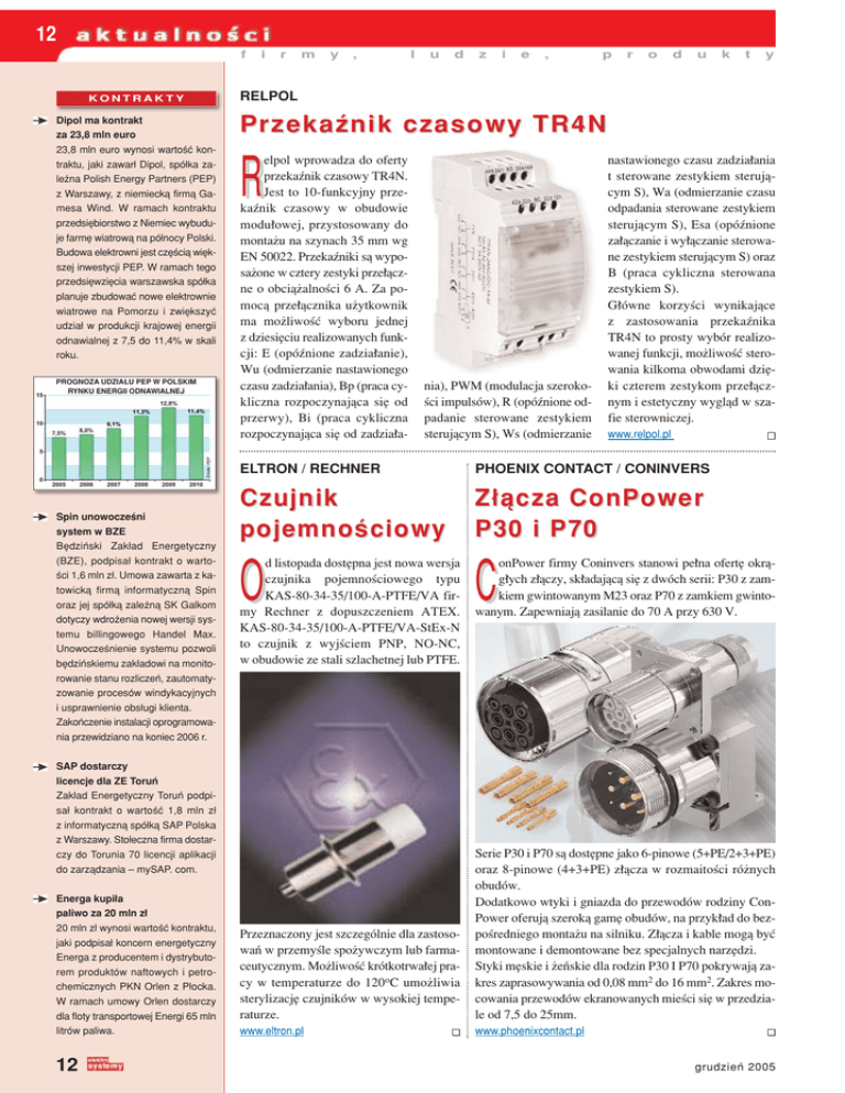 12 f KONTRAKTY Dipol ma kontrakt za 23,8 mln euro 23,8 mln euro wynosi wartoúÊ kontraktu, jaki zawar≥ Dipol, spÛ≥ka zaleøna Polish Energy Partners (PEP) z Warszawy, z niemieckπ firmπ Gamesa Wind. W ramach kontraktu przedsiÍbiorstwo z Niemiec wybuduje farmÍ wiatrowπ na pÛ≥nocy Polski. Budowa elektrowni jest czÍúciπ wiÍkszej inwestycji PEP. W ramach tego przedsiÍwziÍcia warszawska spÛ≥ka planuje zbudowaÊ nowe elektrownie wiatrowe na Pomorzu i zwiÍkszyÊ udzia≥ w produkcji krajowej energii odnawialnej z 7,5 do 11,4% w skali roku. PROGNOZA UDZIA£U PEP W POLSKIM RYNKU ENERGII ODNAWIALNEJ i r m y , l u d z i e , p r o d u k t y RELPOL Przekaünik czasowy TR4N R elpol wprowadza do oferty przekaünik czasowy TR4N. Jest to 10-funkcyjny przekaünik czasowy w obudowie modu≥owej, przystosowany do montaøu na szynach 35 mm wg EN 50022. Przekaüniki sπ wyposaøone w cztery zestyki prze≥πczne o obciπøalnoúci 6 A. Za pomocπ prze≥πcznika uøytkownik ma moøliwoúÊ wyboru jednej z dziesiÍciu realizowanych funkcji: E (opÛünione zadzia≥anie), Wu (odmierzanie nastawionego czasu zadzia≥ania), Bp (praca cykliczna rozpoczynajπca siÍ od przerwy), Bi (praca cykliczna rozpoczynajπca siÍ od zadzia≥a- nia), PWM (modulacja szerokoúci impulsÛw), R (opÛünione odpadanie sterowane zestykiem sterujπcym S), Ws (odmierzanie nastawionego czasu zadzia≥ania t sterowane zestykiem sterujπcym S), Wa (odmierzanie czasu odpadania sterowane zestykiem sterujπcym S), Esa (opÛünione za≥πczanie i wy≥πczanie sterowane zestykiem sterujπcym S) oraz B (praca cykliczna sterowana zestykiem S). G≥Ûwne korzyúci wynikajπce z zastosowania przekaünika TR4N to prosty wybÛr realizowanej funkcji, moøliwoúÊ sterowania kilkoma obwodami dziÍki czterem zestykom prze≥πcznym i estetyczny wyglπd w szafie sterowniczej. www.relpol.pl ELTRON / RECHNER PHOENIX CONTACT / CONINVERS Czujnik pojemnoúciowy Z≥πcza ConPower P30 i P70 O onPower firmy Coninvers stanowi pe≥na ofertÍ okrπg≥ych z≥πczy, sk≥adajπcπ siÍ z dwÛch serii: P30 z zamkiem gwintowanym M23 oraz P70 z zamkiem gwintowanym. Zapewniajπ zasilanie do 70 A przy 630 V. dla floty transportowej Energi 65 mln Przeznaczony jest szczegÛlnie dla zastosowaÒ w przemyúle spoøywczym lub farmaceutycznym. MoøliwoúÊ krÛtkotrwa≥ej pracy w temperaturze do 120oC umoøliwia sterylizacjÍ czujnikÛw w wysokiej temperaturze. Serie P30 i P70 sπ dostÍpne jako 6-pinowe (5+PE/2+3+PE) oraz 8-pinowe (4+3+PE) z≥πcza w rozmaitoúci rÛønych obudÛw. Dodatkowo wtyki i gniazda do przewodÛw rodziny ConPower oferujπ szerokπ gamÍ obudÛw, na przyk≥ad do bezpoúredniego montaøu na silniku. Z≥πcza i kable mogπ byÊ montowane i demontowane bez specjalnych narzÍdzi. Styki mÍskie i øeÒskie dla rodzin P30 I P70 pokrywajπ zakres zaprasowywania od 0,08 mm2 do 16 mm2. Zakres mocowania przewodÛw ekranowanych mieúci siÍ w przedziale od 7,5 do 25mm. litrÛw paliwa. www.eltron.pl www.phoenixcontact.pl Spin unowoczeúni system w BZE BÍdziÒski Zak≥ad Energetyczny (BZE), podpisa≥ kontrakt o wartoúci 1,6 mln z≥. Umowa zawarta z katowickπ firmπ informatycznπ Spin oraz jej spÛ≥kπ zaleønπ SK Galkom dotyczy wdroøenia nowej wersji systemu billingowego Handel Max. Unowoczeúnienie systemu pozwoli bÍdziÒskiemu zak≥adowi na monito- d listopada dostÍpna jest nowa wersja czujnika pojemnoúciowego typu KAS-80-34-35/100-A-PTFE/VA firmy Rechner z dopuszczeniem ATEX. KAS-80-34-35/100-A-PTFE/VA-StEx-N to czujnik z wyjúciem PNP, NO-NC, w obudowie ze stali szlachetnej lub PTFE. C rowanie stanu rozliczeÒ, zautomatyzowanie procesÛw windykacyjnych i usprawnienie obs≥ugi klienta. ZakoÒczenie instalacji oprogramowania przewidziano na koniec 2006 r. SAP dostarczy licencje dla ZE ToruÒ Zak≥ad Energetyczny ToruÒ podpisa≥ kontrakt o wartoúÊ 1,8 mln z≥ z informatycznπ spÛ≥kπ SAP Polska z Warszawy. Sto≥eczna firma dostarczy do Torunia 70 licencji aplikacji do zarzπdzania ñ mySAP. com. Energa kupi≥a paliwo za 20 mln z≥ 20 mln z≥ wynosi wartoúÊ kontraktu, jaki podpisa≥ koncern energetyczny Energa z producentem i dystrybutorem produktÛw naftowych i petrochemicznych PKN Orlen z P≥ocka. W ramach umowy Orlen dostarczy 12 grudzieÒ 2005