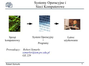 Systemy Operacyjne i Sieci Komputerowe Sprzęt komputerowy Prowadzący: Robert Szmurło System Operacyjny + Programy Łatwe użytkowanie Robert Szmurło [email protected] GE 229 1 Systemy operacyjne od strony architekta – Architektury systemów operacyjnych – Urządzenia wejścia-wyjścia – Zarządzanie pamięcią – Zarządzanie procesami – Wątki Robert Szmurło 2 Architektury SO ● Jednolita ● Warstwowa ● Klient-Serwer Robert Szmurło 3 Jednolita Robert Szmurło 4 Warstwowa Robert Szmurło 5 Klient-serwer Robert Szmurło 6 Urządzenia wejścia-wyjścia ● ● ● ● ● urządzenia pamięci (dyski, taśmy, pamięci trwałe) urządzenia przesyłania danych (karty sieciowe, modemy) urządzenia interfejsu człowieka (monitory, klawiatury, myszki, drukarki) urządzenia specjalne (dane pomiarowe, sterowanie robotami) urządzenia multimedialne (karty dźwiękowe, mikrofony, karty TV, kamery) Robert Szmurło 7 Właściwości urządzeń We/Wy ● ● ● Tryb przesyłania danych: – znakowy – przesyłane jest po kolei bajt po bajcie (przykład klawiatura, często występuje bufor) – blokowy – przesyłane całe bloki danych (przykład sektor dysku twardego, ramka komuniatu w karcie sieciowej) Sposób dostępu do danych: – sekwencyjny – dostęp do danych w określonej kolejności, aby odczytać ostatni bajt musimy wczytać cały strumień danych (przykład taśma z backupem) – swobodny – mamy dostęp do wolnej informacji poprzez pozycję w strumieniu danych (przykład: sektor dysku twardego) Organizacja przesyłania: – asynchroniczna – dane przekazywane są z góry znanym czasie – synchroniczna – dane moga pojawić się w dowolnym momencie. Robert Szmurło 8 Właściwości urządzeń We/Wy ● ● Tryb użytkowania: – współdzielony — dopuszczalne jest współbieżne używanie urządzenia przez wiele procesów, np.: dysk – wyłączny — niemożliwe jest współbieżne używanie urządzenia przez wiele procesów, przykład: drukarka Kierunek przesyłania danych: – Tylko do odczytu – Tylko do zapisu – Do zapisu i odczytu Robert Szmurło 9 Schemat komunikacji z urzadzeniami Robert Szmurło 10 Punkty komunikacyjne / pośredniczące ● ● Czyli to co łączy system operacyjny z urządzeniami. Port - jedno urządzenie wykorzystuje fizyczną wiązkę przewodów – ● (FireWire, USB, RS 232 – port szeregowy, LPT – port równoległy, BlueTooth) Magistrala (szyna komunikacyjna) – do jednej wiązki przewodów dołączonych jest kilka urzadzeń. – skomplikowana praca – wymaga specjalnego układu zarządzającego komunikacją Robert Szmurło 11 Szyna komunikacyjna Robert Szmurło 12 Typy szyn komunikacyjnych ● ● ● Szyna komunikacyjna ISA lub AT BUS - (ang. Industry Standard Architecture) Prędkość: 1.5-1.8 MB/s (MB - megabity), Słowo: 16bitów, Zegar: 16MHz Szyna PCI (ang. Peripheral Component Interconnect - Wprowadzona w 1993r), Prędkość: 133 MB/s, Słowo: 32bity, Zegar 33MHz, Zasilanie, AGP (ang. Accelerated Graphics Port) - Interfejs umożliwia karcie graficznej używać wyodrębnionego obszaru pamięci operacyjnej w takiej postaci jakby karta graficzna korzystała z niego jak z pamięci podręcznej. – AGP - przepustowość: 266 MB/s – AGP 2 - przepustowość: 533 MB/s – AGP 4 - przepustowość: 1066 MB/s Robert Szmurło 13 Struktura We/Wy ● Synchroniczny – ● Po rozpoczęciu procedury We/Wy program użytkownika odzyskuje kontrolę po zakończeniu wymiany informacji We/Wy. Asynchroniczny – Po rozpoczęciu procedury We/Wy program uzytkownika odzyskuje natychmiast kontrolę. – System komputerowy musi posiadać tablicę urządzeń, która będzie przechowywac aktualny stan (idle-wolny lub busy-zajęty). Robert Szmurło 14 Jak przebiega komunikacja systemu operacyjnego z urządzeniami? ● ● Komunikacja za pomocą portów – rejestry sterownika (porty) widoczne są w przestrzeni adresowej wejściawyjścia systemu komputerowego i dostępne są przez specjalne rozkazy (np. in i out w procesorach firmy Intel). (Dla magistral ISA 16 bitów) Komunikacja tylko za pośrednictwem procesora! – odwzorowanie w przestrzeni adresowej pamięci — rejestry sterownika widoczne są w przestrzeni adresowej pamięci fizycznej i dostępne są pod odpowiednimi adresami tak samo, jak inne komórki pamięci. Bezpośredni dostęp do pamięci (DMA – Direct Memory Access) – Używane dla urządzeń o dużej prędkości transferu danych (prędkość zbliżona do prędkości dostępu do pamięci) – Kontroler urządzenia po inicjalizacji wykonanej przez procesor , samodzielnie wykonuje transfer danych z bufora bezpośrednio do pamięci. – Przerwanie jest generowane co przesłany blok danych a nie co każdy bajt. Robert Szmurło 15 Bezpośredni dostęp do pamięci: DMA – źródło przesyłania (sterownik urządzenia czy bufor w pamięci) – wskaźnik do miejsca w pamięci (bufor) – liczba bajtów do przesłania Robert Szmurło 16 Tryby sprawdzania gotowości danych do odczytu-zapisu ● Poprzez odpytywanie (polling) - które polega na tym że procesor w odstępach czasowych sprawdza odpowiednie bity w rejestrze każdego sterownika. – metoda mało wydajna, obciążenie procesora – bufor sterownika może się zapełnić, – ● mało wydajny algorytm gdy odpytywanie musi być realizowane zbyt często. Przerwania - w momencie urządzenie posiada dane, do odczytania przez procesor zgłasza do niego przerwanie. – przerwania niemaskowalne – przerwania maskowalne (używane przez urządzenia do zgłaszania żądań obsługi) Robert Szmurło 17 Odpytywanie Robert Szmurło 18 Przerwania Robert Szmurło 19 Przerwania ● ● ● ● ● ● Przerwanie przekazuje sterowanie do procedury obsługi przerwania, zazwyczaj poprzez tablicę wektorów przerwań. Architektura przerwań musi zachować adres procedury w którym nastąpiło przerwanie. Przerwania są zablokowane podczas wykonywania procedury obsługi innego przerwania (przerw