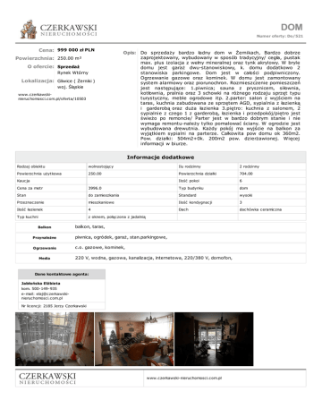 DOM Numer oferty: Do/521 Cena: 999 000 zł PLN Powierzchnia: 250.00 m² O ofercie: Sprzedaż Rynek Wtórny Lokalizacja: Gliwice ( Żerniki ) woj. Śląskie www.czerkawskinieruchomosci.com.pl/oferta/10503 Opis: Do sprzedaży bardzo ładny dom w Żernikach, Bardzo dobrze zaprojektowany, wybudowany w sposób tradycyjny/ cegła, pustak max. plus izolacja z wełny mineralnej oraz tynk akrylowy. W bryle domu jest garaż dwu-stanowiskowy, k. domu dodatkowo 2 stanowiska parkingowe. Dom jest w całości podpiwniczony. Ogrzewanie gazowe oraz kominek. W domu jest zamontowany system alarmowy oraz piorunochron. Rozmieszczenie pomieszczeń jest następujące: 1.piwnica; sauna z prysznicem, siłownia, kotłownia, pralnia oraz 3 schowki na różnego rodzaju sprzęt typu turystyczny, meble ogrodowe itp. 2.parter: salon z wyjściem na taras, kuchnia zabudowana ze sprzętem AGD, sypialnia z łazienką i garderobą oraz duża łazienka 3.piętro: kuchnia z salonem, 2 sypialnie z czego 1 z garderobą, łazienka i przedpokój/piętro jest świeżo po remoncie/ Parter jest w bardzo dobrym stanie i nie wymaga remontu-należy tylko pomalować ściany. W ogrodzie jest wybudowana drewutnia. Każdy pokój ma wyjście na balkon za wyjątkiem sypialni na parterze. Całkowita pow domu ok 360m2. Pow. działki: 504m2+0k. 200m2 pow. dzierżawionej. Więcej informacji w biurze. Informacje dodatkowe Rodzaj obiektu wolnostojący Ilu rodzinny 2 rodzinny Powierzchnia użytkowa 250.00 Powierzchnia działki 704.00 Kaucja Ilość pokoi 6 Cena za metr 3996.0 Typ budynku dom Stan do zamieszkania Standard wysoki Przeznaczenie mieszkaniowe Ilość kondygnacji 3 Ilość łazienek 4 Dach dachówka ceramiczna Typ kuchni z oknem, połączona z jadalnią Balkon balkon, taras, Przynależne piwnica, ogródek, garaż, stan.parkingowe, Ogrzewanie c.o. gazowe, kominek, Media 220 V, wodna, gazowa, kanalizacja, internetowa, 220/380 V, domofon, Dane kontaktowe agenta: Jabłońska Elżbieta kom. 500-149-935 e-mail: [email protected] Nr licencji: 2185 Jerzy Czerkawski www.czerkawski-nieruchomosci.com.pl