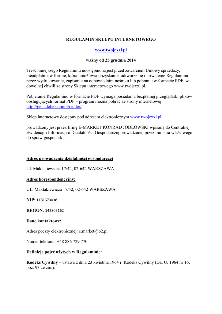 REGULAMIN SKLEPU INTERNETOWEGO www.twojexxl.pl ważny od 25 grudnia 2014 Treść niniejszego Regulaminu udostępniona jest przed zawarciem Umowy sprzedaży, nieodpłatnie w formie, która umożliwia pozyskanie, odtworzenie i utrwalenie Regulaminu przez wydrukowanie, zapisanie na odpowiednim nośniku lub pobranie w formacie PDF, w dowolnej chwili ze strony Sklepu internetowego www.twojexxl.pl. Pobieranie Regulaminu w formacie PDF wymaga posiadania bezpłatnej przeglądarki plików obsługujących format PDF – program można pobrać ze strony internetowej http://get.adobe.com/pl/reader/ Sklep internetowy dostępny pod adresem elektronicznym www.twojexxl.pl prowadzony jest przez firmę E-MARKET KONRAD JODŁOWSKI wpisaną do Centralnej Ewidencji i Informacji o Działalności Gospodarczej prowadzonej przez ministra właściwego do spraw gospodarki. Adres prowadzenia działalności gospodarczej Ul. Maklakiewicza 17/42, 02-642 WARSZAWA Adres korespondencyjny: UL. Maklakiewicza 17/42, 02-642 WARSZAWA NIP: 1181673038 REGON: 142805162 Dane kontaktowe: Adres poczty elektronicznej: [email protected] Numer telefonu: +48 886 729 770 Definicje pojęć użytych w Regulaminie: Kodeks Cywilny – ustawa z dnia 23 kwietnia 1964 r. Kodeks Cywilny (Dz. U. 1964 nr 16, poz. 93 ze zm.). Konsument – zgodnie z art. 221 ustawy z dnia 23 kwietnia 1964 Kodeksu Cywilnego osoba fizyczna dokonująca ze Sprzedawcą czynności prawnej niezwiązanej bezpośrednio z jej działalnością gospodarczą lub zawodową. Produkt/Towar – rzecz ruchoma będąca przedmiotem umowy sprzedaży między Konsumentem a Sprzedawcą. Regulamin – niniejszy regulamin Sklepu internetowego. Sklep internetowy – Sklep internetowy prowadzony przez Sprzedawcę pod adresem elektronicznym www.twojexxl.pl Sprzedawca – E-MARKET KONRAD JODŁOWSKI prowadzący działalność gospodarczą pod adresem: MAKLAKIEWICZA 17/42, 02-642 WARSZAWA działający na podstawie wpisu do Centralnej Ewidencji i Informacji o Działalności Gospodarczej prowadzonej przez ministra właściwego do spraw gospodarki, NIP 1181673038 , REGON 142805162 adres poczty elektronicznej: [email protected], numer telefonu + 48 886 729 770 Umowa sprzedaży - umowa sprzedaży zawierana za pośrednictwem Sklepu internetowego między Konsumentem a Sprzedawcą. Ustawa o prawach konsumenta – ustawa z dnia 30 maja 2014 r. o prawach konsumenta (Dz. U. 2014 poz. 827) §I Postanowienia ogólne 1. Niniejszy Regulamin określa ogólne zasady oraz sposób sprzedaży prowadzonej przez firmę E-MARKET KONRAD JODŁOWSKI za pośrednictwem Sklepu internetowego dostępnego pod adresem elektronicznym www.twojexxl.pl 2. Konsument nie może zrzec się praw przyznanych mu w Ustawie o prawach konsumenta. Postanowienia umów mniej korzystne dla Konsumenta niż postanowienia ustawy są nieważne, a w ich miejsce stosuje się przepisy ustawy. § II Warunki zawierania umowy sprzedaży 1. Ogłoszenia, reklamy, cenniki i inne informacje o Towarach podane na stronach Sklepu internetowego, w szczególności ich opisy, parametry techniczne i użytkowe oraz ceny stanowią zaproszenie do zawarcia umowy, w rozumieniu art. 71 ustawy z dnia 23 kwietnia 1964 r. Kodeks Cywilny. 2. Konsument może składać zamówienia na Produkty dostępne w asortymencie Sklepu internetowego www.twojexxl.pl przez siedem dni w tygodniu, dwadzieścia cztery godziny w ciągu doby. 3. Konsument ma możliwość złożenia zamówienia za pomocą następujących metod: - zamówienie przez sklep internetowy www.twojexxl.pl - zamówienie przez wysłanie maila na adres: [email protected] - zamówienie telefoniczne dzwoniąc na numer + 48 886 729 770 4. W celu realizacji zamówienia prosimy o podanie następujących danych: imię i nazwisko, adres wysyłki, numer telefonu 5. Cena towaru uwidoczniona na stronie sklepu internetowego www.twojexxl.pl wyrażona jest w złotych polskich i zawiera podatki. 6. O łącznej cenie wraz z podatkami za towar jak również o kosztach dostawy oraz innych kosztach, a gdy nie można ustalić wysokości tych opłat – o obowiązku ich uiszczenia, Konsument jest informowany podczas składania zamówienia a także w chwili wyrażenia przez Konsumenta woli związania się umową sprzedaży. 7. Po złożeniu przez Konsumenta zamówienia, Sprzedawca potwierdza jego otrzymanie. Potwierdzenie otrzymania zamówienia wraz z podaniem wszystkich istotnych składników zamówienia następuje poprzez przesłanie Konsumentowi wiadomości e-mail. Z chwilą otrzymania przez Konsumenta powyższej wiadomości e-mail zostaje zawarta Umowa sprzedaży pomiędzy Konsumentem a Sprzedawcą. § III Sposoby płatności za towar 1. Konsument może wybrać następujące formy płatności za towar: pobranie – POCZTA POLSKA - płatność u listonosza przy dostarczeniu przesyłki pobranie – kurier UPS lub POCZTEX– płatność u kuriera przy dostarczeniu przesyłki list polecony ekonomiczny – POCZTA POLSKA kurier UPS lub POCZTEX przesyłka międzynarodowa – wysyłka listem poleconym priorytetowym POCZTA POLSKA 2. Zapłaty przelewem należy dokonać na podany rachunek bankowy: ING BANK ŚLĄSKI nr konta 23 1050 1025 1000 0090 7832 0273 § IV Terminy płatności za Towar 1. W przypadku wyboru płatności „przelew bankowy”, Konsument jest zobowiązany dokonać płatności w terminie do 7 dni od dnia zawarcia Umowy sprzedaży. 2. W przypadku „płatności za pobraniem”, płatność następuje w momencie doręczenia przesyłki i opłaceniu wymaganej kwoty do rąk kuriera lub listonosza. . §V Sposoby dostawy 1. Dostawa zamówionych Towarów odbywa się poprzez przekazanie towaru za pośrednictwem jednego z dostępnych przewoźników: POCZTA POLSKA, KURIER UPS i POCZTEX 2. Wybór sposobu dostawy jest dokonywany przez Konsumenta w trakcie składania zamówienia. 3. Dostawa Towaru odbywa się na terytorium Rzeczypospolitej Polskiej oraz do pozostałych państw świata. § VI Termin dostawy 1. W przypadku wybrania danego przewoźnika