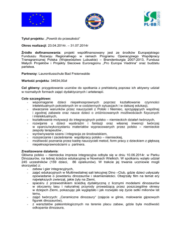 Tytuł projektu: „Powrót do przeszłości“ Okres realizacji: 23.04.2014r. – 31.07.2014r Źródło dofinansowania: projekt współfinansowany jest ze środków Europejskiego Funduszu Rozwoju Regionalnego w ramach Programu Operacyjnego Współpracy Transgranicznej Polska (Województwo Lubuskie) – Brandenburgia 2007-2013, Fundusz Małych Projektów i Projekty Sieciowe Euroregionu „Pro Europa Viadrina” oraz budżetu państwa. Partnerzy: Laurentiusschule Bad Freienwalde Wartość projektu: 34634,00zł Cel główny: przygotowanie uczniów do spotkania z prehistorią poprzez ich aktywny udział w rozmaitych formach zajęć dydaktycznych i arteterapii. Cele szczegółowe: - wspomaganie dzieci niepełnosprawnych poprzez kształtowanie czynności intelektualnych potrzebnych im w codziennych sytuacjach i w dalszej edukacji, - stwarzanie warunków przez nauczycieli z Polski i Niemiec, sprzyjających wspólnej i zgodnej zabawie oraz nauce dzieci o zróżnicowanych możliwościach fizycznych i intelektualnych, - kształtowanie motywacji do integracyjnych polsko – niemieckich działań twórczych, - rozwijanie u dzieci wyobraźni i fantazji oraz własnej inwencji twórczej w oparciu/wykorzystaniu materiałów wypracowanych przez polsko – niemieckie zespoły terapeutów , - wyrównywanie szans i integracja ze środowiskiem, - rozszerzanie i zacieśnianie współpracy polsko – niemieckiej, - możliwość poznania przez kadrę nauczycieli metod, form pracy z dzieckiem z głębszą niepełnosprawnościami u partnera. Zrealizowane działania: Główna polsko – niemiecka impreza integracyjna odbyła się w dniu 10.06.2014r. w Parku Dinozaurów, na leśnej ścieżce edukacyjnej w Nowinach Wielkich. W spotkaniu wzięło udział 245 uczestników (159 dzieci, 86 opiekunów). W trakcie jej trwania uczniowie mogli skorzystać z: - zabaw i gier integracyjnych, - zajęć edukacyjnych w Multimedialnej sali lekcyjnej Dino –Club, gdzie dzieci usłyszały opowiadanie o powstaniu dinozaurów i skamieniałości. Obejrzały film na temat ery największych zwierząt, jakie żyły na Ziemi, - spaceru z przewodnikiem ścieżką dydaktyczną z licznymi modelami dinozaurów w otoczeniu lasu i naturalnej przyrody prowadzącą przez poszczególne okresy w dziejach Ziemi, pokazując jak wyglądało i jak rozwijało się życie setki milionów lat temu, - zajęć twórczych: „Ceramiczne dinozaury“ (zajęcia w glinie, malowanie gipsowych figurek dinozaurów), - z warsztatów paleontologicznych na terenie placu zabaw, gdzie była możliwość odkopania dinozaura, - - wizyty w muzeum minerałów i skamieniałości „Skarby Ziemi". Dzieci zobaczyły i dotknęły kawałek skamieniałej historii życia na Ziemi w postaci skamielin, a także liczne, przepiękne okazy minerałów z Polski i Świata. Razem około 500 eksponatów skamielin i minerałów, w punkcie małej gastronomi otrzymały posiłek. W czasie imprezy nastąpiło podsumowanie konkursu plastycznego „Jaskiniowcy“. Z okazji obchodów Dnia Dziecka dzieci otrzymały pamiątkowe koszulki, upominki i słodycze. Realizację projektu zainicjowało spotkanie robocze nauczycieli, które odbyło się podczas dni warsztatowych w Laurentiusschule Bad Freienwalde: - stworzyło nauczycielom możliwość doskonalenia własnego warsztatu pracy i pogłębianie wiedzy pedagogicznej poprzez dzielenie się doświadczeniem i wiedzą na temat aktywizujących metod uczenia oraz sposobów wplatania w treści nauczania elementów wiedzy o własnym regionie, kulturze, - umożliwiło obserwację zajęć z uczniem niepełnosprawnym nauczycielom niemieckim w placówce niemieckiej, - podsumowało dotychczasowe działania i wyznaczyło nowe. Pozostałe działania projektu realizowane były na terenie szkół jako przygotowanie do głównej imprezy integracyjnej w Parku Dinozaurów: Zrealizowano: - Program edukacji przyrodniczej „Świat dinozaurów“ - Warsztaty rzeźbiarskie „Ulepimy dinozaura” (rzeźby, płaskorzeźby w drewnie, gipsie, glinie, wyroby z korzeni), - Konkurs plastyczny - „Jaskiniowcy“, - w trakcie przygotowania są fotozeszyty dokumentujące działania projektu. Rezultaty: - wzbogacenie wiedzy, doświadczeń i umiejętności polskich i niemieckich uczestników projektu, - wzrost efektywności pracy zespołowej nauczycieli polskich i niemieckich biorących udział w projekcie, - połączenie poznania z działaniem, funkcji poznawczych i wychowawczych, - wzrost samodzielności, kompetencji społecznych i komunikacji interpersonalnej, - zaktywowanie uczniów, nauczycieli, innych osób i instytucji zaangażowanych w realizację projektu, - niwelowanie barier mentalnych dotyczących stosunków polsko – niemieckich poprzez realizację zadań projektu, - wzbogacenie warsztatów pracy nauczycieli biorących udział w projekcie, - promocja współpracy polsko – niemieckiej i zaangażowanych szkół w środowisku lokalnym.