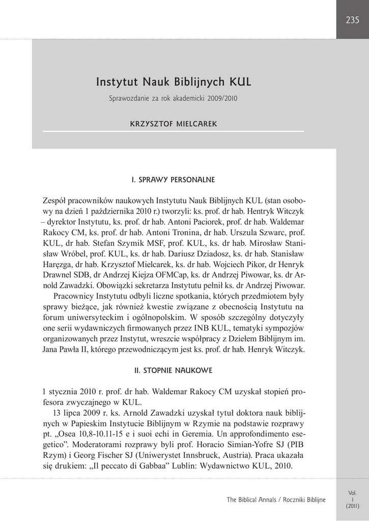 235 Instytut Nauk Biblijnych KUL Sprawozdanie za rok akademicki 2009/2010 KRZYSZTOF MIELCAREK I. SPRAWY PERSONALNE Zespół pracowników naukowych Instytutu Nauk Biblijnych KUL (stan osobowy na dzień 1 października 2010 r.) tworzyli: ks. prof. dr hab. Hentryk Witczyk – dyrektor Instytutu, ks. prof. dr hab. Antoni Paciorek, prof. dr hab. Waldemar Rakocy CM, ks. prof. dr hab. Antoni Tronina, dr hab. Urszula Szwarc, prof. KUL, dr hab. Stefan Szymik MSF, prof. KUL, ks. dr hab. Mirosław Stanisław Wróbel, prof. KUL, ks. dr hab. Dariusz Dziadosz, ks. dr hab. Stanisław Haręzga, dr hab. Krzysztof Mielcarek, ks. dr hab. Wojciech Pikor, dr Henryk Drawnel SDB, dr Andrzej Kiejza OFMCap, ks. dr Andrzej Piwowar, ks. dr Arnold Zawadzki. Obowiązki sekretarza Instytutu pełnił ks. dr Andrzej Piwowar. Pracownicy Instytutu odbyli liczne spotkania, których przedmiotem były sprawy bieżące, jak również kwestie związane z obecnością Instytutu na forum uniwersyteckim i ogólnopolskim. W sposób szczególny dotyczyły one serii wydawniczych firmowanych przez INB KUL, tematyki sympozjów organizowanych przez Instytut, wreszcie współpracy z Dziełem Biblijnym im. Jana Pawła II, którego przewodniczącym jest ks. prof. dr hab. Henryk Witczyk. II. STOPNIE NAUKOWE 1 stycznia 2010 r. prof. dr hab. Waldemar Rakocy CM uzyskał stopień profesora zwyczajnego w KUL. 13 lipca 2009 r. ks. Arnold Zawadzki uzyskał tytuł doktora nauk biblijnych w Papieskim Instytucie Biblijnym w Rzymie na podstawie rozprawy pt. „Osea 10,8-10.11-15 e i suoi echi in Geremia. Un approfondimento esegetico”. Moderatorami rozprawy byli prof. Horacio Simian-Yofre SJ (PIB Rzym) i Georg Fischer SJ (Uniwerystet Innsbruck, Austria). Praca ukazała się drukiem: „Il peccato di Gabbaa” Lublin: Wydawnictwo KUL, 2010. The Biblical Annals / Roczniki Biblijne Vol. 1 (2011) 236 Krzysztof Mielcarek W roku sprawozdawczym odbyła się publiczna obrona pracy doktorskiej ks. Pawła Laska. Promotorem pracy zatytułowanej Redakcja Drugiego listu do Koryntian. Hipotezy, ich ocena i perspetkywy był prof. dr hab. Waldemar Rakocy CM, zaś recenzentami ks. dr hab. Dariusz Kotecki, UMK Toruń, i ks. dr hab. Stefan Szymik MSF, prof. KUL. W ramach seminariów naukowych prowadzonych przez pracowników INB KUL prace magisterskie obronili: M. Chanaka OP, K. Frąckowiak, W. Głowacki, Y. Krauchanka, H. Kryńska, M. Kulczycki, M. Lisowska, Ł. Tkaczyk, A. Trzos-Mularczyk, H. Zarzeka, J. Żelaznowska, S. Żmuda, III. SYMPOZJA ORGANIZOWANE S p r awo z d an i a W INSTYTUCIE NAUK BIBLIJNYCH KUL Tom 1 (2011) W dniach 22-23 października 2009 r. Instytut zorganizował Jesienną Międzynarodową Konferencję Biblijną pod tytułem: „Pomiędzy Księgą Henocha a Apokalipsą św. Jana. Apokaliptyczny wymiar teologii wczesnego judaizmu i chrześcijaństwa”. Celem sympozjum była refleksja nad zagadnieniami związanymi z rozumieniem tektsów apokaliptycznych w starożytnym judaiźmie i chrześcijaństwie. Wśród zaproszonych prelegentów byli wybitni znawcy literatury apokaliptycznej i międzytestamentalnej: prof. John J. Collins, obecnie wykładający Stary Testament w Yale Divinity School, Yale, Conn., USA, oraz prof. James VanderKam, znawca wczesnego judaizmu, tekstów z Qumran oraz etiopskiej Księgi Henocha. Prof. VanderKam jest wykładowcą na katolickim Uniwersytecie Notre Dame w Indianie, USA. W ramach sympozjum zostały wygłoszone następujące referaty: – John Collins (Yale, USA), „Ascent to Heaven in the Early Jewish Apocalypses”; – ks. Marek Parchem (UKSW, Warszawa), „Motyw wojny eschatologicznej w Apokalipsie zwierząt (1 Hen 90,13-19)”; – James VanderKam (Notre Dame, USA), „Reflections on Early Jewish Apocalypses”; – ks. Wojciech Pikor (KUL, Lublin), „Ez 38–39 jako zwiastun eschatologii apokaliptycznej”; – Henryk Drawnel SDB (KUL, Lublin), „Nauczanie i tożsamość upadłych aniołów w Księdze czuwających w kontekście religijnym i społecznym Babilonii okresu perskiego i hellenistycznego”; – ks. Mirosław Wróbel (KUL, Lublin), „Znaki końca czasów w Apokalipsie Ezdrasza (4 Ezd)”; – Michał Wojciechowski (UWM, Olsztyn), „Etyka Apokalipsy”; The Biblical Annals / Roczniki Biblijne 237 Instytut Nauk Biblijnych KUL W dniach 24-25 marca 2010 r. Instytut zorganizował Wiosenne Dni Biblijne zatytułowane: „Od Melchizedeka do Jezusa – Arcykapłana. Biblia o kapłaństwie”. Przedmiotem rozważań była tematyka kapłaństwa staro- i nowotestamentowego. Zaproszeni zostali prelegenci z różnych ośrodków uniwersyteckich w Polsce. W ramach sympozjum zostały wygłoszone następujące referaty: – ks. Antoni Tronina (KUL, Lublin), „Geneza kapłaństwa biblijnego na tle religii Bliskiego Wschodu”; – ks. Dariusz Dziadosz (KUL, Lublin), „Kapłaństwo w Izraelu w epoce monarchii”; – Stefan Szymik MSF (KUL, Lublin), „Biblijne podstawy kapłaństwa hierarchicznego”; – ks. Wojciech Pikor (KUL, Lublin), „Ezechiel «dźwigający winę» ludu (Ez 4,4-6) – posługa proroka czy kapłana?”; – ks. Andrzej Piwowar (KUL, Lublin), „Syrach – obrońca prawowitego arcykapłana”; – ks. Henryk Witczyk (KUL, Lublin), „Modlitwa Jezusa arcykapłana (J 17,1-26)”; – Ryszard Rubinkiewicz SDB (KUL, Lublin), „Figura niegodnego kapłana w żydowskiej literaturze okresu hellenistycznego”; – Henryk Drawnel SDB (KUL, Lublin), „Lewi jako idealny kapłan w aramejskich Wizjach Lewiego”; – ks. Antoni Paciorek (KUL, Lublin), „Jezusowe wezwanie do gorliwości pasterskiej w przypowieści o zagubionej owcy (Łk 15,3-10)”; – ks. Paweł Podeszwa (UAM, Poznań), „Chrystus jako arcykapłan w świetle J 19,23 i Ap 1,13”; – ks. Dariusz Kotecki (UMK, Toruń), „Kapłan jako głosiciel Ewangelii. Przyczynek Synoptyków do teologii kapłaństwa”; The Biblical Annals / Roczniki Biblijne B i bl i c al New s – Ryszard Kempiak SDB (PWT, Wrocław), „Apokalipsa Janowa i jej przesł