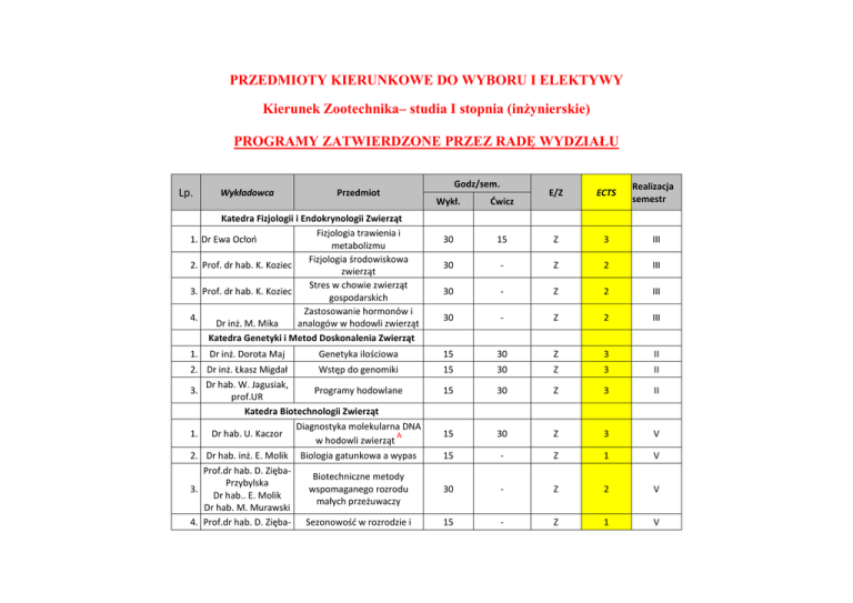 PRZEDMIOTY KIERUNKOWE DO WYBORU I ELEKTYWY Kierunek Zootechnika– studia I stopnia (inżynierskie) PROGRAMY ZATWIERDZONE PRZEZ RADĘ WYDZIAŁU Lp. Wykładowca Przedmiot Godz/sem. E/Z ECTS Realizacja semestr Wykł. Ćwicz 30 15 Z 3 III 30 - Z 2 III 30 - Z 2 III 30 - Z 2 III 15 30 Z 3 II 2. Dr inż. Łkasz Migdał Wstęp do genomiki Dr hab. W. Jagusiak, 3. Programy hodowlane prof.UR Katedra Biotechnologii Zwierząt Diagnostyka molekularna DNA 1. Dr hab. U. Kaczor A w hodowli zwierząt 15 30 Z 3 II 15 30 Z 3 II 15 30 Z 3 V 2. Dr hab. inż. E. Molik Biologia gatunkowa a wypas Prof.dr hab. D. ZiębaBiotechniczne metody Przybylska 3. wspomaganego rozrodu Dr hab.. E. Molik małych przeżuwaczy Dr hab. M. Murawski 4. Prof.dr hab. D. Zięba- Sezonowość w rozrodzie i 15 - Z 1 V 30 - Z 2 V 15 - Z 1 V 1. 2. 3. 4. 1. Katedra Fizjologii i Endokrynologii Zwierząt Fizjologia trawienia i Dr Ewa Ocłoń metabolizmu Fizjologia środowiskowa Prof. dr hab. K. Koziec zwierząt Stres w chowie zwierząt Prof. dr hab. K. Koziec gospodarskich Zastosowanie hormonów i Dr inż. M. Mika analogów w hodowli zwierząt Katedra Genetyki i Metod Doskonalenia Zwierząt Dr inż. Dorota Maj Genetyka ilościowa Lp. Wykładowca Przedmiot Przybylska Dr hab. E. Molik laktacji owiec Tradycyjne i regionalne produkty zwierzęce Inseminacja owiec i kóz 6. Dr hab.. M. Murawski (kurs na uprawnienia) Katedra Żywienia i Dietetyki Zwierząt Prof. dr hab. Z. Programy komputerowe w 1. Kowalski żywieniu zwierząt Dr hab. inż. J. Kański Żywienie, a jakość produktów 2. Dr hab.P.Micek zwierzęcych Prof. dr hab. Z. Żywienie zwierząt 3. Kowalski rozpłodowych Żywienie zwierząt amatorskich 4. Dr Olga Lasek B i laboratoryjnych Żywienie zwierząt w 5. Prof.dr hab. J. Pyś, gospodarstwach agroturystycznych 6. Dr hab. J.Kański Technologie produkcji pasz Prof.dr hab. Substancje antyodżywcze i 7. F.Borowiec szkodliwe w paszach 8. Zakład Weterynarii , Rozrodu i Dobrostanu Zwierząt Dr hab.. Hanna 9. Toksykologia środowiskowa Lutnicka 10. Dr inż. K. Pawlak Higiena środowiska wiejskiego Dobrostan zwierząt Dr hab. B. 11. gospodarskich i Tombarkiewicz laboratoryjnych 12. Dr inż. M.Lis Higiena psychiczna zwierząt 5. Dr hab. Edyta Molik 13.Dr hab.W. Młodawska Mikromanipulacje na Godz/sem. E/Z ECTS Realizacja semestr Wykł. Ćwicz 15 - Z 1 V - 30 E 2 VII 15 30 Z 3 IV 15 - Z 1 IV 15 15 Z 2 IV 15 15 Z 2 IV 15 - Z 1 IV 15 15 Z 2 IV z 1 IV 15 20 10 Z 2 VI 15 15 Z 2 VI 15 15 Z 2 VI 15 - Z 1 VI 15 - Z 1 VII Lp. Wykładowca Przedmiot Godz/sem. Wykł. Ćwicz 15 15 Realizacja semestr E/Z ECTS Z 2 VII Z 2 VII gametach i zarodkach prof. dr hab. M. Inseminacja bydła 14.Tischner, prof. dr hab. (kurs na uprawnienia) A. Okólski Prof. dr hab. A. Zaburzenia płodności zwierząt 15. Okólski gospodarskichDr Maciej Witkowski Zakład Anatomii Zwierząt Anatomia topograficzna Prof.dr hab. O. 1. 1 zwierząt domowych i Szeleszczuk laboratoryjnych Anatomia i histologia układów Prof.dr hab. O. 2. 2 rozrodczych samic i samców Szeleszczuk zwierząt domowych Biologia komórki 3. 3 Dr D. Wojtysiak i histomorfologia 4. 1. 2. 3. 4. Prof. dr hab. O. Szeleszczuk Unasienianie zwierząt futerkowych Zakład Hodowli Trzody Chlewnej i Drobnego Inwentarza Organizacja produkcji trzody Dr hab. R. Tuz chlewnej w gospodarstwach specjalistycznych Dr inż. J. Nowicki Czynniki determinujące jakość Prof. dr hab. Cz. mięsa i wyrobów wieprzowych Klocek Prof. dr hab. Cz. Etologia stosowana Klocek Dr inż. T. Schwarz Praktyczne zastosowanie Dr hab. R. Tuz metod optymalizacji komfortu Dr inż. J. Nowicki bytowego świń 30 15 15 Z 2 II 15 15 E 2 II 15 30 Z 3 II 15 15 E 2 VII 15 30 Z 3 V 15 15 Z 2 V 30 - Z 2 V 15 15 Z 2 V Lp. Wykładowca 5. Dr inż. J. Nowicki 6. Dr inż. J. Nowicki 7. Prof.dr hab. Cz. Klocek 8. Dr hab. R. Tuz Przedmiot Dobrostan świń - czynniki wpływające na jego poziom i kryteria oceny Charakterystyka dzikożyjących gatunków świń Niekonwencjonalne i proekologiczne sposoby użytkowania świń Inseminacja trzody chlewnej (kurs na uprawnienia) Godz/sem. E/Z ECTS Realizacja semestr Wykł. Ćwicz 15 - Z 1 V 15 - Z 1 V 30 - Z 2 V 30 E 2 VII 9. Dr inż. P. Niedbała Dr inż. S. Łapiński Technologie towarowej produkcji królików 15 15 Z 2 VI 10. Dr inż. P. Niedbała Dr inż. S. Łapiński Technologia produkcji skór futerkowych 15 - Z 1 VI 11. Dr inż. P. Niedbała Dr inż. S. Łapiński Środowisko i behawior zwierząt futerkowych 15 - Z 1 VI 12. Dr inż. P. Niedbała Dr inż. S. Łapiński Technologia chowu szynszyli 15 - Z 1 VI 15 30 Z 3 IV 15 15 Z 2 IV 15 30 E 3 IV 30 - Z 2 IV Zakład Hodowli Koni 1. Prof. dr hab. M. Kulisa Współczesne formy c użytkowania koni Zoopsychologia stosowana w hodowli i chowie zwierząt Kontrolowany rozród koni w Prof.dr hab. K. hodowli państwowej oraz 3. Kosiniak-Kamysz c chowie terenowym Prof.dr hab. M. Kulisa Rola człowieka i środowiska w 4. Mgr inż. Monika kształtowaniu się regionalnych Stefaniuk ras koni 2. Dr inż. Z.Podstawski Lp. Wykładowca Godz/sem. Przedmiot Prof.dr hab. M. Kulisa Dr inż. M. Pieszka Zmienność cech u różnych ras i 5. Mgr inż. Monika grup koni Stefaniuk Dr hab.inż. J. 6. Łuszczyński Sport konny i wyścigi Dr inż. B. Długosz Użytkowanie koni i psów w 7. Dr inż. Z. Podstawski terapii ludzi-hipoterapia i dogoterapia 8. Dr inż. Zenon Podstawski Organizacja rozrodu koni E/Z ECTS Realizacja semestr Wykł. Ćwicz 30 - Z 2 IV 30 - Z 2 IV 30 - Z 2 IV 15 30 Z 3 IV 30 - Z 2 VI 15 30 Z 3 VI 15 30 Z 2 VI 15 - Z 1 VI 15 - Z 1 VI 15 - Z 1 VI c od roku 2012./13 Zakład Hodowli Bydła 1. Dr inż. K. Adamczyk Technologia produkcji mleka w stadach wysokoprodukcyjnych Dr hab. J. Makulska, Optymalizacja produkcji mleka prof.UR i żywca wołowego Dr hab. A. Węglarz Dr hab. A. Węglarz Zarządzanie stadem bydła 3. Dr inż. G. Skrzyński mlecznego Oddziaływanie populacji Prof.dr hab. P. Brzuski 4. zwierząt wolnożyjących na Dr inż. M. Hędrzak B środowisko Optymalizacja Prof. dr hab. P.