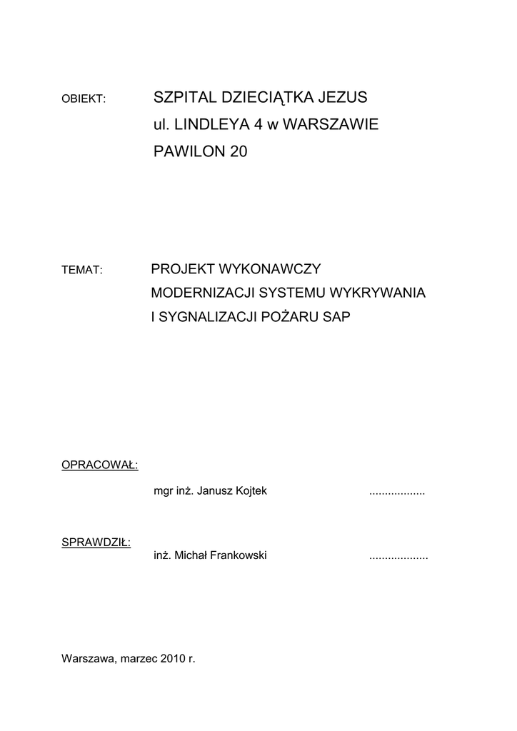 OBIEKT: SZPITAL DZIECIĄTKA JEZUS ul. LINDLEYA 4 w WARSZAWIE PAWILON 20 TEMAT: PROJEKT WYKONAWCZY MODERNIZACJI SYSTEMU WYKRYWANIA I SYGNALIZACJI POśARU SAP OPRACOWAŁ: mgr inŜ. Janusz Kojtek .................. inŜ. Michał Frankowski ................... SPRAWDZIŁ: Warszawa, marzec 2010 r. SPIS RYSUNKÓW Rys. nr 1 - System wykrywania i sygnalizacji poŜaru – schemat blokowy Rys. nr 2 - System wykrywania i sygnalizacji poŜaru – rzut piwnic Rys. nr 3 - System wykrywania i sygnalizacji poŜaru – rzut parteru Rys. nr 4 - System wykrywania i sygnalizacji poŜaru – rzut I piętra Rys. nr 5 - System wykrywania i sygnalizacji poŜaru – rzut II piętra Rys. nr 6 - System wykrywania i sygnalizacji poŜaru – rzut III piętra Rys. nr 7 - System wykrywania i sygnalizacji poŜaru – rzut poddasza 2 INFORMACJE OGÓLNE Przedmiot opracowania Przedmiotem niniejszego opracowania jest projekt wykonawczy modernizacji systemu wykrywania w budynku Pawilonu 20, Szpitala Dzieciątka Jezus, przy ul. Lindleya 4 w Warszawie. SYSTEM WYKRYWANIA POśARU 1.1 Zakres opracowania Obecnie w budynku Pawilonu 20 istnieją 2 systemy wykrywania i sygnalizacji poŜaru: - system CZ10 firmy Cerberus - system Algorex Sinteso firmy Siemens Niniejsza dokumentacja obejmuje zakresem wymianę centrali i elementów systemu CZ10 na system produkcji polskiej POLON-ALFA. Projektuje się zastosowanie dwóch central typu POLON4900. Ideą modernizacji jest wykorzystanie istniejącego okablowania (tam, gdzie jest to moŜliwe) oraz instalacja detektorów w miejscach elementów starego systemu (za wyjątkiem pomieszczeń, których aranŜacja uległa zmianie lub nastąpiła zabudowa sufitu podwieszonego). UWAGA!!! Istniejący, zainstalowany w 2007r, system Algorex nie podlega modernizacji na etapie niniejszego opracowania, jednak naleŜy zwrócić uwagę na fakt zastosowania przy jego instalacji niecertyfikowanych przewodów, które nie są dopuszczone do uŜytkowania dla systemów wykrywania i sygnalizacji poŜaru 3 1.2.Podstawa techniczna opracowania Podstawę techniczną opracowania stanowią następujące materiały: • Dokumentacja Techniczna część architektoniczno - budowlana udostępniona przez Inwestora • Projekt Techniczny instalacji sygnalizacyjno-alarmowej poŜaru SAP z lipca 1996r. • Załącznik do w/w projektu dotyczący rekonstrukcji linii dozorowych 09 i 13 z października 2007r. • Wytyczne dla automatycznych instalacji poŜarowych wydane przez VdS w 1991r. projektowanie i budowa • Polska Norma PN-E-08350-14 „Systemy sygnalizacji poŜarowej. Projektowanie, zakładanie, odbiór, eksploatacja i konserwacja instalacji” z grudnia 2002 roku • Publikacja „Wstęp do automatycznych systemów sygnalizacji poŜaru” – J. Ciszewski, CNBOP w Józefowie • Rozporządzenie MSW w sprawie ochrony przeciwpoŜarowej budynków, innych obiektów budowlanych i terenów z dnia 16.06.2003 (Dz.U. Nr 121) • Dokumentacja techniczna systemu POLON ALFA 4900 1.3. Kryteria przyjęte do projektowania systemu Projektuje się wymianę istniejącej centrali CZ10 na dwie centrale firmy POLON-ALFA. Elementy systemu POLON4900 naleŜy zainstalować w miejscu usytuowania istniejących detektorów, za wyjątkiem pomieszczeń których zabudowa ścian lub sufitów uległa modernizacji. Zaleca się wykorzystanie odcinków istniejącego okablowania, o ile zostało wykonane przy uŜyciu certyfikowanych przewodów. NaleŜy ułoŜyć nowe okablowanie do sygnalizatorów optyczno-akustycznych, przy uŜyciu kabli bezhalogenowych, mocowanych na atestowanych, metalowych uchwytach i kołkach. 4 1.4. Kryteria doboru oraz opis systemu sygnalizacji poŜaru Z uwagi na specyfikę obiektu i przyjętą ochronę całkowitą istnieje potrzeba precyzyjnego zidentyfikowania miejsca powstawania poŜaru. W systemie POLON 4900 spełniony jest wymóg precyzyjnego określenia miejsca poŜaru poprzez identyfikację nie tylko pomieszczenia, ale przede wszystkim adresu alarmującej czujki. Wszystkie te informacje są ukazywane na wyświetlaczu LCD. Centrala POLON 4900 jest wieloprocesorowym urządzeniem, z podwójnym układem sterowników procesorowych (z tzw. redundancją), gwarantującym niezawodną pracę systemu i dającym wiele udogodnień podczas programowania i późniejszej obsługi systemu wykrywania poŜaru. Podstawowa wersja centrali ma wyposaŜenie dla czterech pętli adresowalnych z moŜliwością adresowania po 127 elementów liniowych w kaŜdej pętli. MoŜna ją rozbudować do ośmiu pętli, obsługujących w sumie ponad 1000 elementów adresowalnych. Praca 16 central w pierścieniowej strukturze hierarchicznej pozwala obsłuŜyć instalację liczącą 16 000 punktów. Linie dozorowe mogą pracować w układzie pętlowym lub otwartym (promieniowym). Pętlowy system pracy linii eliminuje uszkodzenia w instalacji w postaci przerwy lub zwarcia fragmentu linii. Dodatkowo centrala kontroluje i sygnalizuje przekroczenie dopuszczalnych parametrów rezystancji i pojemności przewodów linii dozorowej. Przy projektowaniu instalacji dopuszcza się pojedyncze odgałęzienia od głównego ciągu linii pętlowej, co bardzo upraszcza prowadzenie okablowania. W centrali moŜna utworzyć programowo 512 stref dozorowych, którym moŜna przyporządkować dowolne komunikaty uŜytkownika, składające się z dwóch 32 znakowych linii tekstu. W przypadku alarmu komunikaty te pojawią się na wyświetlaczu centrali, pozwalając obsłudze na szybką i precyzyjną lokalizację źródła poŜaru. Ponadto istnieje moŜliwość programowania własnych komunikatów dla tzw. alarmów technicznych, związanych z kontrolą sterowanych przez centralę urządzeń automatyki poŜarowej. DuŜy wyświetlacz ciekłokrystaliczny, mający 20 linii po 40 znaków, pracujący w trybie graficznym oraz przyjęty sposób prezentacji opcji programowych centrali, w formie rozwijanego menu okienkowego, zdecydowanie ułatwia komunikowanie się osoby obsługującej z centralą. Wpisywanie do p