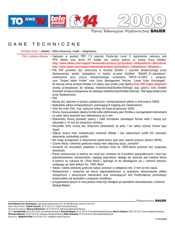 2009 Pisma Telewizyjne Wydawnictwa BAUER d a n e t e c h n i c z n e Technika druku:• okładka – offset arkuszowy, środki – rotograwiura Pliki z gotową reklamą: • Zapisane w postaci PDF 1.3 poprzez Postscript Level 3 (optymalnie zalecany jest PPD Adobe oraz driver PS Adobe ww. można pobrać ze strony firmy Adobe): http://www.adobe.com/support/downloads/product.jsp?product=44&platform=Macintosh, http://www.adobe.com/support/downloads/product.jsp?product=44&platform=Windows,) • Plik PDF powinien być utworzony w Acrobat Distiller z użyciem dostarczonego przez Wydawnictwo profilu (joboptions w Adobe Acrobat Distiller) “BAUER_PL.joboptions” ewentualnie przy użyciu standardowego ustawienia PDF/X-1a:2001 z wyłączonym “Output Intent Profile” oraz Color Management Policies “Leave Color Unchanged”. W starszej wersji Acrobat Distiller 4.0 należy użyć profilu (Job Option) Creo PDF Pages.joboptions (trzeba przekopiować do katalogu AdobeAcrobat/Distiller/Settings) oraz patch’a Creo Distiller Assistant (trzeba przekopiować do katalogu AdobeAcrobat/Distiller/Startup). Pliki będą dostarczone przez Wydawnictwo. • PDF • Muszą być zapisane w postaci pojedyńczych i kompozytowych plików w kolorystyce CMYK. • Nadsyłanie plików kompozytowych zawierających trapping jest niedozwolone. • Total Ink Limit (TAC, max. pokrycie farbą) nie może przekraczać 320%. • Strony muszą posiadać idealny format netto zdefiniowany jako TrimBox z wyciągniętymi elementami na spad, który powinien być zdefiniowany po 5 mm • Dokumenty muszą posiadać pasery i znaki formatowe określające format netto i muszą być odsunięte o 10 mm od zawartości stronicy. • Wszystkie fonty muszą być dołączone (embedded) do pliku i nie należy używać fontów typu Type3. • Zdjęcia muszą mieć rozdzielczość minimum 300dpi i bez załączonych profili ICC wewnątrz dokumentu (embedded profile). • Nie mogą występować w dokumencie żadne kolory typu spot, jedynie process (device CMYK). • Czarne teksty i elementy graficzne muszą mieć włączoną opcję „overprint”; • Overprint we wszystkich obiektach o wartości innej niż 100%-Black powinien być wyłączany (knockout) • Pismo umieszczone w kontrze nie może być mniejsze niż 8 punktów typograficznych i musi być jednoelementowe, bezszeryfowe, najlepiej pogrubione, dlatego też zalecane jest unikanie tekstu w kontrze na czarnym tle („Rich Black”) opartego na tle składającym się z czterech kolorów, zastępując go tylko jednym tzn. 100% Black. • Teksty i istotne elementy graficzne należy umieścić w odległości min. 5 mm od linii cięcia. • Wydawnictwo i drukarnia nie bierze odpowiedzialności za poprawne odwzorowanie plików niezgodnych z powyższymi zaleceniami oraz zawierających kod PostScritpowy pochodzący bezpośrednio lub pośrednio z programu CorelDraw. • przygotowanie danych w innej postaci może być dostępne po uprzednim skonsultowaniu z Centrum Obsługi Reklam Wydawnictwo BAUER Dział Reklamy Pism Telewizyjnych: aleja Stanów Zjednoczonych 61a, 04-028 Warszawa; fax:(0) 22 516 35 91 Dyrektor Działu Reklamy: Izabela Sarnecka, (0) 22 516 35 18, [email protected] Kierownik Działu Reklamy: Katarzyna Kilanowska, (0) 22 516 35 55, [email protected] Zespół: Anna Berlińska, (0) 22 516 35 86, [email protected]; Krzysztof Chojecki, (0) 22 516 31 70, [email protected]; Marcin Jaśkiewicz, (0)22 516 35 21, [email protected]; Mirosława Olejarska, (0) 22 516 35 93, [email protected]; Rafał Trzebieniak, (0) 22 516 35 40, [email protected] Koordynator: Magdalena Witan, (0) 22 516 31 91, [email protected] 17.09.2009 2009 Pisma Telewizyjne Wydawnictwa BAUER Przekazanie danych: • płyty CD-R lub DVD-R nagrane wg standardu ISO 9660 lub HFS/HFS+, • łącze ftp: serwer: login: haslo: folder: red.bauer.pl reklamy rekbauer <odpowiedni dla tytułu> • lub z przeglądarki: ftp://reklamy:[email protected] Materiał porównawczy: •Cyfrowy proof. Musi być przygotowany wg Profilu ICC drukarni docelowej: okładki – DPSA_GOneG2.Icc, środki – BDK_SC56G2.Icc dostarczonego przez Wydawnictwo Bauer. Odbitka próbna powinna być wykonana z tych samych plików, które zostaną dostarczone do Wydawnictwa. Za zgodą Centrum Obsługi Reklam można przysłać materiał wg innego profilu ICC np. “ISO Coated v2” lub “ISO WEBCoated” Każdy proof cyfrowy musi być zcertyfikowany spektrofotometrem w stosunku do profilu ICC wg którego został wykonany przy użyciu testu UGRA/FOGRA Media Wedge 2.0 lub 2,2 bądź 3,0 i wg założeń poniższych tolerancji: tolerancja dla symulacji podłoża deltaE<3, tolerancja dla Apli deltaE<4 oraz tolerancja dla Apli w przebarwieniu deltaH<2,5, tolerancja średnia ze wszystkich pól kontrolnych deltaE<3, maksymalna tolerancja dla najbardziej niezgodnego pola deltaE<6, tolerancja dla pól neutralnych deltaH<1,5). Wizualną ocenę zbieżności proofów do druku należy przeprowadzać w standardowych warunkach oświetleniowych, zgodnych z normą ISO 3664:2000, tzn.: oświetlenie zbieżne z iluminantem D50 (temperatura barwowa 5000 stopni K), natężenie oświetlenia na oglądanej powierzchni materiałów powinno wynosić 2000 ± 500 lx. Dodatkowe informacje: •Cienkie linie lub inne podobne elementy graficzne (poniżej 0,8 pkt.) lub tekst poniżej 8 pkt. powinny być wykonane w jednym kolorze oraz krojem jednoelementowym; UWAGA! przy druku wysokonakładowym tolerancja pasowania w druku jednego koloru to (+- ) 0,2 mm , co sumarycznie przy odchyleniu jednego koloru na (+) a drugiego na ( -) daje rozpasowanie rzędu 0,4 mm (dotyczy stron wewnętrznych) dlatego tez najlepiej unikać tekstu w kontrze opartego na tle składającym się z czterech kolorów, zastępując tylko jednym. Reklamy całostronicowe przygotowywane w formacie brutto są obcinane o 5 mm ze wszystkich stron na stronach okładkowych i o 3 mm z góry i/lub dołu, oraz o 5 mm z lewej i/lub prawej strony 