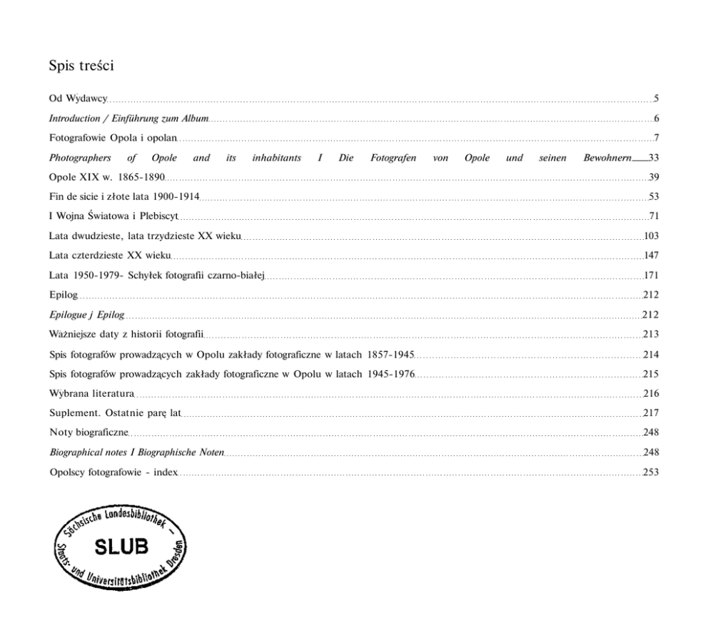 Spis treści Od Wydawcy 5 Introduction / Einführung zum Album 6 Fotografowie Opola i opolan 7 Photographers of Opole and its inhabitants I Die Fotografen von Opole und seinen Bewohnern 33 Opole XIX w. 1865-1890 39 Fin de sicie i złote lata 1900-1914 53 I Wojna Światowa i Plebiscyt 71 Lata dwudzieste, lata trzydzieste XX wieku 103 Lata czterdzieste XX wieku 147 Lata 1950-1979- Schyłek fotografii czarno-białej 171 Epilog 212 Epilogue j Epilog 212 Ważniejsze daty z historii fotografii 213 Spis fotografów prowadzących w Opolu zakłady fotograficzne w latach 1857-1945 214 Spis fotografów prowadzących zakłady fotograficzne w Opolu w latach 1945-1976 215 Wybrana literatura 216 Suplement. Ostatnie parę lat 217 Noty biograficzne 248 Biographical notes I Biographische Noten 248 Opolscy fotografowie - index 253 PPN: 266334512 Titel: Opole, 150 lat fotografii / Urszula Zajñaczkowska. [Redakcja: Boguslaw Szybkowski]. Opole : Wydawn. MS, 2006 ISBN: 83-88945-58-0Pp. Bibliographischer Datensatz im SWB-Verbund