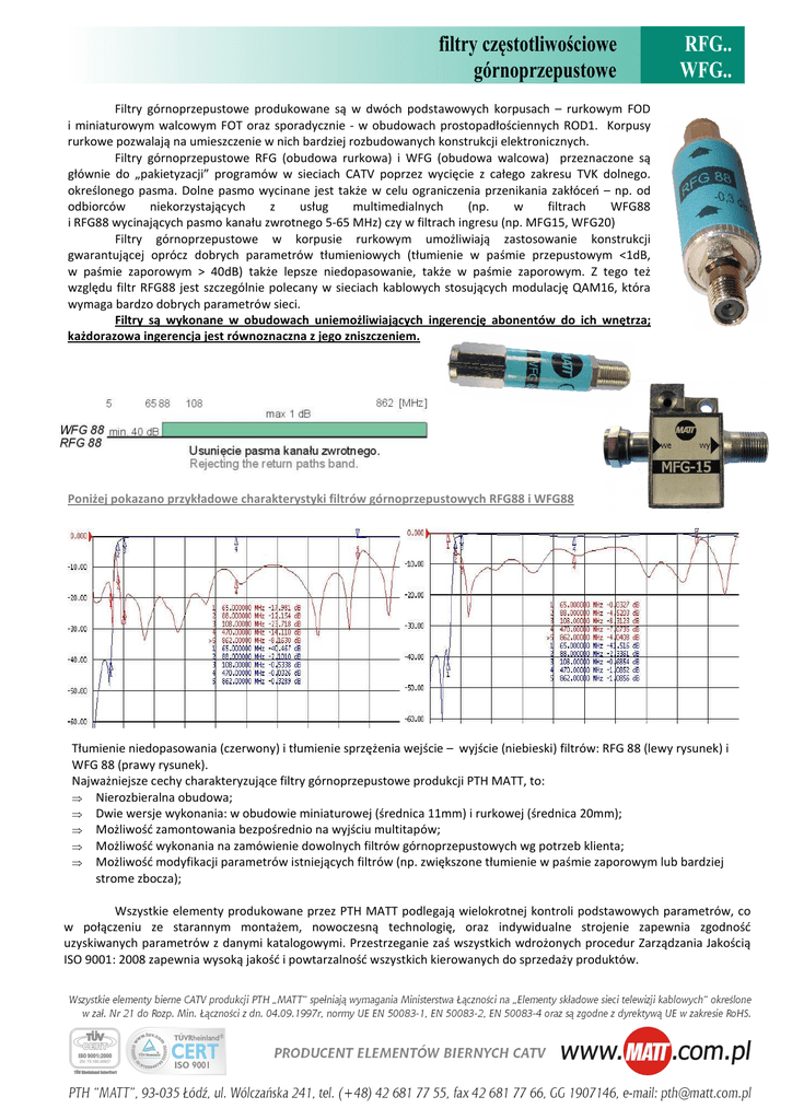 filtry częstotliwościowe górnoprzepustowe RFG.. WFG.. Filtry górnoprzepustowe produkowane są w dwóch podstawowych korpusach – rurkowym FOD i miniaturowym walcowym FOT oraz sporadycznie - w obudowach prostopadłościennych ROD1. Korpusy rurkowe pozwalają na umieszczenie w nich bardziej rozbudowanych konstrukcji elektronicznych. Filtry górnoprzepustowe RFG (obudowa rurkowa) i WFG (obudowa walcowa) przeznaczone są głównie do „pakietyzacji” programów w sieciach CATV poprzez wycięcie z całego zakresu TVK dolnego. określonego pasma. Dolne pasmo wycinane jest także w celu ograniczenia przenikania zakłóceń – np. od odbiorców niekorzystających z usług multimedialnych (np. w filtrach WFG88 i RFG88 wycinających pasmo kanału zwrotnego 5-65 MHz) czy w filtrach ingresu (np. MFG15, WFG20) Filtry górnoprzepustowe w korpusie rurkowym umożliwiają zastosowanie konstrukcji gwarantującej oprócz dobrych parametrów tłumieniowych (tłumienie w paśmie przepustowym <1dB, w paśmie zaporowym > 40dB) także lepsze niedopasowanie, także w paśmie zaporowym. Z tego też względu filtr RFG88 jest szczególnie polecany w sieciach kablowych stosujących modulację QAM16, która wymaga bardzo dobrych parametrów sieci. Filtry są wykonane w obudowach uniemożliwiających ingerencję abonentów do ich wnętrza; każdorazowa ingerencja jest równoznaczna z jego zniszczeniem. Poniżej pokazano przykładowe charakterystyki filtrów górnoprzepustowych RFG88 i WFG88 Tłumienie niedopasowania (czerwony) i tłumienie sprzężenia wejście – wyjście (niebieski) filtrów: RFG 88 (lewy rysunek) i WFG 88 (prawy rysunek). Najważniejsze cechy charakteryzujące filtry górnoprzepustowe produkcji PTH MATT, to: ⇒ Nierozbieralna obudowa; ⇒ Dwie wersje wykonania: w obudowie miniaturowej (średnica 11mm) i rurkowej (średnica 20mm); ⇒ Możliwość zamontowania bezpośrednio na wyjściu multitapów; ⇒ Możliwość wykonania na zamówienie dowolnych filtrów górnoprzepustowych wg potrzeb klienta; ⇒ Możliwość modyfikacji parametrów istniejących filtrów (np. zwiększone tłumienie w paśmie zaporowym lub bardziej strome zbocza); Wszystkie elementy produkowane przez PTH MATT podlegają wielokrotnej kontroli podstawowych parametrów, co w połączeniu ze starannym montażem, nowoczesną technologię, oraz indywidualne strojenie zapewnia zgodność uzyskiwanych parametrów z danymi katalogowymi. Przestrzeganie zaś wszystkich wdrożonych procedur Zarządzania Jakością ISO 9001: 2008 zapewnia wysoką jakość i powtarzalność wszystkich kierowanych do sprzedaży produktów.