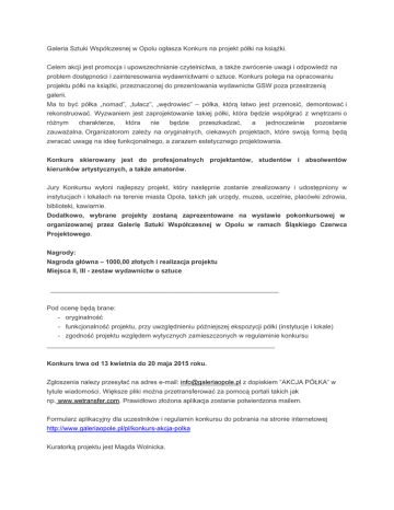 Galeria Sztuki Współczesnej w Opolu ogłasza Konkurs na projekt półki na książki. Celem akcji jest promocja i upowszechnianie czytelnictwa, a także zwrócenie uwagi i odpowiedź na problem dostępności i zainteresowania wydawnictwami o sztuce. Konkurs polega na opracowaniu projektu półki na książki, przeznaczonej do prezentowania wydawnictw GSW poza przestrzenią galerii. Ma to być półka „nomad”, „tułacz”, „wędrowiec” – półka, którą łatwo jest przenosić, demontować i rekonstruować. Wyzwaniem jest zaprojektowanie takiej półki, która będzie współgrać z wnętrzami o różnym charakterze, która nie będzie przeszkadzać, a jednocześnie pozostanie zauważalna. Organizatorom zależy na oryginalnych, ciekawych projektach, które swoją formą będą zwracać uwagę na ideę funkcjonalnego, a zarazem estetycznego projektowania. Konkurs skierowany jest do profesjonalnych projektantów, studentów i absolwentów kierunków artystycznych, a także amatorów. Jury Konkursu wyłoni najlepszy projekt, który następnie zostanie zrealizowany i udostępniony w instytucjach i lokalach na terenie miasta Opola, takich jak urzędy, muzea, uczelnie, placówki zdrowia, biblioteki, kawiarnie. Dodatkowo, wybrane projekty zostaną zaprezentowane na wystawie pokonkursowej w organizowanej przez Galerię Sztuki Współczesnej w Opolu w ramach Śląskiego Czerwca Projektowego. Nagrody: Nagroda główna – 1000,00 złotych i realizacja projektu Miejsca II, III - zestaw wydawnictw o sztuce ______________________________________________________________ Pod ocenę będą brane: - oryginalność - funkcjonalność projektu, przy uwzględnieniu późniejszej ekspozycji półki (instytucje i lokale) - zgodność projektu względem wytycznych zamieszczonych w regulaminie konkursu ______________________________________________________________ Konkurs trwa od 13 kwietnia do 20 maja 2015 roku. Zgłoszenia nalezy przesyłać na adres e-mail: [email protected] z dopiskiem “AKCJA PÓŁKA” w tytule wiadomości. Większe pliki można przetransferować za pomocą portali takich jak np. www.wetransfer.com. Prawidłowo złożona aplikacja zostanie potwierdzona mailem. Formularz aplikacyjny dla uczestników i regulamin konkursu do pobrania na stronie internetowej http://www.galeriaopole.pl/pl/konkurs-akcja-polka Kuratorką projektu jest Magda Wolnicka. wydarzenie facebook - https://www.facebook.com/events/448116035346120/ WARUNKIEM UCZESTNICTWA W PROJEKCIE JEST ZAPOZNANIE SIĘ Z REGULAMINEM KONKURSU „AKCJA PÓŁKA”.