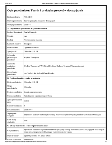 Opis przedmiotu: Teoria i praktyka procesów decyzyjnych