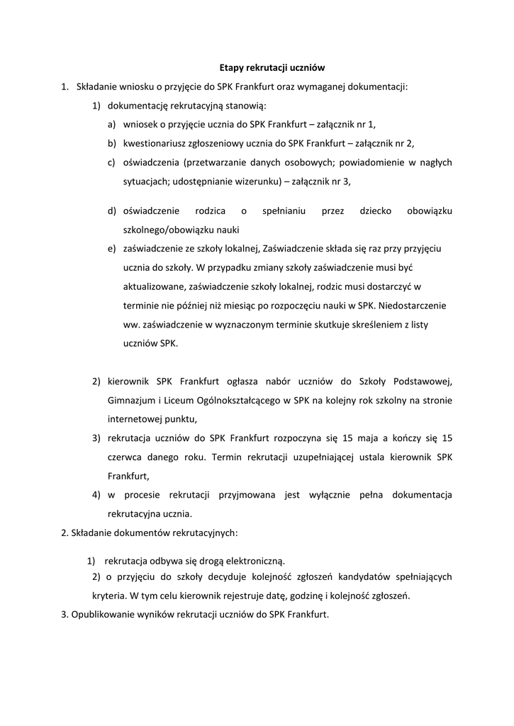 Etapy rekrutacji uczniów 1. Składanie wniosku o przyjęcie do SPK Frankfurt oraz wymaganej dokumentacji: 1) dokumentację rekrutacyjną stanowią: a) wniosek o przyjęcie ucznia do SPK Frankfurt – załącznik nr 1, b) kwestionariusz zgłoszeniowy ucznia do SPK Frankfurt – załącznik nr 2, c) oświadczenia (przetwarzanie danych osobowych; powiadomienie w nagłych sytuacjach; udostępnianie wizerunku) – załącznik nr 3, d) oświadczenie rodzica o spełnianiu przez dziecko obowiązku szkolnego/obowiązku nauki e) zaświadczenie ze szkoły lokalnej, Zaświadczenie składa się raz przy przyjęciu ucznia do szkoły. W przypadku zmiany szkoły zaświadczenie musi być aktualizowane, zaświadczenie szkoły lokalnej, rodzic musi dostarczyć w terminie nie później niż miesiąc po rozpoczęciu nauki w SPK. Niedostarczenie ww. zaświadczenie w wyznaczonym terminie skutkuje skreśleniem z listy uczniów SPK. 2) kierownik SPK Frankfurt ogłasza nabór uczniów do Szkoły Podstawowej, Gimnazjum i Liceum Ogólnokształcącego w SPK na kolejny rok szkolny na stronie internetowej punktu, 3) rekrutacja uczniów do SPK Frankfurt rozpoczyna się 15 maja a kończy się 15 czerwca danego roku. Termin rekrutacji uzupełniającej ustala kierownik SPK Frankfurt, 4) w procesie rekrutacji przyjmowana jest wyłącznie pełna dokumentacja rekrutacyjna ucznia. 2. Składanie dokumentów rekrutacyjnych: 1) rekrutacja odbywa się drogą elektroniczną. 2) o przyjęciu do szkoły decyduje kolejność zgłoszeń kandydatów spełniających kryteria. W tym celu kierownik rejestruje datę, godzinę i kolejność zgłoszeń. 3. Opublikowanie wyników rekrutacji uczniów do SPK Frankfurt. 1) po upływie terminu przyjmowania dokumentów określonego w harmonogramie działań rekrutacyjnych SPK Frankfurt, sporządzana jest lista wszystkich kandydatów, 2) po zakończeniu rekrutacji, Komisja rekrutacyjna przygotowuje listę przyjętych uczniów, 3) do dnia 30 czerwca kierownik SPK Frankfurt jest zobowiązany podać do wiadomości rodziców wyniki rekrutacji, 4) w przypadku rezygnacji ucznia z nauki w SPK Frankfurt, na jego miejsce przyjmowana jest kolejna osoba z listy nieprzyjętych, spełniająca wymogi formalne. Lista znajduje się u kierownika SPK Frankfurt, 5) w SPK Frankfurt, w którym wykorzystano liczbę wolnych miejsc nie przeprowadza się rekrutacji uzupełniającej. 4. W przypadku przyjęcia ucznia do SPK Frankfurt, rodzic jest zobowiązany złożyć pisemne potwierdzenie (drogą elektroniczną), iż dziecko będzie uczyło się w SPK Frankfurt. 5. W przypadku wolnych miejsc, w SPK Frankfurt prowadzona jest rekrutacja uzupełniająca, do której stosuje się odpowiednio przepisy § 1 i 2 regulaminu.