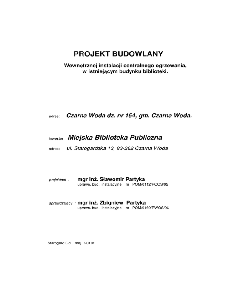 PROJEKT BUDOWLANY Wewnętrznej instalacji centralnego ogrzewania, w istniejącym budynku biblioteki. adres: Czarna Woda dz. nr 154, gm. Czarna Woda. inwestor: Miejska Biblioteka Publiczna adres: ul. Starogardzka 13, 83-262 Czarna Woda projektant : mgr inż. Sławomir Partyka uprawn. bud. instalacyjne sprawdzający : nr POM/0112/POOS/05 mgr inż. Zbigniew Partyka uprawn. bud. instalacyjne Starogard Gd., maj 2010r. nr POM/0160/PWOS/06 2 Opis techniczny do projektu instalacji, centralnego ogrzewania d a n e o g ó l n e Budynek istniejący wykonany został w technologii tradycyjnej murowanej. Ściany zewnętrzne nadziemia o konstrukcji murowanej, stropodach konstrukcji drewnianej. Instalacja c.o. została zaprojektowana przy założeniu, że teren pod zabudowę jest uzbrojony. W rozbudowywanym budynku przewiduje się następujące instalacje: 1. centralnego ogrzewania i n s t a l a c j a c e n t r a l n e g o o g r z e w a n i a Istniejąca część biblioteki będzie ogrzewana kotłem na paliwo stałe o mocy 9kW. ogrzewanie wodne, dwuprzewodowe z rozdziałem dolnym system otwarty. Zastosowano Parametry czynnika grzejnego 70/50 oC. Temperatury w pomieszczeniach oraz temperatury zewnętrzne zostały przyjęte zgodnie z normami PN-82/B-02402 i PN-82/B-02403. Obliczenie strat ciepła dokonano zgodnie z normą PN-94/B-03406 w oparciu o rodzaj przegród wg projektu architektonicznego. Współczynniki przenikania ciepła „U” zostały policzone wg normy PN-91/B-02020 – Ochrona cieplna budynków. Rurociągi pionowe i poziome zaprojektowano z rur miedzianych, łuki i odgałęzienia z typowych kształtek miedzianych, łączonych za pomocą lutowania, rurociągi układać w kanalikach podłogowych, trwale przykrytych i mocować do podłoża systemowymi uchwytami i wspornikami w rozstawie zgodnym z instrukcją producenta rur. Piony prowadzić w bruzdach ściennych 14x14 cm, krytych płytami gipsowo- kartonowymi ognioodpornymi. Po wykonaniu prób ciśnienia i na gorąco rurociągi prowadzone w kanałach i bruzdach ściennych zaizolować termicznie prefabrykowanymi otulinami z pianki poliuretanowej grubości 2 cm. W przejściach przez stropy i ściany stosować należy tuleje ochronne z rur polipropylenowych. Rozstaw uchwytów przesuwnych wykonać w zależności od średnicy: Średnica rury [mm] 12 15 18 22 28 35 42 Odległość między uchwytami [m] 1,25 1,25 1,50 2,00 2,25 2,75 3,00 3 Grzejniki Zaprojektowano grzejniki stalowe płytowe firmy Rettig Purmo, w wersji dolnego zasilania (VKO) Grzejniki VKO wyposażone fabrycznie w korki zaślepiające, korpus do zaworu, zawór grzejnikowy termostatyczny, odpowietrznik automatyczny i uchwyty do wieszania grzejnika na ścianie. Głowicę termostatyczną należy zakupić osobno. Podłączenie do instalacji c.o. z dołu grzejnika VKO. Armatura Jako armaturę odcinającą projektuje się zawory kulowe na ciśnienie Pn= 1 bar. Na instalacji zamontowany będzie również zawór kulowy ze złączką do węża w celu napełniania i opróżniania instalacji c.o. Do regulacji przepływu czynnika grzejnego przez grzejniki zaprojektowano zawory firmy Danfoss wyposażone w głowicę termostatyczną . Zabezpieczenie instalacji Zabezpieczenie instalacji c.o. stanowić będzie otwarte naczynie wzbiorcze o poj. 20 l Pompa obiegowa dla co Dla wymuszenia obiegu c.o. ciepła zaprojektowano pompę obiegową ze zmienną prędkością obrotową typ 25POe 40 C LFP Leszno, G = 1,4 m 3/h, H = 12,0 kPa = 1,2 H20, 220 V firmy Leszno. Można również zastosować inną pompę o podobnej charakterystyce. zgodnie z normą. Napełniona wodą instalacja, po całkowitym jej odpowietrzeniu powinna znajdować się pod ciśnieniem Pn = 0,08 HPa, wg wskazań manometru przy naczyniu ciśnieniowym. Opis kotłowni Pomieszczenie kotłowni Zaleca się, aby pomieszczenie kotłowni pomalować . Należy zastosować jasną kolorystykę pomieszczeń. Powierzchnia pomieszczenia kotłowni wynosi 21 m2. Drzwi wejściowe do kotłowni należy wykonać z blachy stalowej, otwierane na zewnątrz pod naciskiem. Kotłownia będzie wyposażona w instalację zimnej wody, wentylację grawitacyjną nawiewno-wywiewną. Wszelkie przejścia rur przez przegrody budowlane należy prowadzić w tulejach ochronnych z rur stalowych o większej średnicy. Obliczenia 1. Dobór kotła Zapotrzebowanie ciepła na potrzeby c o. wynosi 9 kW Ze względu na dużą różnorodność kotłów na rynku, wybór kotła pozostawia się inwestorowi, należy zastosować kocioł o mocy min. 9 kW 4 2. Przekroje komina i przewodów wentylacyjnych a) dla kotłowni Projektuje się wykorzystanie istniejącego szybu kominowego do podłączenia kotła na paliwo stałe. Wewnątrz istn. szybu kominowego należy umieścić elastyczny przewód spalinowy. Wentylacja kotłowni - nawiew Zgodnie z „Wytycznymi proj. kotłowni na paliwa ciekłe i gazowe” pole przekroju otworu wentylacyjnego powinno wynosić min. 5,0 cm2/1,163 kW nominalnej mocy kotła. Moc projektowanego kotła - 19 kW Fn = 9 x 5 = 39 cm 2 1,163 Przyjęto 1 otwor osiatkowany o przekroju 14 x 14 cm. Spód otworu powinien znaleźć się 0,5 m nad posadzką. - wywiew Pole przekroju otworów wywiewnych powinno być równe połowie powierzchni otworów nawiewnych. Fw = 0,5 Fn Fw = 0,5 x 39 = 19,5 cm2 Przyjęto osiatkowany otwór usytuowany pod stropem w kominie wentylacyjnym o wymiarach 14 x 14 Próby i uruchomienie instalacji Po całkowitym zamontowaniu instalacji c.o. należy poddać ją próbie szczelności ciśnieniowej na ciśnienie próbne Ppr = 0,6 MPa, na zimno i na gorąco. Ze względu na zamontowanie w instalacji precyzyjnych zaworów termostatycznych należy napełnić ją wodą uzdatnioną zgodnie z normą PN-93/C-04607 „Woda w instalacjach grzewczych. 3. Dobór naczynia wzniorczego i zaworu bezpieczeństwa 3.1. Dobór naczynia wzbiorczego - pojemność użytkowa naczynia Vu =1,1 V x ρ1 x ∆V V = 0,263[m3] – pojemność instalacji centralnego ogrzewania ρ1 = 999,7 [kg/m3] 