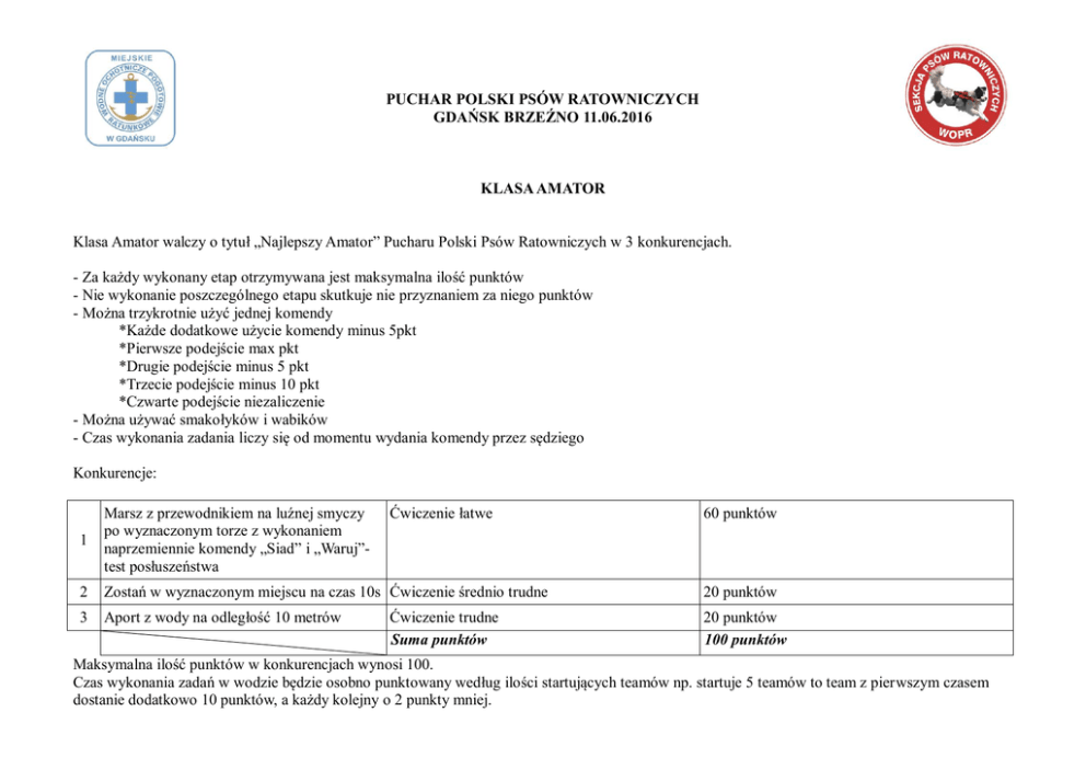 PUCHAR POLSKI PSÓW RATOWNICZYCH GDAŃSK BRZEŹNO 11.06.2016 KLASA AMATOR Klasa Amator walczy o tytuł „Najlepszy Amator” Pucharu Polski Psów Ratowniczych w 3 konkurencjach. - Za każdy wykonany etap otrzymywana jest maksymalna ilość punktów - Nie wykonanie poszczególnego etapu skutkuje nie przyznaniem za niego punktów - Można trzykrotnie użyć jednej komendy *Każde dodatkowe użycie komendy minus 5pkt *Pierwsze podejście max pkt *Drugie podejście minus 5 pkt *Trzecie podejście minus 10 pkt *Czwarte podejście niezaliczenie - Można używać smakołyków i wabików - Czas wykonania zadania liczy się od momentu wydania komendy przez sędziego Konkurencje: 1 Marsz z przewodnikiem na luźnej smyczy po wyznaczonym torze z wykonaniem naprzemiennie komendy „Siad” i „Waruj”test posłuszeństwa Ćwiczenie łatwe 2 Zostań w wyznaczonym miejscu na czas 10s Ćwiczenie średnio trudne 20 punktów 3 Aport z wody na odległość 10 metrów 20 punktów 100 punktów Ćwiczenie trudne Suma punktów 60 punktów Maksymalna ilość punktów w konkurencjach wynosi 100. Czas wykonania zadań w wodzie będzie osobno punktowany według ilości startujących teamów np. startuje 5 teamów to team z pierwszym czasem dostanie dodatkowo 10 punktów, a każdy kolejny o 2 punkty mniej. Opis konkurencji: 1. Marsz z przewodnikiem na luźnej smyczy po wyznaczonym torze z wykonaniem naprzemiennie komendy „Siad” i „Waruj”- test posłuszeństwa Przewodnik przygotowuje psa do startu w punkcie A (pozycja wyjściowa siad) 1.1 - pies nie może być zmuszany do zajęcia pozycji (zabronione jest korzystanie siły fizycznej) - można stosować komendy słowne i gestowne. 5 punktów Przewodnik wykonuje marsz na luźnej smyczy przez wyznaczony tor 1.2 - pies nie może odchodzić samodzielnie od przewodnika - pies nie może być zmuszany do wykonania komendy 10 punktów Podczas marszu przewodnik wydaje naprzemiennie komendy :Siad” i „Waruj” w punktach B, C, D, E 1.3 - pies nie może być zmuszany do wykonania komendy - można stosować komendy słowne i gestowne. 40 punktów Przewodnik kończy przejście z psem w punkcie F (pozycja końcowa siad) 1.4 - pies nie może być zmuszany do zajęcia pozycji, - dopuszcza się komendy słowne i gestowne. 5 punktów 2. „Zostań” w wyznaczonym miejscu – test posłuszeństwa Przewodnik przygotowuje psa do rozpoczęcia zadania w punkcie A(pozycja wyjściowa siad lub waruj) 2.1 - pies nie może być zmuszany do zajęcia pozycji, - dopuszcza się komendy słowne i gestowne. 5 punktów Przewodnik odchodzi od psa na odległość 10 metrów - pies musi pozostać w wyznaczonym miejscu przez 10s, 2.2 - czas jest liczony od momentu uzyskania przez przewodnika dystansu 10 m, - pies nie może zmienić swojej pozycji podczas wykonywania zadania, - dozwolone jest przemieszczenie się psa max o jedną długość ciała psa. 10 punktów Przewodnik przywołuje psa do siebie (pozycja końcowa siad) 2.3 - pies ma podejść do swojego przewodnika, - pies nie może dobrowolnie opuścić miejsca wykonywania zadania 5 punktów 3. Aport z wody na odległość 10 metrów Przewodnik z psem podchodzą na linię startu pomiędzy dwoma tyczkami. Przewodnik wyrzuca aport na odległość 10 m 3.1 Pies samodzielnie wchodzi do wody - czas na reakcję 20 sekund 5 punktów 3.2 Pies płynie w kierunku aportu - dopuszcza się zawracanie do brzegu, ale po maksymalnie 3 komendach zadanie zostaje przerwane 5 punktów Pies podejmuje aport 3.3 - nie może go wypuścić podczas wykonywania zadania 5 punktów Pies wraca z aportem do przewodnika i oddaje mu go - musi płynąc w kierunku brzegu, 3.4 - nie może zacząć bawić się aportem, - musi oddać aport 5 punktów Sędzia ma prawo odjąć punkty max 50 punktów w danej konkurencji za: - niesportowe zachowanie, - karanie lub karcenie, W sporach i sprawach nieuregulowanych podczas trwania zawodów należy zgłosić się do organizatora zawodów, który powoła komisję w celu niezwłocznego wyjaśnienia sprawy.
