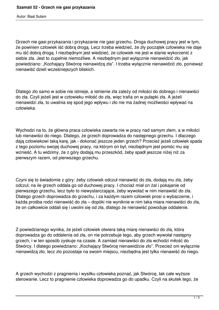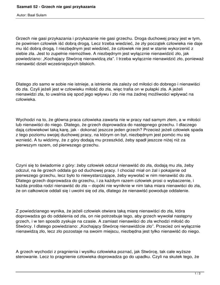 Szamati 52 - Grzech nie gasi przykazania Autor: Baal Sulam Grzech nie gasi przykazania i przykazanie nie gasi grzechu. Droga duchowej pracy jest w tym, że powinien człowiek iść dobrą drogą. Lecz trzeba wiedzieć, że zły początek człowieka nie daje mu iść dobrą drogą. I niezbędnym jest wiedzieć, że człowiek nie jest w stanie wykorzenić z siebie zła. Jest to zupełnie niemożliwe. A niezbędnym jest wyłącznie nienawidzić zło, jak powiedziano: „Kochający Stwórcę nienawidzą zła”. I trzeba wyłącznie nienawidzić zło, ponieważ nienawiść dzieli wcześniejszych bliskich. Dlatego zło samo w sobie nie istnieje, a istnienie zła zależy od miłości do dobrego i nienawiści do zła. Czyli jeżeli jest w człowieku miłość do zła, więc trafia on w pułapki zła. A jeżeli nienawidzi zła, to uwalnia się spod jego wpływu i zło nie ma żadnej możliwości wpływać na człowieka. Wychodzi na to, że główna praca człowieka zawarta nie w pracy nad samym złem, a w miłości lub nienawiści do niego. Dlatego, że grzech doprowadza do następnego grzechu. I dlaczego dają człowiekowi taką karę, jak - dokonać jeszcze jeden grzech? Przecież jeżeli człowiek spada z tego poziomu swojej duchowej pracy, na którym on był, niezbędnym jest pomóc mu się wznieść. A tu widzimy, że z góry dodają mu przeszkód, żeby spadł jeszcze niżej niż za pierwszym razem, od pierwszego grzechu. Czyni się to świadomie z góry: żeby człowiek odczuł nienawiść do zła, dodają mu zła, żeby odczuł, na ile grzech oddala go od duchowej pracy. I chociaż miał on żal i pokajanie od pierwszego grzechu, lecz było to niewystarczające, żeby wywołać w nim nienawiść do zła. Dlatego grzech doprowadza do grzechu, i za każdym razem człowiek prosi o wybaczenie, i każda prośba rodzi nienawiść do zła – dopóki nie wyniknie w nim taka miara nienawiści do zła, że on całkowicie oddali się i uwolni się od zła, dlatego że nienawiść powoduje oddalenie. Z powiedzianego wynika, że jeżeli człowiek otwiera taką miarę nienawiści do zła, która doprowadza go do oddalenia od zła, on nie potrzebuje tego, aby grzech wywołał następny grzech, i w ten sposób zyskuje na czasie. A zamiast nienawiści do zła wchodzi miłość do Stwórcy. I dlatego powiedziano: „Kochający Stwórcę nienawidźcie zło”. Przecież oni wyłącznie nienawidzą zło, lecz zło pozostaje na swoim miejscu, niezbędna jest tylko nienawiść do niego. A grzech wychodzi z pragnienia i wysiłku człowieka poznać, jak Stwórcę, tak całe wyższe sterowanie. Lecz to pragnienie człowieka doprowadza go do upadku. Czyli na skutek tego, że 1/3 Szamati 52 - Grzech nie gasi przykazania Autor: Baal Sulam życzy sobie pojąć w swoim niższym rozumie i nie rozumie, zostaje uszkodzony - w uniżenie. Rzecz w tym, że jeżeli człowiek odczuwa w sobie pragnienie poznania czegokolwiek, jest to znak tego, że powinien on poznać upragnione. I jeżeli on wznosi się nad swoim własnym zrozumieniem, i zamiast wysiłku poznać upragnione przyjmuje wszystko wiarą ponad wiedzę, uważa się to u człowieka największym uniżeniem. Wychodzi na to, że im silniejsze u niego pragnienie więcej poznać, przy tym przyjmując to wiarą ponad wiedzę, on przebywa w większym uniżeniu. Dlatego powiedziano o Mosze, że jest on skromny i cierpliwy, co oznacza, że odczuwał cierpienie i uniżenie w największej mierze. I dlatego powiedziano, że Adam do grzechu, do tego jak zjadł płód drzewa życia, był doskonały, lecz nie mógł iść powyżej swojego poziomu, dlatego że nie odczuwał żadnego braku w swoim stanie. I dlatego nie był w stanie otworzyć imienia Stwórcy. Dlatego jego grzech był niezbędny, przeraźliwy dla całej ludzkości w tym, że zjadł płód drzewa dobra i zła, na skutek czego zniknęło całe Wyższe Światło, i zobowiązany on ponownie rozpocząć pracę. I o tym powiedziano, że został wygnany z rajskiego ogrodu. Dlatego że jeżeli po grzechu zjadł z drzewa życia, to będzie żył wiecznie, czyli pozostanie na wieki w swoim nienaprawionym stanie. Dlatego że pozostanie bez odczucia braku w swoim stanie grzechu. I dlatego, żeby dać człowiekowi możliwość otworzyć w sobie wszystkie imiona Stwórcy (odczucie Wyższego Światła), które otwierają się naprawieniem dobra i zła, Adam był zobowiązany zjeść z drzewa poznania. Podobne jest to do człowieka, który pragnie dać przyjacielowi zawartość całej beczki wina. Lecz drugi ma wyłącznie małą szklankę. Co czyni gospodarz? On napełnia swojemu przyjacielowi jego małą szklankę, którą ten niesie do domu i wypróżnia w swoją (stojącą w domu) beczkę. Powraca ponownie i powtarza ten sam proces, dopóki cała zawartość beczki nie przeleje się do jego beczki. I słyszałem jeszcze jedno powiedzenie o dwóch przyjaciołach, jeden z nich był królem, a drugi żebrakiem. Słysząc, że przyjaciel został królem, żebrak poszedł do niego i opowiedział o swoim biednym stanie. I król dał mu list do swojego skarbnika o tym, że w ciągu dwóch godzin on może otrzymać tyle pieniędzy, ile zechce. Żebrak przyszedł z niewielką filiżanką, przyszedł i wypełnił ją pieniędzmi. A kiedy on wyszedł, służący uderzył w filiżankę i wszystkie pieniądze wypadły na ziemie. 2/3 Szamati 52 - Grzech nie gasi przykazania Autor: Baal Sulam I tak powtarzało się za każdym razem, i żebrak płakał - dlaczego służący tak postępuje. Lecz w końcu ten powiedział, że wszystkie pieniądze, które on brał, należą się jemu, i on może je sobie zabrać. A ponieważ on nie miał kelim do wzięcia wystarczającej ilości pieniędzy ze skarbnicy, dlatego była wymyślona ta chytrość. 3/3
