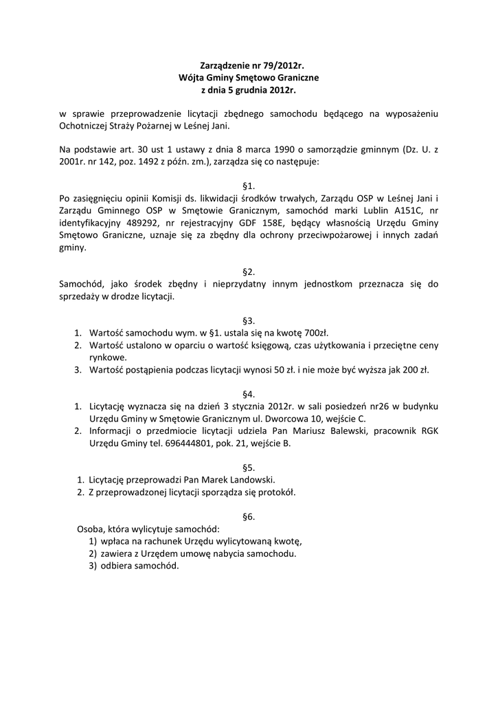 Zarządzenie nr 79/2012r. Wójta Gminy Smętowo Graniczne z dnia 5 grudnia 2012r. w sprawie przeprowadzenie licytacji zbędnego samochodu będącego na wyposażeniu Ochotniczej Straży Pożarnej w Leśnej Jani. Na podstawie art. 30 ust 1 ustawy z dnia 8 marca 1990 o samorządzie gminnym (Dz. U. z 2001r. nr 142, poz. 1492 z późn. zm.), zarządza się co następuje: §1. Po zasięgnięciu opinii Komisji ds. likwidacji środków trwałych, Zarządu OSP w Leśnej Jani i Zarządu Gminnego OSP w Smętowie Granicznym, samochód marki Lublin A151C, nr identyfikacyjny 489292, nr rejestracyjny GDF 158E, będący własnością Urzędu Gminy Smętowo Graniczne, uznaje się za zbędny dla ochrony przeciwpożarowej i innych zadań gminy. §2. Samochód, jako środek zbędny i nieprzydatny innym jednostkom przeznacza się do sprzedaży w drodze licytacji. §3. 1. Wartość samochodu wym. w §1. ustala się na kwotę 700zł. 2. Wartość ustalono w oparciu o wartość księgową, czas użytkowania i przeciętne ceny rynkowe. 3. Wartość postąpienia podczas licytacji wynosi 50 zł. i nie może być wyższa jak 200 zł. §4. 1. Licytację wyznacza się na dzień 3 stycznia 2012r. w sali posiedzeń nr26 w budynku Urzędu Gminy w Smętowie Granicznym ul. Dworcowa 10, wejście C. 2. Informacji o przedmiocie licytacji udziela Pan Mariusz Balewski, pracownik RGK Urzędu Gminy tel. 696444801, pok. 21, wejście B. §5. 1. Licytację przeprowadzi Pan Marek Landowski. 2. Z przeprowadzonej licytacji sporządza się protokół. §6. Osoba, która wylicytuje samochód: 1) wpłaca na rachunek Urzędu wylicytowaną kwotę, 2) zawiera z Urzędem umowę nabycia samochodu. 3) odbiera samochód. §7. Zarządzenie umieszcza się w BIP w zakładce „zamówienia publiczne i ogłoszenia” na okres 14 dni. §8. Wykonanie zarządzenia powierza się przeprowadzającemu licytację. §9. Zarządzenie wchodzi w życie z dniem podjęcia.