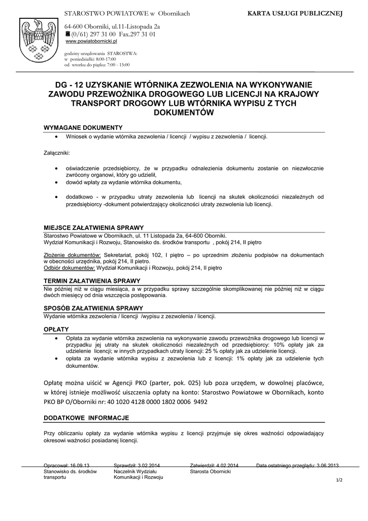 STAROSTWO POWIATOWE w Obornikach KARTA USŁUGI PUBLICZNEJ 64-600 Oborniki, ul.11-Listopada 2a (0/61) 297 31 00 Fax.297 31 01 www.powiatobornicki.pl godziny urzędowania STAROSTWA: w poniedziałki: 8:00-17:00 od wtorku do piątku: 7:00 - 15:00 DG - 12 UZYSKANIE WTÓRNIKA ZEZWOLENIA NA WYKONYWANIE ZAWODU PRZEWOŹNIKA DROGOWEGO LUB LICENCJI NA KRAJOWY TRANSPORT DROGOWY LUB WTÓRNIKA WYPISU Z TYCH DOKUMENTÓW WYMAGANE DOKUMENTY Wniosek o wydanie wtórnika zezwolenia / licencji / wypisu z zezwolenia / licencji. Załączniki: oświadczenie przedsiębiorcy, że w przypadku odnalezienia dokumentu zostanie on niezwłocznie zwrócony organowi, który go udzielił, dowód wpłaty za wydanie wtórnika dokumentu, dodatkowo - w przypadku utraty zezwolenia lub licencji na skutek okoliczności niezależnych od przedsiębiorcy -dokument potwierdzający okoliczności utraty zezwolenia lub licencji. MIEJSCE ZAŁATWIENIA SPRAWY Starostwo Powiatowe w Obornikach, ul. 11 Listopada 2a, 64-600 Oborniki. Wydział Komunikacji i Rozwoju, Stanowisko ds. środków transportu , pokój 214, II piętro Złożenie dokumentów: Sekretariat, pokój 102, I piętro – po uprzednim złożeniu podpisów na dokumentach w obecności urzędnika, pokój 214, II pietro. Odbiór dokumentów: Wydział Komunikacji i Rozwoju, pokój 214, II piętro TERMIN ZAŁATWIENIA SPRAWY Nie później niż w ciągu miesiąca, a w przypadku sprawy szczególnie skomplikowanej nie później niż w ciągu dwóch miesięcy od dnia wszczęcia postępowania. SPOSÓB ZAŁATWIENIA SPRAWY Wydanie wtórnika zezwolenia / licencji /wypisu z zezwolenia / licencji. OPŁATY Opłata za wydanie wtórnika zezwolenia na wykonywanie zawodu przewoźnika drogowego lub licencji w przypadku jej utraty na skutek okoliczności niezależnych od przedsiębiorcy: 10% opłaty jak za udzielenie licencji; w innych przypadkach utraty licencji: 25 % opłaty jak za udzielenie licencji. opłata za wydanie wtórnika wypisu z zezwolenia lub z licencji: 1% opłaty jak za udzielenie tych dokumentów. Opłatę można uiścić w Agencji PKO (parter, pok. 025) lub poza urzędem, w dowolnej placówce, w której istnieje możliwość uiszczenia opłaty na konto: Starostwo Powiatowe w Obornikach, konto PKO BP O/Oborniki nr: 40 1020 4128 0000 1802 0006 9492 DODATKOWE INFORMACJE Przy obliczaniu opłaty za wydanie wtórnika wypisu z licencji przyjmuje się okres ważności odpowiadający okresowi ważności posiadanej licencji. Opracował: 16.09.13 Stanowisko ds. środków transportu Sprawdził: 3.02.2014 Naczelnik Wydziału Komunikacji i Rozwoju Zatwierdził: 4.02.2014 Starosta Obornicki Data ostatniego przeglądu: 3.06.2013 1/2 STAROSTWO POWIATOWE w Obornikach KARTA USŁUGI PUBLICZNEJ 64-600 Oborniki, ul.11-Listopada 2a (0/61) 297 31 00 Fax.297 31 01 www.powiatobornicki.pl godziny urzędowania STAROSTWA: w poniedziałki: 8:00-17:00 od wtorku do piątku: 7:00 - 15:00 PODSTAWA PRAWNA Ustawa z dnia 6 września 2001r. o transporcie drogowym (Dz.U. z 2012r. poz. 1265 ze zm.), Rozporządzenie Ministra Transportu, Budownictwa i Gospodarki Morskiej z dnia 6 sierpnia 2013 r. w sprawie wysokości opłat za czynności administracyjne związane z wykonywaniem przewozu drogowego oraz za egzaminowanie i wydanie certyfikatu kompetencji zawodowych (Dz.U. 2013 poz. 916) Opracował: 16.09.13 Stanowisko ds. środków transportu Sprawdził: 3.02.2014 Naczelnik Wydziału Komunikacji i Rozwoju Zatwierdził: 4.02.2014 Starosta Obornicki Data ostatniego przeglądu: 3.06.2013 2/2