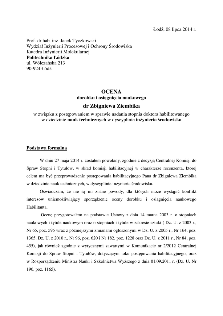 Łódź, 08 lipca 2014 r. Prof. dr hab. inż. Jacek Tyczkowski Wydział Inżynierii Procesowej i Ochrony Środowiska Katedra Inżynierii Molekularnej Politechnika Łódzka ul. Wólczańska 213 90-924 Łódź OCENA dorobku i osiągnięcia naukowego dr Zbigniewa Ziembika w związku z postępowaniem w sprawie nadania stopnia doktora habilitowanego w dziedzinie nauk technicznych w dyscyplinie inżynieria środowiska Podstawa formalna W dniu 27 maja 2014 r. zostałem powołany, zgodnie z decyzją Centralnej Komisji do Spraw Stopni i Tytułów, w skład komisji habilitacyjnej w charakterze recenzenta, której celem ma być przeprowadzenie postępowania habilitacyjnego Pana dr Zbigniewa Ziembika w dziedzinie nauk technicznych, w dyscyplinie inżynieria środowiska. Oświadczam, że nie są mi znane powody, dla których może wystąpić konflikt interesów uniemożliwiający sporządzenie oceny dorobku i osiągnięcia naukowego Habilitanta. Ocenę przygotowałem na podstawie Ustawy z dnia 14 marca 2003 r. o stopniach naukowych i tytule naukowym oraz o stopniach i tytule w zakresie sztuki ( Dz. U. z 2003 r., Nr 65, poz. 595 wraz z późniejszymi zmianami ogłoszonymi w Dz. U. z 2005 r., Nr 164, poz. 1365, Dz. U. z 2010 r., Nr 96, poz. 620 i Nr 182, poz. 1228 oraz Dz. U. z 2011 r., Nr 84, poz. 455), jak również zgodnie z wytycznymi zawartymi w Komunikacie nr 2/2012 Centralnej Komisji do Spraw Stopni i Tytułów, dotyczącym toku postępowania habilitacyjnego, oraz w Rozporządzeniu Ministra Nauki i Szkolnictwa Wyższego z dnia 01.09.2011 r. (Dz. U. Nr 196, poz. 1165). 2 Charakterystyka działalności zawodowej Dr Zbigniew Ziembik ukończył studia magisterskie na Wydziale Matematyki, Fizyki i Chemii Wyższej Szkoły Pedagogicznej w Opolu (obecnie Uniwersytet Opolski), uzyskując w 1986 roku stopień magistra chemii. W tym samym roku został On zatrudniony na rodzimym Wydziale. W 1996 roku na Wydziale Fizyki Technicznej i Matematyki Stosowanej Politechniki Warszawskiej obronił pracę doktorską pt. "Właściwości elektryczne układów przewodnik − matryca nieprzewodząca", otrzymując stopień naukowy doktora nauk fizycznych. Rok później został zatrudniony na stanowisku adiunkta, najpierw w Instytucie Chemii, następnie w Katedrze Technologii, a od 2006 roku, gdzie pracuje do dzisiaj, w Katedrze Biotechnologii i Biologii Molekularnej Uniwersytetu Opolskiego. Od 2012 roku zatrudniony jest na stanowisku starszego wykładowcy. Przez cały okres zatrudnienia (a nawet poczynając od pracy dyplomowej) działalność zawodowa Habilitanta oparta jest na współpracy i opiece ze strony Profesora Witolda Wacławka oraz Profesor Marii Ząbkowskiej-Wacławek, wysokiej klasy badaczy zajmujących się już od ponad 10 lat zagadnieniami ochrony środowiska, wcześniej natomiast specjalizujących się w badaniach organicznych półprzewodników. Habilitant dokonał identycznej transformacji swoich zainteresowań naukowych, zajmując się początkowo badaniami właściwości elektrycznych, fotoelektrycznych i termoelektrycznych kompozytów materiałów organicznych, a następnie, już od wielu lat, biorąc udział w pracach dotyczących monitoringu i biomonitoringu środowiska. Jak widać, cała działalność zawodowa dr Zbigniewa Ziembika związana jest z jedną grupą badawczą i jedną jednostką naukową, jaką jest Uniwersytet Opolski. Z jednej strony fakt ten należy ocenić pozytywnie, świadczy bowiem o możliwości długotrwałego zaangażowania i dogłębnego włączenia się Habilitanta w realizowane prace w jednym zespole, z drugiej jednak strony może też budzić obawy co do zbyt ograniczonego spojrzenia na uprawiane tematyki badawcze oraz podporządkowania się wzorcom i metodom badawczym charakterystycznym tylko dla tego miejsca. Tak też postrzegam brak staży zagranicznych Habilitanta, czy to długoterminowego stażu postdoktorskiego, czy chociażby kilkumiesięcznych wyjazdów do innych renomowanych ośrodków na świecie. W informacjach przedstawionych przez Habilitanta znalazłem jedynie notatkę o tygodniowym wyjeździe studyjnym do Mannheim w 2012 roku. Przegląd literatury światowej, czy nawet wymiana poglądów na konferencjach, nie zastąpią stałego, dłuższego pobytu w innym ośrodku naukowym, co na ogół owocuje nieocenionym poszerzeniem doświadczeń zawodowych. 3 Ocena osiągnięcia naukowego Jako główne swoje osiągnięcie naukowe, stanowiące podstawę postępowania habilitacyjnego, dr Zbigniew Ziembik przedstawił monografię pt. "Wykorzystanie metod statystycznych do opisu akumulacji 137 Cs w glebach leśnych" wydaną nakładem Wydawnictwa Uniwersytetu Opolskiego w 2013 roku. Monografia liczy 154 strony, zawiera 13 rozdziałów (w tym Wnioski i Podsumowanie) oraz Bibliografię złożoną z 309 pozycji literaturowych. Napisana jest bardzo dobrym językiem, a jej konstrukcja pozwala czytelnikowi bez trudu śledzić tok rozumowania Autora. Monografia oparta jest na opublikowanych już w większości wynikach badań, prowadzonych przez Habilitanta od 2006 r. Wyniki te przedstawiono w 5 publikacjach (zał. 3, poz. 15, 16, 18, 20, 26), wszystkie w czasopismach znajdujących się w bazie JCR (o łącznym IF = 4.353). Jedna z nich jest monoautorska (opublikowana w 2014 r. w Journal of Radionalytical and Nuclear Chemistry (IF= 1.467)), w dwóch kolejnych dr Zbigniew Ziembik jest pierwszym autorem, a w dwóch pozostałych Jego udział oceniony jest na 50% w każdej. Przedmiotem monografii jest opis akumulacji 137 Cs w profilach glebowych gleb leśnych z wykorzystaniem różnych metod statystycznych oraz weryfikacja otrzymanych zależności i modeli. Habilitant nakreślił dwa główne cele w tej pracy. Pierwszym z nich było znalezienie korelacji pomiędzy zawartością 137 Cs w poziomach genetycznych gleby a ich podstawowymi właściwościami fizykochemicznymi, takimi jak skład granulometryczny, pH w roztworze wodnym, pHKCl (w 1M roztworze KCl), kwasowość hydrolityczna (