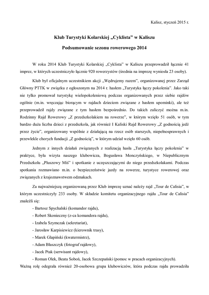Kalisz, styczeń 2015 r. Klub Turystyki Kolarskiej „Cyklista” w Kaliszu Podsumowanie sezonu rowerowego 2014 W roku 2014 Klub Turystyki Kolarskiej „Cyklista” w Kaliszu przeprowadził łącznie 41 imprez, w których uczestniczyło łącznie 920 rowerzystów (średnia na imprezę wyniosła 23 osoby). Klub był oficjalnym uczestnikiem akcji „Wędrujemy razem”, organizowanej przez Zarząd Główny PTTK w związku z ogłoszonym na 2014 r. hasłem „Turystyka łączy pokolenia”. Jako taki nie tylko promował turystykę wielopokoleniową podczas organizowanych przez siebie rajdów ogólnie (m.in. wręczając biorącym w rajdach dzieciom związane z hasłem upominki), ale też przeprowadził rajdy związane z tym hasłem bezpośrednio. Do takich zaliczyć można m.in. Rodzinny Rajd Rowerowy „Z przedszkolakiem na rowerze”, w którym wzięło 51 osób, w tym bardzo duża liczba dzieci z przedszkola, jak również I Kaliski Rajd Rowerowy „Z godnością jedź przez życie”, organizowany wspólnie z działającą na rzecz osób starszych, niepełnosprawnych i przewlekle chorych fundacji „Z godnością”, w którym udział wzięło 60 osób. Jednym z innych działań związanych z realizacją hasła „Turystyka łączy pokolenia” w praktyce, była wizyta naszego klubowicza, Bogusława Monczyńskiego, w Niepublicznym Przedszkolu „Pluszowy Miś” i spotkanie z uczęszczającymi do niego przedszkolakami. Podczas spotkania rozmawiano m.in. o bezpieczeństwie jazdy na rowerze, turystyce rowerowej oraz związanych z krajoznawstwem odznakach. Za najważniejszą organizowaną przez Klub imprezę uznać należy rajd „Tour de Calisia”, w którym uczestniczyły 233 osoby. W składzie komitetu organizacyjnego rajdu „Tour de Calisia” znaleźli się: - Bartosz Spychalski (komandor rajdu), - Robert Skonieczny (z-ca komandora rajdu), - Izabela Szymczak (sekretariat), - Jarosław Karpisiewicz (kierownik trasy), - Marek Glapiński (kwatermistrz), - Adam Błaszczyk (fotograf rajdowy), - Jacek Ptak (serwisant rajdowy), - Roman Olek, Beata Soboń, Jacek Szczepański (pomoc w pracach organizacyjnych). Ważną rolę odegrała również 20-osobowa grupa klubowiczów, która podczas rajdu prowadziła grupy uczestników. W 2014 r. Klub był również oficjalnym uczestnikiem obchodów rocznicy 100-lecia zburzenia Kalisza, w ramach których przeprowadzone zostały 2 rajdy: I Kaliski Rajd „Poznaj Kalisz i okolice” oraz „Tour de Calisia – VI Setka Cyklisty”. Klub był także oficjalnym uczestnikiem akcji „Weekend Polska na Rowery”, włączając się w nią realizacją rajdu „Nad Przygodzickie Stawy”. Bartosz Spychalski, jako delegat Klubu, uczestniczył w XVII Krajowej Konferencji Aktywu Kolarskiego PTTK, gdzie jednym z punktów był wybór nowego składu Komisji Turystyki Kolarskiej Zarządu Głównego PTTK. Klubowicze KTK „Cyklista” w Kaliszu, w odpowiedzi na skierowane do nich zaproszenie, uczestniczyli, obok przedstawicieli władz samorządowych, służb mundurowych i przedstawicieli WORD, w uroczystym otwarciu miasteczko ruchu drogowego. Głos podczas otwarcia zabrał prezes Klubu, Marek Glapiński, a cała grupa wraz z młodzieżą przejechała drogami miasteczka. W minionym roku Klub Turystyki Kolarskiej „Cyklista” w Kaliszu wzbogacił się o trzech nowych przodowników turystyki kolarskiej. Po ukończonym kursie i zdanym egzaminie uprawnienia te otrzymali: - Krystyna Glapińska, - Marek Glapiński, - Bartosz Spychalski. Istotną kwestią, jaką udało się sfinalizować w minionym roku, było stworzenie oraz zatwierdzenie Regulaminu Klubu oraz Regulaminu organizowanych przez Klub rajdów. Dzięki wieloletnim staraniom przedstawicieli zarządu Klubu różnych kadencji, jak również przychylności władz Kaliskiego Oddziału PTTK, Klub otrzymał do dyspozycji pokój w siedzibie PTTK przy ul. Łódzkiej. Były prezes Klubu, Bartosz Spychalski, uczestniczył w uzgodnieniach związanych z rozwojem infrastruktury rowerowej w Kaliszu, czego jednym z efektów jest zwiększona liczba profesjonalnych stojaków rowerowych na terenie miasta. W 2014 r. podjęto współpracę z jednym z kaliskich sklepów rowerowych, w którym klubowicze z aktualnie opłaconą składką członkowską mogą skorzystać ze zniżek na usługi serwisowe. Klub wzbogacił się o nowe flagi: z logo Klubu, PTTK, herbem powiatu i miasta. Domknięta została sprawa klubowych polarów i przygotowany został program do ich haftu, dzięki czemu zainteresowani nimi klubowicze nie będą w przyszłości obciążeni jego kosztem. Nadal prowadzona i rozwijana była klubowa strona internetowa, jak również klubowe konto na Facebook’u. Z dniem 6 sierpnia 2014 r. Bartosz Spychalski złożył rezygnację z funkcji prezesa Klubu oraz członka zarządu Klubu. W wyniku tego, w dniu 26 września odbyło się Walne Zgromadzenie Klubowiczów KTK „Cyklista” w Kaliszu zwołane na wniosek 37 klubowiczów. Ważnym punktem spotkania było przedstawienie sprawozdania z działalności klubu za okres od 22 lutego 2013 r. do 6 sierpnia 2014 r. przez byłego prezesa, który przedstawił następnie zebranym powód swojej rezygnacji. Bezpośrednio po tym złożony został wniosek o rozwiązanie aktualnego Zarządu Klubu. Zarząd został rozwiązany głosami większości klubowiczów. W odpowiedzi na kolejny złożony wniosek przeprowadzono głosowanie nad absolutorium dla poszczególnych członków byłego już Zarządu. Absolutorium udzielono 3 członkom byłego Zarządu Klubu: Bartoszowi Spychalskiemu – byłemu prezesowi Klubu, Markowi Glapińskiemu – byłemu wiceprezesowi Klubu oraz Grzegorzowi Cuske – byłemu skarbnikowi Klubu. Następstwem tego było przeprowadzenie tajnych wyborów, w których klubowicze wybrali członków nowego Zarządu Klubu. Spośród 7 startujących do Zarządu osób, zgodnie z regulaminem Klubu wybrano 5 osób z najwyższa liczbą głosów, które następnie uzgodniły pomiędzy sobą 