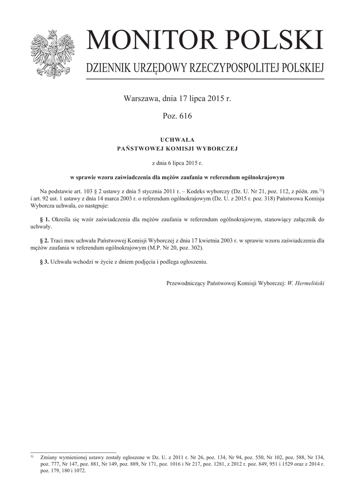 MONITOR POLSKI DZIENNIK URZĘDOWY RZECZYPOSPOLITEJ POLSKIEJ Warszawa, dnia 17 lipca 2015 r. Poz. 616 Uchwała Państwowej Komisji Wyborczej z dnia 6 lipca 2015 r. w sprawie wzoru zaświadczenia dla mężów zaufania w referendum ogólnokrajowym Na podstawie art. 103 § 2 ustawy z dnia 5 stycznia 2011 r. – Kodeks wyborczy (Dz. U. Nr 21, poz. 112, z późn. zm.1)) i art. 92 ust. 1 ustawy z dnia 14 marca 2003 r. o referendum ogólnokrajowym (Dz. U. z 2015 r. poz. 318) Państwowa Komisja Wyborcza uchwala, co następuje: § 1. Określa się wzór zaświadczenia dla mężów zaufania w referendum ogólnokrajowym, stanowiący załącznik do uchwały. § 2. Traci moc uchwała Państwowej Komisji Wyborczej z dnia 17 kwietnia 2003 r. w sprawie wzoru zaświadczenia dla mężów zaufania w referendum ogólnokrajowym (M.P. Nr 20, poz. 302). § 3. Uchwała wchodzi w życie z dniem podjęcia i podlega ogłoszeniu. Przewodniczący Państwowej Komisji Wyborczej: W. Hermeliński 1) Zmiany wymienionej ustawy zostały ogłoszone w Dz. U. z 2011 r. Nr 26, poz. 134, Nr 94, poz. 550, Nr 102, poz. 588, Nr 134, poz. 777, Nr 147, poz. 881, Nr 149, poz. 889, Nr 171, poz. 1016 i Nr 217, poz. 1281, z 2012 r. poz. 849, 951 i 1529 oraz z 2014 r. poz. 179, 180 i 1072. Monitor Polski –2– Poz. 616 Załącznik do uchwały Państwowej Komisji Wyborczej z dnia 6 lipca 2015 r. (poz. 616) WZÓR ZAŚWIADCZENIE DLA MĘŻA ZAUFANIA Pan/Pani: Drugie imię Imię Nazwisko Numer PESEL jest wyznaczony(-na) przez .......................................................................................................... (pełna nazwa podmiotu uprawnionego do udziału w kampanii referendalnej) ....................................................................................................................................................... do sprawowania funkcji męża zaufania/zastępcy męża zaufania∗) w celu obserwacji: 1) przebiegu głosowania i ustalenia wyników głosowania w obwodzie głosowania nr … w ............................................................................................................................. ∗) (nazwa miejscowości, gmina i województwo) 2) ustalenia wyników głosowania przez Komisarza Wyborczego w ................................... ∗) 3) ustalenia wyniku referendum przez Państwową Komisję Wyborczą∗) w referendum ogólnokrajowym zarządzonym na dzień ..................................... . ................................................... (nazwa miejscowości, data) ∗) ∗∗) .......................................................... (podpis z podaniem imienia i nazwiska osoby upoważnionej do wyznaczenia męża zaufania ∗∗ w imieniu podmiotu uprawnionego) ) Niepotrzebne skreślić lub pominąć. Zaświadczenie należy okazać łącznie z kopią dokumentu upoważniającego do wyznaczenia męża zaufania w imieniu podmiotu uprawnionego do udziału w kampanii referendalnej.