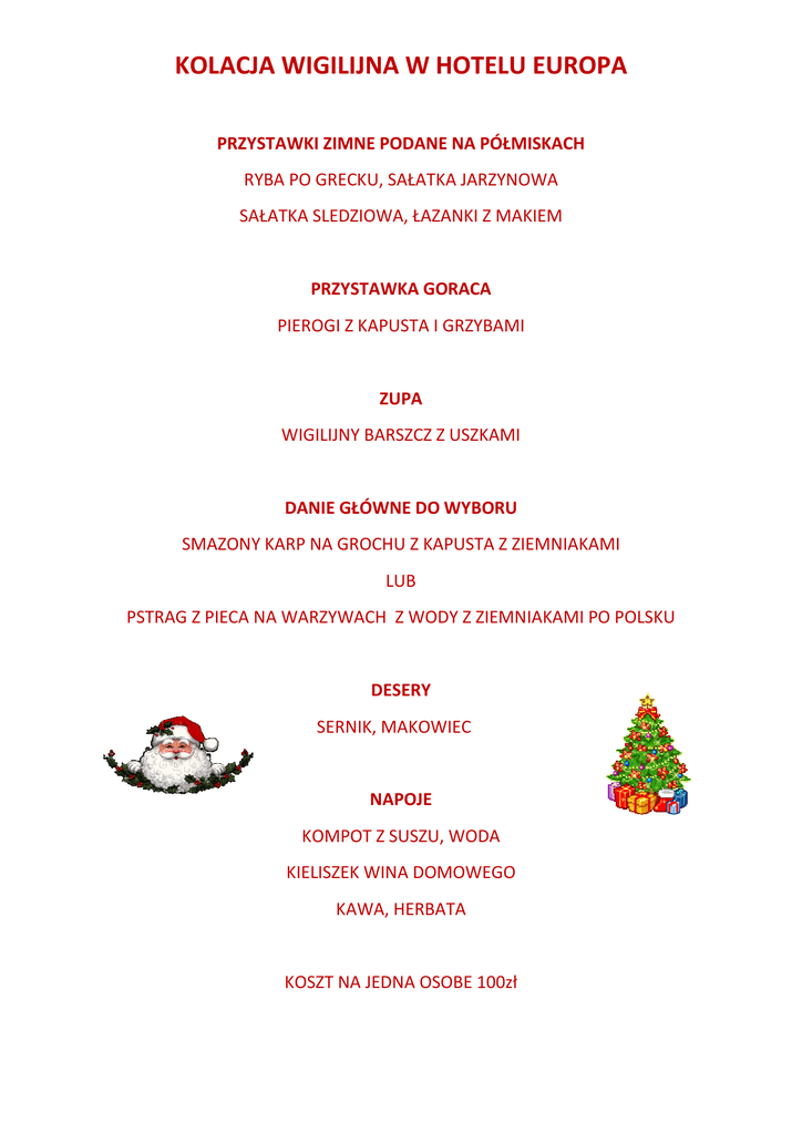 KOLACJA WIGILIJNA W HOTELU EUROPA PRZYSTAWKI ZIMNE PODANE NA PÓŁMISKACH RYBA PO GRECKU, SAŁATKA JARZYNOWA SAŁATKA SLEDZIOWA, ŁAZANKI Z MAKIEM PRZYSTAWKA GORACA PIEROGI Z KAPUSTA I GRZYBAMI ZUPA WIGILIJNY BARSZCZ Z USZKAMI DANIE GŁÓWNE DO WYBORU SMAZONY KARP NA GROCHU Z KAPUSTA Z ZIEMNIAKAMI LUB PSTRAG Z PIECA NA WARZYWACH Z WODY Z ZIEMNIAKAMI PO POLSKU DESERY SERNIK, MAKOWIEC NAPOJE KOMPOT Z SUSZU, WODA KIELISZEK WINA DOMOWEGO KAWA, HERBATA KOSZT NA JEDNA OSOBE 100zł KOLACJA WIGILIJNA W HOTELU EUROPA PRZYSTAWKI ZIMNE PODANE NA PÓŁMISKACH RYBA PO GRECKU, SAŁATKA SLEDZIOWA, ŁAZANKI Z MAKARONEM, PSTRAG W GALARECIE PRZYSTAWKA GORACA PIEROGI Z KAPUSTA I GRZYBAMI, KULEBIAK Z KAPUSTA I GRZYBAMI ZUPA WIGILIJNY BARSZCZ Z USZKAMI LUB ZUPA RYBNA DANIE GŁÓWNE SERWOWANE NA PÓŁMISKACH SMAZONY KARP, ŁOSOS PIECZONY GROCH Z KAPUSTA, ZIEMNIAKI, RYZ SZAFRANOWY BUKIET SAŁAT OGRODOWYCH DESERY SERNIK DOMOWY, MAKOWIEC, KUTIA NAPOJE KOMPOT Z SUSZU, WODA KIELISZEK WINA DOMOWEGO KAWA, HERBATA KOSZT NA JEDNA OSOBE 110zł KOLACJA WIGILIJNA W HOTELU EUROPA PRZYSTAWKI ZIMNE PODANE NA PÓŁMISKACH RYBA PO GRECKU, PSTRAG W GALARECIE ŁAZANKI Z MAKIEM PRZYSTAWKA GORACA PIEROGI Z KAPUSTA I GRZYBAMI, KULEBIAK Z ŁOSOSIEM ZUPA WIGILIJNY BARSZCZ Z USZKAMI LUB ZUPA GRZYBOWA Z RAVIOLI DANIE GŁÓWNE SERWOWANE NA PÓŁMISKACH SMAZONY KARP, ŁOSOS PIECZONY GROCH Z KAPUSTA, ZIEMNIAKI, RYZ SZAFRANOWY BUKIET SAŁAT OGRODOWYCH DESERY SERNIK DOMOWY, MAKOWIEC, KUTIA NAPOJE KOMPOT Z SUSZU, WODA KIELISZEK WINA DOMOWEGO KAWA, HERBATA KOSZT NA JEDNA OSOBE 130zł
