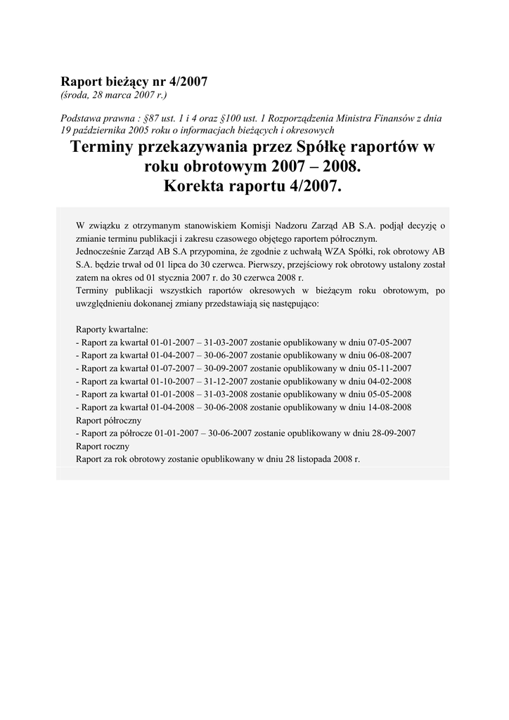 Raport bieŜący nr 4/2007 (środa, 28 marca 2007 r.) Podstawa prawna : §87 ust. 1 i 4 oraz §100 ust. 1 Rozporządzenia Ministra Finansów z dnia 19 października 2005 roku o informacjach bieŜących i okresowych Terminy przekazywania przez Spółkę raportów w roku obrotowym 2007 – 2008. Korekta raportu 4/2007. W związku z otrzymanym stanowiskiem Komisji Nadzoru Zarząd AB S.A. podjął decyzję o zmianie terminu publikacji i zakresu czasowego objętego raportem półrocznym. Jednocześnie Zarząd AB S.A przypomina, Ŝe zgodnie z uchwałą WZA Spółki, rok obrotowy AB S.A. będzie trwał od 01 lipca do 30 czerwca. Pierwszy, przejściowy rok obrotowy ustalony został zatem na okres od 01 stycznia 2007 r. do 30 czerwca 2008 r. Terminy publikacji wszystkich raportów okresowych w bieŜącym roku obrotowym, po uwzględnieniu dokonanej zmiany przedstawiają się następująco: Raporty kwartalne: - Raport za kwartał 01-01-2007 – 31-03-2007 zostanie opublikowany w dniu 07-05-2007 - Raport za kwartał 01-04-2007 – 30-06-2007 zostanie opublikowany w dniu 06-08-2007 - Raport za kwartał 01-07-2007 – 30-09-2007 zostanie opublikowany w dniu 05-11-2007 - Raport za kwartał 01-10-2007 – 31-12-2007 zostanie opublikowany w dniu 04-02-2008 - Raport za kwartał 01-01-2008 – 31-03-2008 zostanie opublikowany w dniu 05-05-2008 - Raport za kwartał 01-04-2008 – 30-06-2008 zostanie opublikowany w dniu 14-08-2008 Raport półroczny - Raport za półrocze 01-01-2007 – 30-06-2007 zostanie opublikowany w dniu 28-09-2007 Raport roczny Raport za rok obrotowy zostanie opublikowany w dniu 28 listopada 2008 r.