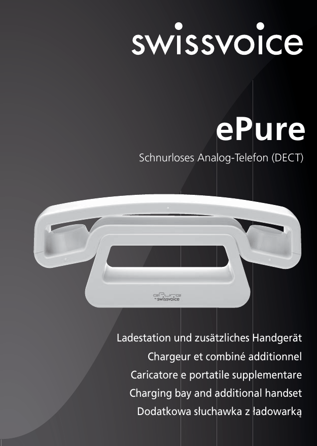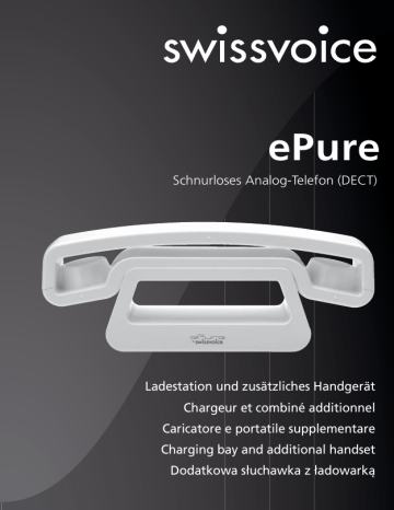 ePure Schnurloses Analog-Telefon (DECT) Ladestation und zusätzliches Handgerät Chargeur et combiné additionnel Caricatore e portatile supplementare Charging bay and additional handset Dodatkowa słuchawka z ładowarką ePure Accessories ePure Accessories Bitte beachten Sie: Weitere Informationen entnehmen Sie bitte der Bedienungsanleitung ePure. Sprache einstellen Bei Auslieferung ist Englisch eingestellt. Um die Sprache zu ändern: • drücken, Personal set auswählen und OK drücken. • Language auswählen und OK drücken. • Wählen Sie die gewünschte Sprache, bestätigen Sie mit OK. Die Displaytexte erscheinen nun in der gewünschten Sprache. Neues Mobilteil anmelden Das mitgelieferte Mobilteil ist noch nicht an der Basisstation angemeldet. Jedes zusätzliche Mobilteil muss zuerst an der Basis angemeldet werden, damit es funktionsfähig ist. Vorgehen, um zusätzliche Mobilteile an Ihrer Hauptbasis anzumelden (die Basis, die Sie mit dem Telefonnetz verbunden haben): 1. Mobilteil, das Sie neu anmelden möchten, von der ursprünglichen Basis abmelden: • drücken, Erw. Einst. auswählen und OK drücken. • Abmelden auswählen und OK drücken. • Möglicherweise verlangt das ePure nun die PIN. Gegebenenfalls PIN eingeben (0000 bei Auslieferung) und OK drücken. • Zur Bestätigung erneut OK drücken. Ihr Mobilteil ist nun an keiner Basis mehr angemeldet. 2. Hauptbasis (Basis, die Sie mit dem Telefonnetz verbunden haben) zur Anmeldung zusätzlicher Mobilteile vorbereiten: • Drücken und halten Sie die Ruf- (Paging) Taste an der Basis, die Sie als Hauptbasis verwenden wollen während ca. 10 Sekunden (die Paging-Taste befindet sich unter der Basisstation). 3. • • • • Zusätzliches Mobilteil anmelden: drücken, Erw. Einst. auswählen und OK drücken. Anmelden auswählen und OK drücken. Basis anmeld auswählen und OK drücken. Auf dem Mobilteil wird Basis 1 2 3 4 angezeigt. Wählen Sie jetzt die Hauptbasis aus (1 bei Auslieferung). ePure Accessories ePure Accessories • • • Nach einigen Sekunden werden Sie zur Eingabe der PIN aufgefordert. PIN eingeben (0000 bei Auslieferung). OK drücken. Ist die Anmeldung erfolgreich, erhalten Sie nach Drücken der Abheben-Taste das Freizeichen und das Mobilteil geht innerhalb einer Minute in den Bereitschaftszustand. Dieses Vorgehen für jedes zusätzliche Mobilteil vollständig wiederholen. Falls die Anmeldung erfolglos sein sollte: • Speisung der Basis und des Handapparates für einige Sekunden unterbrechen (Netzadapter ausstecken bzw. Akku entfernen). • Anmeldevorgang wiederholen. Entsorgungshinweis (Umweltschutz) Am Ende der Lebensdauer des Produkts darf das Gerät nicht im normalen Hausmüll entsorgt werden. Bringen Sie es zu einer Sammelstelle zur Aufbereitung elektrischer und elektronischer Geräte. Das Symbol am Produkt, in der Bedienungsanleitung und/oder Verpackung zeigt dies an. Einige der Materialien des Produkts können wiederverwendet werden, wenn Sie das Gerät in einer Aufbereitungsstelle abgeben. Mit der Wiederverwertung einiger Teile oder Rohmaterialien aus gebrauchten Produkten leisten Sie einen wichtigen Beitrag zum Umweltschutz. Wenden Sie sich bitte an Ihre örtlichen Behörden, wenn Sie weitere Informationen über Sammelstellen in Ihrer Umgebung benötigen. Batterien-/Akku-Entsorgung Für alle verbrauchten Batterien und Akkus besteht eine gesetzliche Rückgabepflicht; sie dürfen nicht über den Hausmüll entsorgt werden. Entsorgen Sie die Batterien/ Akkus entsprechend den behördlichen Auflagen. Führen Sie sie der Wiederverwertung zu. Die Batterien/Akkus werden recycelt, da sie z. B. Lithium (Li), Nickel - Cadmium (Ni - Cd), Blei (Pb), Cadmium (Cd) oder QuecksiIber (Hg) enthalten können. Die Batterien/Akkus sind mit Symbolen und ihrem Inhaltsstoff gekennzeichnet, z. B.: Garantiebestimmungen Auf Ihr Gerät wird Sachmängelhaftung ab Kaufdatum im Rahmen der gesetzlichen Bestimmungen des Landes, in dem Sie Ihr Gerät gekauft haben, gewährt. Zum Nachweis des Kaufdatums bewahren Sie bitte den Kaufbeleg oder die durch die ePure Accessories 1 ePure Accessories Verkaufsstelle komplett ausgefüllte Garantiekarte auf. Innerhalb der Garantiezeit werden unentgeltlich alle Mängel, die auf Material- und Herstellungsfehlern beruhen, beseitigt. Die Garantieleistung erfolgt durch Reparatur oder Austausch des defekten Gerätes nach Wahl des Lieferanten. Von der Garantie ausgenommen sind Verbrauchsmaterialien (z. B. Akkuzelle), Mängel, die den Wert oder Gebrauch des Gerätes nur unerheblich beeinträchtigen, sowie Schäden, die auf unsachgemässen Gebrauch, auf Verschleiss oder auf Eingriffe durch Dritte, zurückzuführen sind. Eventuelle Folgeschäden, hervorgerufen durch die Nutzung, den Ausfall oder Mängel des Produktes, insbesondere jede Haftung für Vermögensschäden sind von dieser Garantie ausgeschlossen. Im Garantiefall wenden Sie sich bitte an die Verkaufsstelle, bei der Sie das Telefon gekauft haben. Hinweis für Deutschland Falls die Ware aufgrund von Herstellungs- und/oder Materialfehlern innerhalb von 24 Monaten ab Kauf einen Defekt aufweist senden Sie Ihr Produkt bitte komplett mit Zubehör und Kaufbeleg an das Swissvoice Service Center Im Frauental 14 92224 Amberg. Dieses entscheidet über Austausch oder Reparatur der Ware. Für den Akku gilt ein Zeitraum von 6 Monaten ab Kaufdatum. Rufnummer für technische Fragen (Deutschland) Für Hotline, Reparaturen, Ersatzteile, technische Fragen und Garantieabwicklung Von Montag bis Freitag von 09:00 Uhr bis 18:00 Uhr Bitte rufen Sie 0180 55 82 888 (Euro 0,14 / Minute) E-mail: [email protected] Zulassung und Konformität Dieses analoge Telefon DECT entspricht den grundlegenden Anforderungen der R&TTE Richtlinie 1999/5/EG über Funkanlagen und Telekommunikationsendeinrichtungen und ist geeignet zum Anschluss und Betrieb in demjenigen Land, in welchem das Gerät verkauft wurde. Die Konformitätserklärung ist auf folgender Webseite abrufbar: www.swissvoice.net.