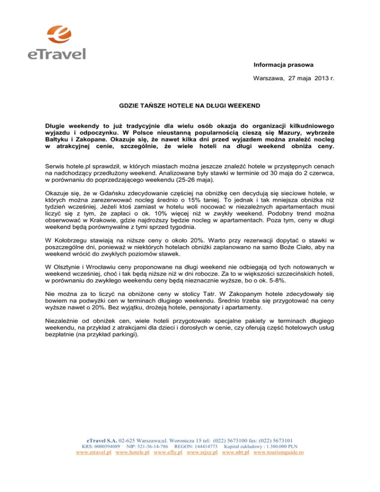 Informacja prasowa Warszawa, 27 maja 2013 r. GDZIE TAŃSZE HOTELE NA DŁUGI WEEKEND Długie weekendy to już tradycyjnie dla wielu osób okazja do organizacji kilkudniowego wyjazdu i odpoczynku. W Polsce nieustanną popularnością cieszą się Mazury, wybrzeże Bałtyku i Zakopane. Okazuje się, że nawet kilka dni przed wyjazdem można znaleźć nocleg w atrakcyjnej cenie, szczególnie, że wiele hoteli na długi weekend obniża ceny. Serwis hotele.pl sprawdził, w których miastach można jeszcze znaleźć hotele w przystępnych cenach na nadchodzący przedłużony weekend. Analizowane były stawki w terminie od 30 maja do 2 czerwca, w porównaniu do poprzedzającego weekendu (25-26 maja). Okazuje się, że w Gdańsku zdecydowanie częściej na obniżkę cen decydują się sieciowe hotele, w których można zarezerwować nocleg średnio o 15% taniej. To jednak i tak mniejsza obniżka niż tydzień wcześniej. Jeżeli ktoś zamiast w hotelu woli nocować w niezależnych apartamentach musi liczyć się z tym, że zapłaci o ok. 10% więcej niż w zwykły weekend. Podobny trend można obserwować w Krakowie, gdzie najdroższy będzie nocleg w apartamentach. Poza tym, ceny w długi weekend będą porównywalne z tymi sprzed tygodnia. W Kołobrzegu stawiają na niższe ceny o około 20%. Warto przy rezerwacji dopytać o stawki w poszczególne dni, ponieważ w niektórych hotelach obniżki zaplanowano na samo Boże Ciało, aby na weekend wrócić do zwykłych poziomów stawek. W Olsztynie i Wrocławiu ceny proponowane na długi weekend nie odbiegają od tych notowanych w weekend wcześniej, choć i tak będą niższe niż w dni robocze. Za to w większości szczecińskich hoteli, w porównaniu do zwykłego weekendu ceny będą nieznacznie wyższe, bo o ok. 5-8%. Nie można za to liczyć na obniżone ceny w stolicy Tatr. W Zakopanym hotele zdecydowały się bowiem na podwyżki cen w terminach długiego weekendu. Średnio trzeba się przygotować na ceny wyższe nawet o 20%. Bez wyjątku, drożeją hotele, pensjonaty i apartamenty. Niezależnie od obniżek cen, wiele hoteli przygotowało specjalne pakiety w terminach długiego weekendu, na przykład z atrakcjami dla dzieci i dorosłych w cenie, czy oferują część hotelowych usług bezpłatnie (na przykład parkingi). eTravel S.A. 02-625 Warszawa;ul. Woronicza 15 tel: (022) 5673100 fax: (022) 5673101 KRS: 0000394089 NIP: 521-36-14-786 REGON: 144414773 Kapitał zakładowy : 1.380.000 PLN www.etravel.pl www.hotele.pl www.efly.pl www.rejsy.pl www.nbt.pl www.tourismguide.ro