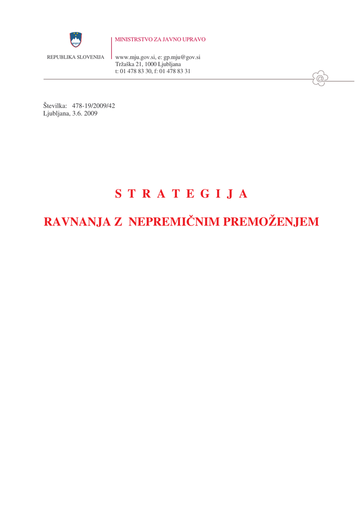 MINISTRSTVO ZA JAVNO UPRAVO REPUBLIKA SLOVENIJA www.mju.gov.si, e: [email protected] Tržaška 21, 1000 Ljubljana t: 01 478 83 30, f: 01 478 83 31 Številka: 478-19/2009/42 Ljubljana, 3.6. 2009 S T R A T E G I J A RAVNANJA Z NEPREMI NIM PREMOŽENJEM I. UVOD ________________________________________________________________ 3 II. USMERITVE NA PODRO JU RAVNANJA Z NEPREMI NIM PREMOŽENJEM V OKVIRU VELJAVNE NORMATIVNE UREDITVE ___________________________ 4 1. 2. Pridobivanje nepremi nega premoženja za potrebe Republike Slovenije 4 Razpolaganje z nepremi nim premoženjem v lasti Republike Slovenije ___________ 7 2.1. Prodaja _________________________________________________________ 7 2.2. Brezpla na odsvojitev nepremi nega premoženja v lasti Republike Slovenije __ 9 3. Najemanje nepremi nega premoženja za potrebe Republike Slovenije ___________ 11 4. Sodelovanje samoupravnih lokalnih skupnosti pri izvedbi investicij Republike Slovenije vklju no z uporabo nepremi nin v lasti ob in na podlagi 103. lena zakona o upravi______________________________________________________________ 12 5. Oddajanje nepremi nega premoženja v lasti Republike Slovenije v najem ________ 13 6. Brezpla na uporaba nepremi nega premoženja v lasti Republike Slovenije _______ 13 7. Ustanavljanje stavbne pravice na nepremi nem premoženju v lasti Republike Slovenije ___________________________________________________________ 14 8. »Centralna evidenca nepremi nin v lasti Republike Slovenije« in interni trg nepremi nin_________________________________________________________ 17 9. Ravnanje s strateškimi nepremi ninami v lasti Republike Slovenije _____________ 19 10. Ravnanje z nepremi ninami, ki imajo status javnega dobra ____________________ 21 III. CENTRALIZACIJA RAVNANJA Z NEPREMI NIM PREMOŽENJEM KOT NADALJNJI RAZVOJ SISTEMA _________________________________________ 22 2/24 I. UVOD Namen sprejema Strategije ravnanja z nepremi nim premoženjem je uresni evanje na ela gospodarnosti. Strategija ravnanja z nepremi nim premoženjem so obvezne usmeritve, ki so jih dolžni spoštovati vsi upravljavci nepremi nega premoženja Republike Slovenije in organi pristojni za reševanje prostorske problematike, kadar ravnajo z nepremi nim premoženjem na podlagi splošnih predpisov. Strategija ravnanja z nepremi nim premoženjem ni obvezna za Državni zbor Republike Slovenije, Državni svet Republike Slovenije, Ustavno sodiš e Republike Slovenije, Ra unsko sodiš e Republike Slovenije, Varuha lovekovih pravic ter druge samostojne in od Vlade Republike Slovenije neodvisne državne organe. V to ki, v kateri se Strategija ravnanja z nepremi nim premoženjem dotika samoupravnih lokalnih skupnosti, so z njimi mišljene ob ine oziroma mestne ob ine, po uveljavitvi predpisov o pokrajinah, pa bo Vlada Republike Slovenije po potrebi dopolnila ali spremenila posamezne usmeritve iz te Strategije. Strategija ravnanja z nepremi nim premoženjem se nanaša na celotno nepremi no premoženje, ki je last Republike Slovenije kot tudi na nepremi no premoženje, ki je last tretjih, pa ga osebe javnega prava iz državne sfere uporabljajo za opravljanje svojih nalog, e ni v tej strategiji posebej poudarjeno, da se posamezne usmeritve nanašajo na ožji sklop premoženja. Vsaka odlo itev o ravnanju z nepremi nim premoženjem v lasti države temelji v prvi vrsti na zaklju ku, da ta prinaša Republiki Sloveniji najve je možne ekonomske u inke. Dolžnost gospodarnega ravnanja z nepremi ninami nalaga upravljavcem že Zakon o stvarnem premoženju države, pokrajin in ob in (Uradni list RS, št. 14/07, v nadaljevanju: Zakon). Upravljavci morajo poskrbeti, da se postopki prodaje vodijo skladno z veljavno zakonodajo, vse aktivnosti pa morajo biti takšne, da prinesejo najboljši rezultat za državo, kar pomeni najve ji možen ekonomski u inek. Upravljavci nepremi nega premoženja v lasti države in organi pristojni za reševanje prostorske problematike, so zato pri pripravi posami nih programov ravnanja v vsebinskem smislu dolžni dati osrednji poudarek obrazložitvi ekonomske utemeljenosti predlaganega pravnega posla. Kot pomanjkljivost trenutno veljavne zakonodaje na podro ju ravnanja z nepremi ninami se po izkušnjah iz prakse kaže dejstvo, da je sistem upravljanja prepuš en v odlo anje posameznih upravljavcev, kar onemogo a usklajeno ter gospodarno nepremi ninsko politiko. Na to opozarja tudi Ra unsko sodiš e Republike Slovenije v Revizijskem poro ilu o gospodarjenju z nezazidanimi stavbnimi zemljiš i številka: 1209-1/2007-33, z dne 15. 9. 2008, v nadaljevanju: Revizijsko poro ilo o gospodarjenju z nezazidanimi stavbnimi zemljiš i iz leta 2008. Iz tega razloga je potrebno razmisliti o vzpostaviti sistema, ki bo omogo al usmerjanje k enotnemu ravnanju vseh organov že pri samem sklepanju pravnih poslov. Ministrstvo za javno upravo bo tako pripravilo spremembo predpisov, bodisi v smeri, da se bo okrepila nadzorna vloga Vlade Republike Slovenije pri pravnih poslih, ki se nanašajo na pridobivanje nepremi nega premoženja, na razpolaganje z nepremi nim premoženjem v lasti države ter na obremenjevanje tega premoženja, bodisi v smeri centralizacije ravnanja z nepremi nim premoženjem v lasti Republike Slovenije. Razvoj sistema ravnanja z nepremi nim premoženjem države je odvisen od usmeritev, ki jih bo podala Vlada Republike Slovenije. 3/24 II. USMERITVE NA PODRO JU RAVNANJA Z NEPREMI NIM PREMOŽENJEM V OKVIRU VELJAVNE NORMATIVNE UREDITVE 1. Pridobivanje nepremi nega premoženja za potrebe Republike Slovenije 1.1. Pri zagotavljanju prostorskih rešitev je treba poiskati trajne rešitve v skladu z merili in na rti reševanja prostorske problematike, ki veljajo za posamezno skupino prostorov, pri emer se za potrebe organov državne uprave uporabljajo »Merila za ureditev poslovnih prostorov za potrebe državne uprave« ter ustrezni na rti reševanja prostorske problematike. V vseh tistih primerih, ko za posebno skupino prostorov še ni izdelanih posebnih 