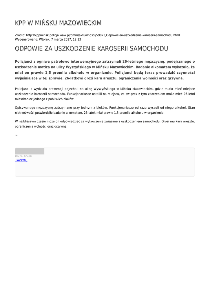 KPP W MIŃSKU MAZOWIECKIM Źródło: http://kppminsk.policja.waw.pl/pmm/aktualnosci/59073,Odpowie-za-uszkodzenie-karoserii-samochodu.html Wygenerowano: Wtorek, 7 marca 2017, 12:13 ODPOWIE ZA USZKODZENIE KAROSERII SAMOCHODU Policjanci z ogniwa patrolowo interwencyjnego zatrzymali 26-letniego mężczyznę, podejrzanego o uszkodzenie matiza na ulicy Wyszyńskiego w Mińsku Mazowieckim. Badanie alkomatem wykazało, że miał on prawie 1,5 promila alkoholu w organizmie. Policjanci będą teraz prowadzić czynności wyjaśniające w tej sprawie. 26-latkowi grozi kara aresztu, ograniczenia wolności oraz grzywna. Policjanci z wydziału prewencji pojechali na ulicę Wyszyńskiego w Mińsku Mazowieckim, gdzie miało mieć miejsce uszkodzenie karoserii samochodu. Funkcjonariusze ustalili na miejscu, że związek z tym zdarzeniem może mieć 26-letni mieszkaniec jednego z pobliskich bloków. Opisywanego mężczyznę zatrzymano przy jednym z bloków. Funkcjonariusze od razu wyczuli od niego alkohol. Stan nietrzeźwości potwierdziło badanie alkomatem. 26-latek miał prawie 1,5 promila alkoholu w organizmie. W najbliższym czasie może on odpowiedzieć za wykroczenie związane z uszkodzeniem samochodu. Grozi mu kara aresztu, ograniczenia wolności oraz grzywna. dn Ocena: 0/5 (0) Tweetnij