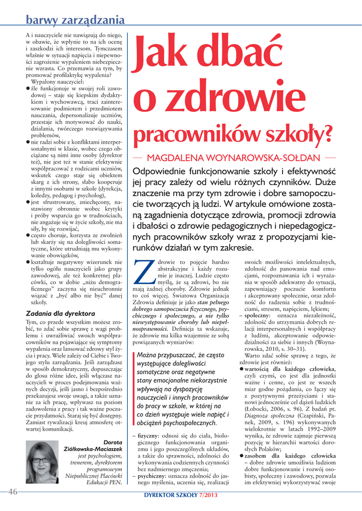 barwy zarządzania A i nauczyciele nie nawiązują do niego, w obawie, że wpłynie to na ich ocenę i zaszkodzi ich interesom. Tymczasem właśnie w sytuacji napięcia i niepewności zagrożenie wypaleniem niebezpiecznie wzrasta. Co przemawia za tym, by promować profilaktykę wypalenia? Wypalony nauczyciel: źle funkcjonuje w swojej roli zawodowej – staje się kiepskim dydaktykiem i wychowawcą, traci zainteresowanie podmiotem i przedmiotem nauczania, depersonalizuje uczniów, przestaje ich motywować do nauki, działania, twórczego rozwiązywania problemów, nie radzi sobie z konfliktami interpersonalnymi w klasie, wobec czego obciążane są nimi inne osoby (dyrektor też), nie jest też w stanie efektywnie współpracować z rodzicami uczniów, wskutek czego staje się obiektem skarg z ich strony, słabo kooperuje z innymi osobami w szkole (dyrekcja, koledzy, pedagog i psycholog), jest sfrustrowany, zniechęcony, nastawiony obronnie wobec krytyki i próby wsparcia go w trudnościach, nie angażuje się w życie szkoły, nie ma siły, by się rozwijać, często choruje, korzysta ze zwolnień lub skarży się na dolegliwości somatyczne, które utrudniają mu wykonywanie obowiązków, kształtuje negatywny wizerunek nie tylko ogółu nauczycieli jako grupy zawodowej, ale też konkretnej placówki, co w dobie „niżu demograficznego” zaczyna się nieuchronnie wiązać z „być albo nie być” danej szkoły. Zadania dla dyrektora Tym, co przede wszystkim możesz zrobić, to zdać sobie sprawę z wagi problemu i uwrażliwiać swoich współpracowników na pojawiające się symptomy wypalenia oraz lansować zdrowy styl życia i pracy. Wiele zależy od Ciebie i Twojego stylu zarządzania. Jeśli zarządzasz w sposób demokratyczny, dopuszczając do głosu różne idee, jeśli włączasz nauczycieli w proces podejmowania ważnych decyzji, jeśli jasno i bezpośrednio przekazujesz swoje uwagi, a także uznanie za ich pracę, wpływasz na poziom zadowolenia z pracy i tak ważne poczucie przydatności. Staraj się być dostępny. Zamiast rywalizacji kreuj atmosferę otwartej komunikacji. Dorota Ziółkowska-Maciaszek jest psychologiem, trenerem, dyrektorem programowym Niepublicznej Placówki Edukacji PEN. 46 Jak dbać o zdrowie pracowników szkoły? MAGDALENA WOYNAROWSKA-SOŁDAN Odpowiednie funkcjonowanie szkoły i efektywność jej pracy zależy od wielu różnych czynników. Duże znaczenie ma przy tym zdrowie i dobre samopoczucie tworzących ją ludzi. W artykule omówione zostaną zagadnienia dotyczące zdrowia, promocji zdrowia i dbałości o zdrowie pedagogicznych i niepedagogicznych pracowników szkoły wraz z propozycjami kierunków działań w tym zakresie. Z drowie to pojęcie bardzo abstrakcyjne i każdy rozumie je inaczej. Ludzie często myślą, że są zdrowi, bo nie mają żadnej choroby. Zdrowie jednak to coś więcej. Światowa Organizacja Zdrowia definiuje je jako stan pełnego dobrego samopoczucia fizycznego, psychicznego i społecznego, a nie tylko niewystępowanie choroby lub niepełnosprawności. Definicja ta wskazuje, że zdrowie ma kilka wzajemnie ze sobą powiązanych wymiarów: Można przypuszczać, że często występujące dolegliwości somatyczne oraz negatywne stany emocjonalne niekorzystnie wpływają na dyspozycję nauczycieli i innych pracowników do pracy w szkole, w której na co dzień występuje wiele napięć i obciążeń psychospołecznych. – fizyczny: odnosi się do ciała, biologicznego funkcjonowania organizmu i jego poszczególnych układów, a także do sprawności, zdolności do wykonywania codziennych czynności bez nadmiernego zmęczenia; – psychiczny: oznacza zdolność do jasnego myślenia, uczenia się, realizacji DYREKTOR SZKOŁY 7/2013 swoich możliwości intelektualnych, zdolność do panowania nad emocjami, rozpoznawania ich i wyrażania w sposób adekwatny do sytuacji, zapewniający poczucie komfortu i akceptowany społecznie, oraz zdolność do radzenia sobie z trudnościami, stresem, napięciem, lękiem; – społeczny: oznacza niezależność, zdolność do utrzymania dobrych relacji interpersonalnych i współpracy z ludźmi, akceptowanie odpowiedzialności za siebie i innych (Woynarowska, 2010, s. 30–31). Warto zdać sobie sprawę z tego, że zdrowie jest również: wartością dla każdego człowieka, czyli czymś, co jest dla jednostki ważne i cenne, co jest ze wszech miar godne pożądania, co łączy się z pozytywnymi przeżyciami i stanowi jednocześnie cel dążeń ludzkich (Łobocki, 2006, s. 96). Z badań pt. Diagnoza społeczna (Czapiński, Panek, 2009, s. 196) wykonywanych wielokrotnie w latach 1992–2009 wynika, że zdrowie zajmuje pierwszą pozycję w hierarchii wartości dorosłych Polaków; zasobem dla każdego człowieka – dobre zdrowie umożliwia ludziom dobre funkcjonowanie i rozwój osobisty, społeczny i zawodowy, pozwala im efektywniej wykorzystywać swoje barwy zarządzania zdrowie, rzadziej prowadzą prozdrowotny styl życia i mają mniejsze kompetencje do dbałości o zdrowie (Korzeniowska, Puchalski, 2010). Pewnych danych na temat zdrowia pracowników szkoły dostarczają badania własne nad wybranymi wskaźnikami ich zdrowia subiektywnego przeprowadzone w 2012 r. w grupie 750 nauczycieli i 259 pracowników niepedagogicznych (administracyjno-ekonomicznych, obsługi oraz kuchni i stołówki) 22 szkół z 6 województw (ramka 1, s. 48). Można przypuszczać, że często występujące dolegliwości somatyczne oraz negatywne stany emocjonalne niekorzystnie wpływają na dyspozycję nauczycieli i innych pracowników do pracy w szkole, w której na co dzień występuje wiele napięć i obciążeń psychospołecznych. Dyrektor szkoły nie zawsze zdaje sobie sprawę z problemów zdrowotnych swoich pracowników. Postrzega ich bardziej w perspektywie roli zawodowej i wykonywania związanych z nią zadań, rzadziej podchodzi do pracowników jak do osób z ich całym „bagażem” doświadczeń i uwaru