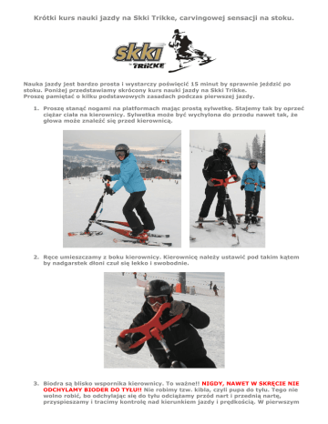 Krótki kurs nauki jazdy na Skki Trikke, carvingowej sensacji na stoku. Nauka jazdy jest bardzo prosta i wystarczy poświęcić 15 minut by sprawnie jeździć po stoku. Poniżej przedstawiamy skrócony kurs nauki jazdy na Skki Trikke. Proszę pamiętać o kilku podstawowych zasadach podczas pierwszej jazdy. 1. Proszę stanąć nogami na platformach mając prostą sylwetkę. Stajemy tak by oprzeć ciężar ciała na kierownicy. Sylwetka może być wychylona do przodu nawet tak, że głowa może znaleźć się przed kierownicą. 2. Ręce umieszczamy z boku kierownicy. Kierownicę należy ustawić pod takim kątem by nadgarstek dłoni czuł się lekko i swobodnie. 3. Biodra są blisko wspornika kierownicy. To ważne!! NIGDY, NAWET W SKRĘCIE NIE ODCHYLAMY BIODER DO TYŁU!! Nie robimy tzw. kibla, czyli pupa do tyłu. Tego nie wolno robić, bo odchylając się do tyłu odciążamy przód nart i przednią nartę, przyspieszamy i tracimy kontrolę nad kierunkiem jazdy i prędkością. W pierwszym dniu jazdy będzie już taka technika jazdy, że będziemy mogli robić wychylenie ciała do tyłu by widowiskowo przyspieszać w skręcie. Ale na początku biodra przy kierownicy! 4. Proszę pamiętać o kolejnej ważnej rzeczy: KIEROWNICA NIE SŁUŻY DO SKRĘCANIA!! Skręty wykonujemy balansem ciała. Poprzez kierownicę dociskamy krawędzie nart do stoku. Jedynie możemy kręcić kierownicą przy małej prędkości na płaskim stoku. 5. Nogi stawiamy na platformach, swobodnie, wygodnie, wysokie osoby dlaej, niskie osoby bliżej. Może pięta wystawać poza platformę. To jest dobra pozycja do dynamicznej jazdy. Nogi nigdy nie wypadają z platform, ich trzymanie jest pewne i bardzo bezpieczne. To wielka zaleta Skki, że każdy może sobie wygodnie umieścić nogi na platformach. Bez bólu stóp. 6. Podczas skrętu pracuje: dolna narta czyli zewnętrzna noga naciska na platformę i wewnętrzna ręka, którą utrzymujemy krawędź w skręcie. Po prostu wystarczy podczas skrętu oprzeć ciężar ciała na wewnętrznej ręce i Skki będzie sam skręcał i mocno trzymał krawędź. 7. Podczas pierwszej jazdy najpierw robimy trawers jedną stroną w poprzek stoku, opierając ciężar ciała na wewnętrznym ręku, zatrzymując się podjeżdżając pod stok. Później zmieniamy kierunek i jedziemy opierając ciężar ciała na drugim ręku. Pamiętając, by mieć biodra przy kierownicy. Można to kilka razy powtórzyć. 8. Skręt wykonuje się przerzucając ciężar ciała przez linię stoku, pamiętając o biodrach i jesteśmy wciąż z ciężarem ciała na kierownicy. Skki sam będzie skręcał! Podczas skrętu całe ciało kładzie się do stoku w stronę skrętu. Proszę zaufać krawędziom, Skki się nie położy na bok. 9. Później proszę poćwiczyć krótkie skręty jadąc w dół stoku z gwałtowniejszą zmianą kierunku. 10. Kolejnym, najważniejszym ale i ostatnim elementem nauki jazdy jest hamowanie. Polega ono na gwałtownym przechyleniu Skki na bok, z jednoczesnym mocnym naciskiem nogi na zewnętrzną platformę ( nartę ) i mocnym nacisku do stoku kierownicy poprzez ręce i obręcz barkową. Należy SKki „rzucić” i zmusić go do wbicia się w śnieg. Cała nauka jazdy nie zajmie więcej niż 15 minut. Później pozostaje nam cieszyć się jazdą, swobodą i wolnością na stoku. Tutaj jest film z całą nauką jazdy na Skki Trikke. To co wyżej opisaliśmy tutaj jest pokazane na żywo: Nauka jazdy – FILM INSTRUKTAŻOWY : https://www.youtube.com/watch?v=d_NyuhrlZhI Jazda na wyciągach-zdjęcia i opis Życzymy udanej zabawy. Trikke Poland Ul. Promienna 19/30 87-800 Włocławek POLAND Tel. 0048-54-236-62-64 Mobile. 0048-694-468-182 e-mail: [email protected] www.trikke.pl Facebook: Trikke Poland Forum Trikke: www.trikke.eev.pl GG 3046366 SKYPE: dziedzictomasz Facebook: Trikke Poland