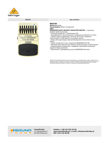 BEQ700 Opis produktu: BEQ700 Marka:Behringer Typ produktu: Efekty | Przełączniki Opis: BEHRINGER BASS GRAPHIC EQUALIZER BEQ700 - 7 pasmowy korektor graficzny do basu. • Eliminuje sprzężenia z 7-zakresowym EQ. • Zaprojektowany, aby konkurować z wiodącymi produktami na rynku. • Szeroki zakres częstotliwości od 50 Hz do 10 kHz z potężnym wzmocnieniem 15 dB boost/cut na każdym paśmie. • Diody LED sygnalizujące włączanie/wyłączanie oraz kontrola stanu baterii. • Działa na baterię 9 V lub z zasialczem BEHRINGER PSU-SB. • Wysokiej klasy elektroniczny włącznik on/off pracujący w trybie bypass. • Wysokiej jakości komponenty i wyjątkowo wytrzymała konstrukcja zapewnia długą żywotność. • Opracowany i zaprojektowany przez BEHRINGER Germany. UWAGA! Pomimo dołożenia wszelkich starań nie gwarantujemy, że umieszczone opisy, zdjęcia i podane ceny nie zawierają uchybień lub błędów. Nie mogą być one jednak podstawą do jakichkolwiek roszczeń. Informujemy też, że zestawienia towarów i cen podane na naszych stronach nie są ofertą w świetle przepisów kodeksu cywilnego. SoundTrade zastrzega sobie prawo do zmiany cen i opisów bez uprzedniego powiadomienia. SoundTrade ul. Kineskopowa 1 05-500 Piaseczno telefon: (+48 22) 632 02 85 www:soundtrade.pl | e-mail: [email protected] NIP: 678 120 08 88