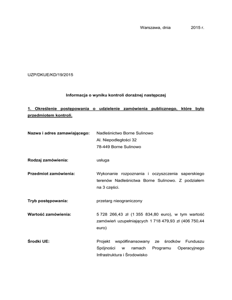 Warszawa, dnia 2015 r. UZP/DKUE/KD/19/2015 Informacja o wyniku kontroli doraźnej następczej 1. Określenie postępowania o udzielenie zamówienia publicznego, które było przedmiotem kontroli. Nazwa i adres zamawiającego: Nadleśnictwo Borne Sulinowo Al. Niepodległości 32 78-449 Borne Sulinowo Rodzaj zamówienia: usługa Przedmiot zamówienia: Wykonanie rozpoznania i oczyszczenia saperskiego terenów Nadleśnictwa Borne Sulinowo. Z podziałem na 3 części. Tryb postępowania: przetarg nieograniczony Wartość zamówienia: 5 728 266,43 zł (1 355 834,80 euro), w tym wartość zamówień uzupełniających 1 718 479,93 zł (406 750,44 euro) Środki UE: Projekt współfinansowany Spójności w ramach Infrastruktura i Środowisko ze środków Programu Funduszu Operacyjnego A. Opis i kwalifikacja prawna naruszeń 1. W rozdziale XII SIWZ „Kryteria oceny ofert oraz ich znaczenie oraz sposób oceny ofert” w pkt 5 określone zostało kryterium „Okres gwarancji jakości wykonania usługi” (mierzone ilością miesięcy). Ww. kryterium zostało doprecyzowane poprzez następujące podpunkty: a) Oferowany okres gwarancji Wykonawca wskaże w formularzu oferty (Zał. Nr 1 do SIWZ), b) Maksymalny okres gwarancji, jakie może zostać zaoferowany przez wykonawcę wynosi 84 miesiące. c) Minimalny okres gwarancji, jakie może zostać zaoferowany przez wykonawcę wynosi 60 miesięcy. d) Oferty Wykonawców, którzy zaoferowali okres gwarancji krótszy niż 60 miesięcy zostaną odrzucone jako niezgodne z treścią SIWZ. e) W przypadku ofert Wykonawców, którzy zaoferowali okres gwarancji dłuższy niż 84 miesiące, Zamawiający do ich oceny przyjmie, że Wykonawca zaoferował maksymalny dopuszczalny okres gwarancji, tj. 84 miesiące. f) Ocena punktowa oferty w tym kryterium zostanie przeprowadzona zgodnie z następującą formułą g) Jeżeli złożona oferta w danym kryterium jest najmniej korzystną lub równa się ofercie najmniej korzystniej – otrzymuje ona 0 pkt. h) Jeżeli oferta jest najkorzystniejsza lub równa ofercie najkorzystniejszej – otrzymuje maksymalną liczbę punktów – równą wadze kryterium, tj. 5 pkt. i) Jeżeli wszystkie oferty są równe – wszystkie otrzymują maksymalną liczbę punktów równą wadze kryterium, tj. 5 pkt. j) Jeżeli złożona oferta jest ofertą pośrednią (pomiędzy ofertą najmniej korzystną, a najkorzystniejszą) – jej wartość punktowa obliczana jest w następujący sposób: G= Gobliczana – Gmin Gmax – Gmin x 5% x 100 pkt gdzie: Gobliczana – okres gwarancji zaoferowany przez Wykonawcę, Gmax – najdłuższy okres gwarancji spośród złożonych ofert (będzie to oferta najkorzystniejsza w tym kryterium), Gmin – najkrótszy okres gwarancji spośród złożonych ofert (będzie to oferta najmniej korzystna w tym kryterium). 2 Przyjmuje się, że 1% = 1 pkt i tak zostanie przeliczona liczba punktów w kryterium oceny ofert. Z treści formularza ofertowego, jak i istotnych postanowień wzoru umowy stanowiącego załącznik nr 11 do SIWZ w rozdziale XI § 18 „Gwarancja jakości” należy wnosić, że zobowiązanie z tytułu gwarancji stanowić miało istotny element umowy określającej wzajemne prawa i obowiązki stron. W formularzu ofertowym złożonym przez wykonawcę G., na stronie drugiej znajdował się między innymi zapis: „Oferujemy gwarancję jakości wykonania usługi na okres ….. miesięcy liczonych od daty odbioru prac (tj. podpisania końcowego protokołu odbioru prac)”. Mając na uwadze powyższe należy stwierdzić, że wykonawca składający ofertę pominął istotny element w postaci deklarowanego okresu gwarancji, który zgodnie z oczekiwaniem zamawiającego powinien wynosi co najmniej 60 miesięcy. Do decyzji wykonawcy pozostawiono wskazanie takiego okresu, które to wskazanie bez wątpienia jest elementem oświadczenia woli wykonawcy zawartym w ofercie. Dodatkowo należy zauważyć, że z całej treści dokumentacji ofertowej nie można wywnioskować, jaki okres gwarancji oferuje wykonawca w ramach umowy, którą zamierza zawrzeć. Zgodnie z art. 89 ust. 1 pkt 2 ustawy Pzp zamawiający odrzuca ofertę, jeżeli jej treść nie odpowiada treści specyfikacji istotnych warunków zamówienia, z zastrzeżeniem art. 87 ust. 2 pkt 3 ustawy Pzp. Reasumując należy stwierdzić, iż wykonawca poprzez brak wskazania okresu gwarancji de facto nie udzielił tejże gwarancji jakości wykonania usługi. Tym samym poprzez brak dokonania czynności odrzucenia ww. oferty jako niezgodnej z SIWZ zamawiający dopuścił się naruszenia art. 89 ust. 1 pkt 2 ustawy Pzp. 2. Jak wynika z dokumentacji postępowania, przedmiotem niniejszego postępowania było wykonanie rozpoznania i oczyszczenia saperskiego terenów Nadleśnictwa Borne Sulinowo. Warunkiem udziału w postępowaniu, jakiego wymagał zamawiający było należyte wykonanie „usługi na powierzchni łącznej, co najmniej 70 ha w zakresie oczyszczania terenu z przedmiotów wybuchowych, polegających na ich wykryciu, usunięciu i zniszczeniu. Co najmniej jedna usługa winna być wykonana na powierzchni minimum 20 ha”. W celu potwierdzenia spełniania warunku udziału w postępowaniu, wykonawca złożył formularz: „Wykaz głównych usług”, w którym oświadczył, iż w okresie od kwietnia do czerwca 2014 r. dokonał „rozpoznania i oczyszczania saperskiego terenu z przedmiotów wybuchowych o pow. 157,47 ha dla zamawiającego RDLP w Poznaniu”. 3 Dla potwierdzenia powyższego oświadczenia, wykonawca załączył referencje z dnia 30 czerwca 2014 r. wystawione przez RDLP w Poznaniu, z których wynika, że „firma G. (…), jest firmą, która wykonywała usługi z zakresu rozpoznania i oczyszczenia saperskiego terenu w ramach dotacji unijnej – projektu „Rekultywacja na cele przyrodnicze (…)”. Oczyszczanie zostało przeprowadzone w okresie kwiecień-czerwiec 2014 r. i objęło nadleśnictwa nadzorowane przez Regionalną Dyrekcję Lasów Państwowych w
