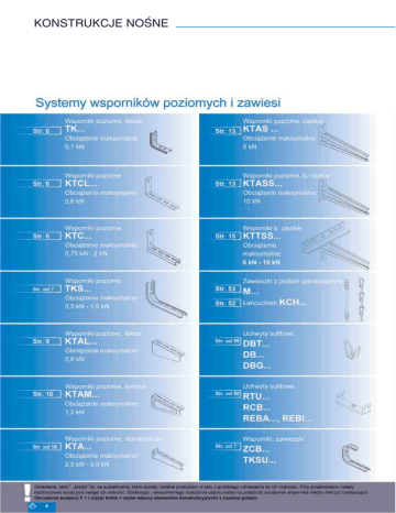 KONSTRUKCJE NOŚNE 4 5 KONSTRUKCJE NOŚNE Wspornik poziomy Nr art. S S Wys. Obc. F L przy L/2 H mm mm kN TK 60.85 60 TK 85.110 85 85 110 0,1 0,1 na 100 szt. kg EAN 1 FLM 6x12 183708 1 FLM 6x12 183807 Opak. VPE str. 364 20 szt. 20 szt. 5 6,5 do montażu ściennego Wartości obciążeń dopuszczczalnych obowiązują przy prawidłowym zakotwieniu elementów w podłożu. Wspornik poziomy lekki Nr art. F F Wys. Obc. F przy L/2 L H mm mm kN KTCL 100 106 KTCL 200 106 110 210 0,6 0,6 EAN 2 FLM 6x16 F 904808 2 FLM 6x16 F 904822 na 100 szt. kg 25 54 Opak. VPE str. 364 20 szt. 20 szt. do montażu ściennego i sufitowego Wartości obciążeń dopuszczczalnych obowiązują przy prawidłowym zakotwieniu elementów w podłożu. Wspornik poziomy standardowy F F F F Nr art. Wys. Obc. F H przy L/2 mm kN KTC 100 KTC 200 KTC 300 KTC 400 114 114 114 114 0,75 0,75 0,75 0,75 EAN na 100 szt. kg 2 FLM 6x16 F 2 FLM 6x16 F 2 FLM 6x16 F 2 FLM 6x16 F 859801 859825 859849 859863 52 58 75 91 Opak. VPE str. 364 20 szt. 20 szt. 20 szt. 20 szt. do zamontowania korytka kablowego w ograniczonej przestrzeni montażu Wartości obciążeń dopuszczczalnych obowiązują przy prawidłowym zakotwieniu elementów w podłożu. Wspornik poziomy standardowy Nr art. F F Wys. Obc. F H przy L/2 mm kN KTC 500 155 KTC 600 155 2 2 EAN 2 FLM 6x16 F 859887 2 FLM 6x16 F 859900 na 100 szt. kg 190 218 Opak. VPE 6 szt. 6 szt. do zamontowania korytka kablowego w ograniczonej przestrzeni montażu Wartości obciążeń dopuszczczalnych obowiązują przy prawidłowym zakotwieniu elementów w podłożu. 6 str. 364 Zawieszka centralna uchwyt C Nr art. F F F F F F F F ZCB 70 ZCB 100 ZCB 120 ZCB 150 ZCB 200 ZCB 250 ZCB 300 ZCB 400 Wys. Obc. F H L przy L/2 mm mm kN 70 85 95 110 135 160 185 235 74 104 124 154 204 254 304 404 0,6 0,6 0,6 0,6 0,6 0,6 0,6 0,2 EAN na 100 szt. kg 843008 843022 843046 843060 843084 843107 843121 860401 53 54 60 66 78 90 102 151 str. 364 str. 370 Opak. VPE 10 szt. 10 szt. 10 szt. 10 szt. 10 szt. 10 szt. 10 szt. 10 szt. do montażu sufitowego za pomocą pręta gwintowanego M10 Wartości obciążeń dopuszczczalnych obowiązują przy prawidłowym zakotwieniu elementów w podłożu. Wspornik poziomy/pionowy Nr art. Wys. Obc. F przy L/2 L H mm mm kN EAN na 100 szt. kg Opak. VPE S S S S S S S TKS 100 TKS 150 TKS 200 TKS 250 TKS 300 TKS 350 TKS 400 132 132 132 132 132 132 132 163 213 263 313 363 413 463 1,5 1,2 1,1 0,9 0,75 0,6 0,5 2 FLM 6x12 2 FLM 6x12 2 FLM 6x12 2 FLM 6x12 2 FLM 6x12 2 FLM 6x12 2 FLM 6x12 183906 184002 184101 184200 184309 184408 184507 27 30 39 46 53 59 65 20 szt. 20 szt. 20 szt. 20 szt. 20 szt. 20 szt. 20 szt. E3 E3 E3 E3 TKS 100 E3 TKS 200 E3 TKS 300 E3 TKS 400 E3 132 132 132 132 163 263 363 463 1,5 1,1 0,75 0,5 2 FLM 6x12 E3 2 FLM 6x12 E3 2 FLM 6x12 E3 2 FLM 6x12 E3 329106 329205 329304 329328 31 43 55 68 20 szt. 20 szt. 20 szt. 20 szt. str. 364 do montażu jako wspornik poziomy na ścianie lub jako wspornik pionowy na suficie Ze względów statycznych przy montażu wspornika na ścianie i suficie należy zastosować profil dystansujący TKSD 20. Uniemożliwia on zdeformowania profila trapezowego przy dokręcaniu śruby mocującej. Wartości obciążeń dopuszczczalnych obowiązują przy prawidłowym zakotwieniu elementów w podłożu. 7 KONSTRUKCJE NOŚNE Wspornik pionowy Nr art. Wys. L H mm mm 132 132 132 513 563 663 E3 TKS 500 E3 132 E3 TKS 600 E3 132 563 663 S S S TKS 450 TKS 500 TKS 600 EAN 2 FLM 6x12 184606 184705 184804 - 329342 329366 na 100 szt. kg Opak. VPE 72 77 90 10 szt. 10 szt. 10 szt. 80 92 10 szt. 10 szt. do montażu jako wspornik pionowy na suficie Aby umożliwić bezproblemowe założenie nasadek ochronnych, wspornik poziomy powinien być zamontowany w odległości X=50 mm powyżej końca wspornika pionowego. Ze względów statycznych przy montażu wspornika na ścianie i suficie należy zastosować profil dystansujący TKSD 20. Uniemożliwia on zdeformowania profila trapezowego przy dokręcaniu śruby mocującej. Element dystansujący EAN na 100 szt. kg 185207 4 50 szt. E3 TKSD 20 E3 329649 3 50 szt. Nr art. S TKSD 20 Opak. VPE do wypełnienia przetłoczenia w systemie TKS przy montażu wspornika sufitowego i ściennego Zastosowanie: do wsporników TKS... oraz TKSU... 1. Montaż ścienny i sufitowy. 2. Dwustronnie w wspornikach pionowych. 3. Mocowanie sufitowe i do mocowania wspornika poziomego (wykonanie wyłącznie jako ocynkowane metodą Sendzimira). Śruby SKM... należy zamawiać osobno. 8 str. 364 Wspornik poziomy Nr art. S S S Wys. Obc. F przy L/2 L H mm mm kN TKSU 100 172 TKSU 200 172 TKSU 300 172 161 261 361 0,95 0,7 0,5 EAN 2 FLM 6x12 184903 2 FLM 6x12 185009 2 FLM 6x12 185108 na 100 szt. kg 55 70 85 Opak. VPE str. 364 20 szt. 20 szt. 20 szt. do montażu ściennego i sufitowego Ze względów statycznych przy montażu wspornika na ścianie i suficie należy zastosować profil dystansujący TKSD 20. Uniemożliwia on zdeformowania profila trapezowego przy dokręcaniu śruby mocującej. Wartości obciążeń dopuszczczalnych obowiązują przy prawidłowym zakotwieniu elementów w podłożu. Wspornik poziomy do półek pośrednich Nr art. S S Wys. Obc. F H L przy L/2 mm mm kN TKR 50 132 TKR 100 132 113 163 0,55 0,55 EAN 1 FLM 6x12 185306 2 FLM 6x12 185405 na 100 szt. kg 20 27 Opak. VPE 20 szt. 20 szt. do montażu na rurach, średnica podpory: 26 - 47 mm Zawiera w komplecie uchwyt zaciskowy, śrubę wg DIN 933, ocynkowane galwanicznie. Wartości obciążeń dopuszczczalnych obowiązują przy prawidłowym zakotwieniu elementów w podłożu. Nasadka ochronna Nr art. Kolor na 100 szt. kg EAN K10 TKSK 30 żółty 348053 Opak. VPE str. 365 str. 366 10 szt. 2 do zamocowania na końcu wspornika Zastosowanie: zabezpieczenie ostrych krawędzi Zastosowanie: do wsporników TKS... oraz TKSU... Aby umożliwić bezproblemowe założenie nasadek ochronnych, wspornik poziomy powinien być zamontowany w odległości X=50 mm powyżej końca wspornika pionowego. Wspornik poziomy lekki Nr art. S S S S S KTAL